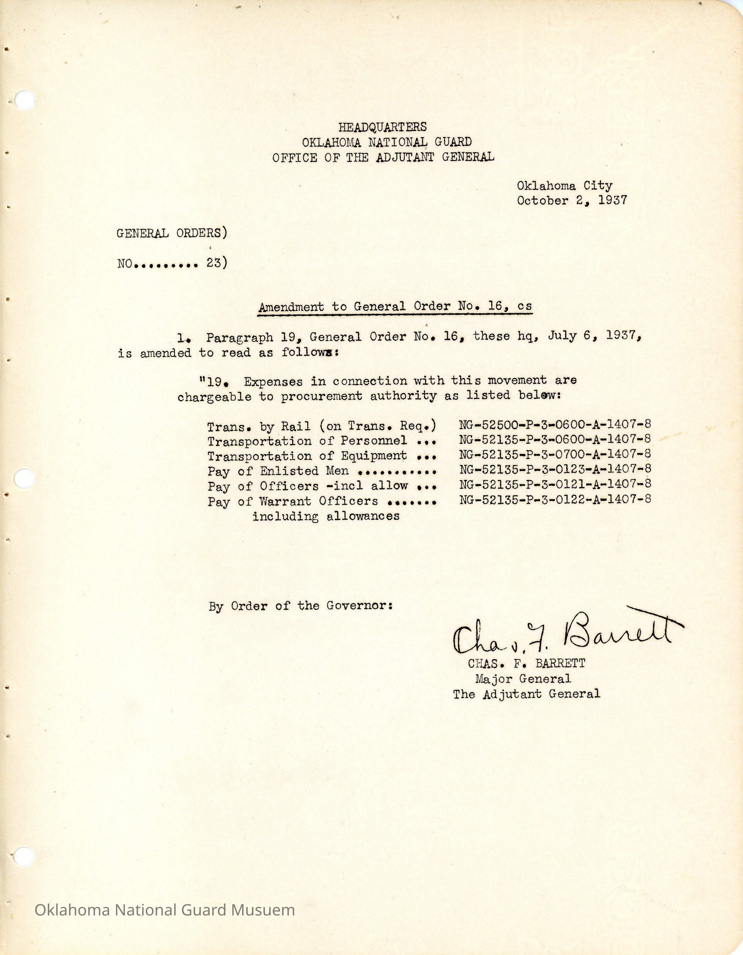 General Order #23 from Headquarters Adjutant General's Office in Oklahoma City. The order makes amendments to General Order #16 1937Date(s) of Creation