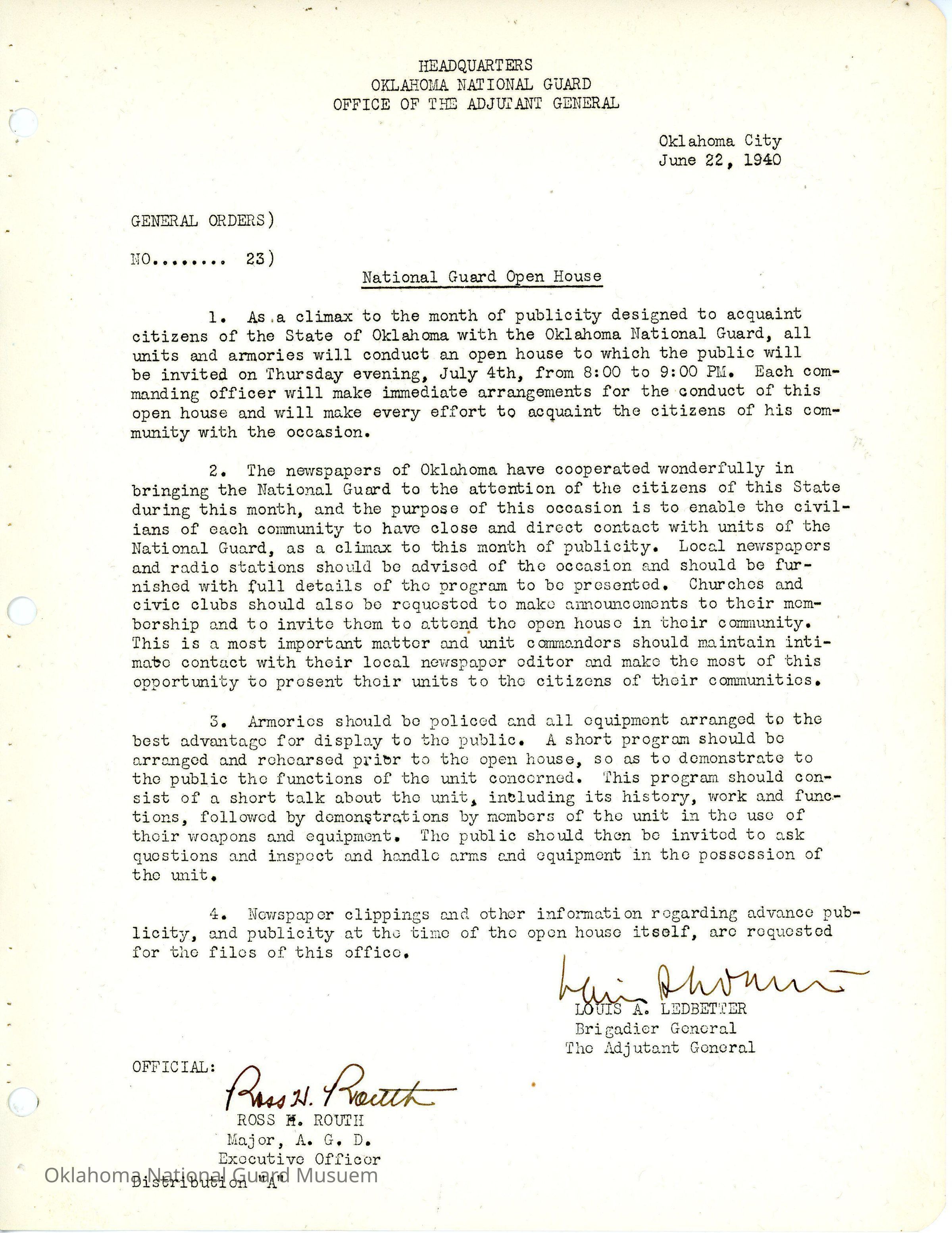 General Order #23 from Headquarters Adjutant General's Office in Oklahoma City. The order permits an open house to the general public as the closer to a month of publicity by the National Guard to the citizens of Oklahoma.Date(s) of Creation