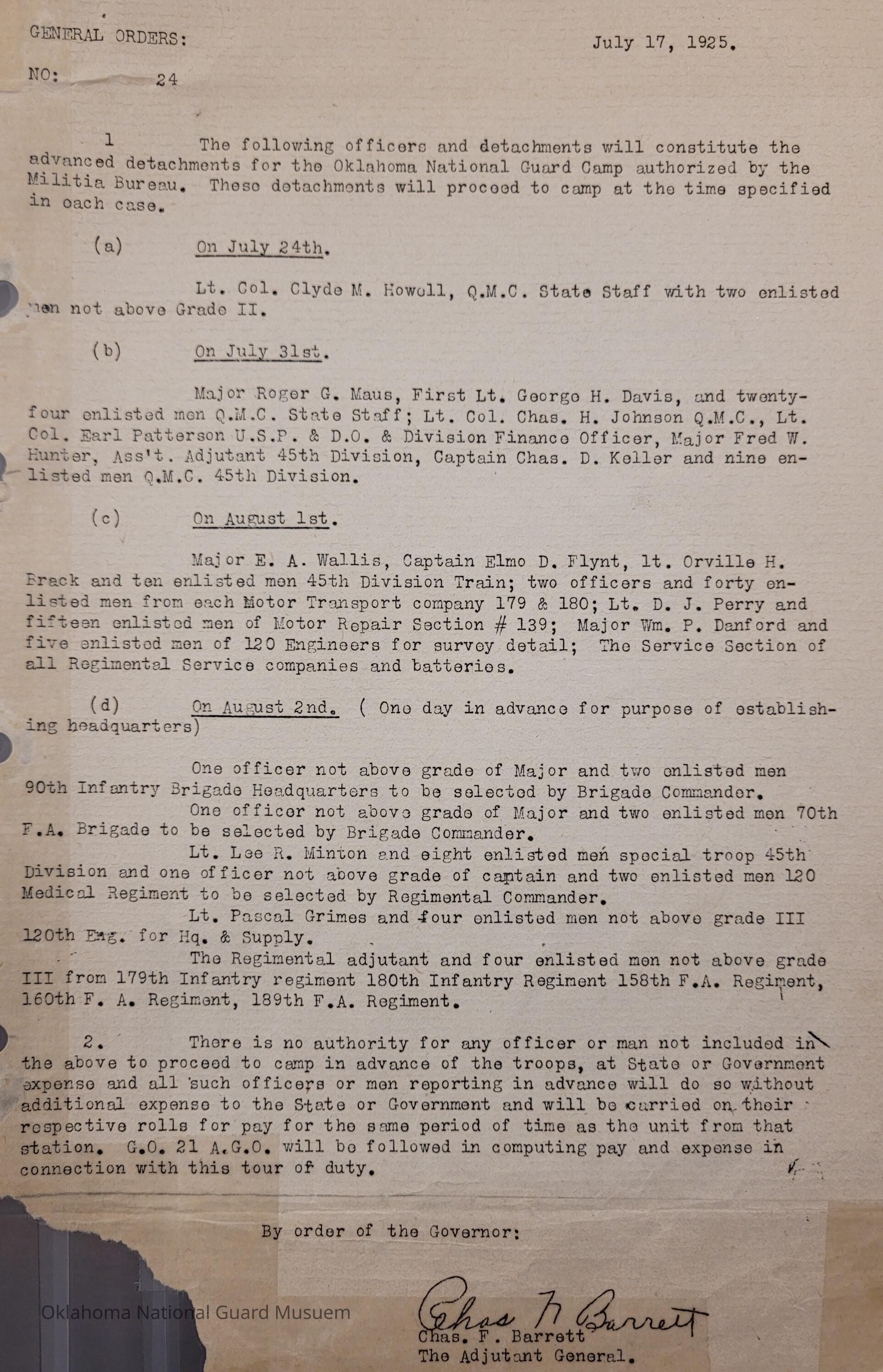 General Order #24 from Headquarters Adjutant General's Office in Oklahoma City. The order details the officers and detachments that will arrive to Fort Sill early to establish camp prior to the arrival of the rest of the Oklahoma National GuardDate(s) of Creation
