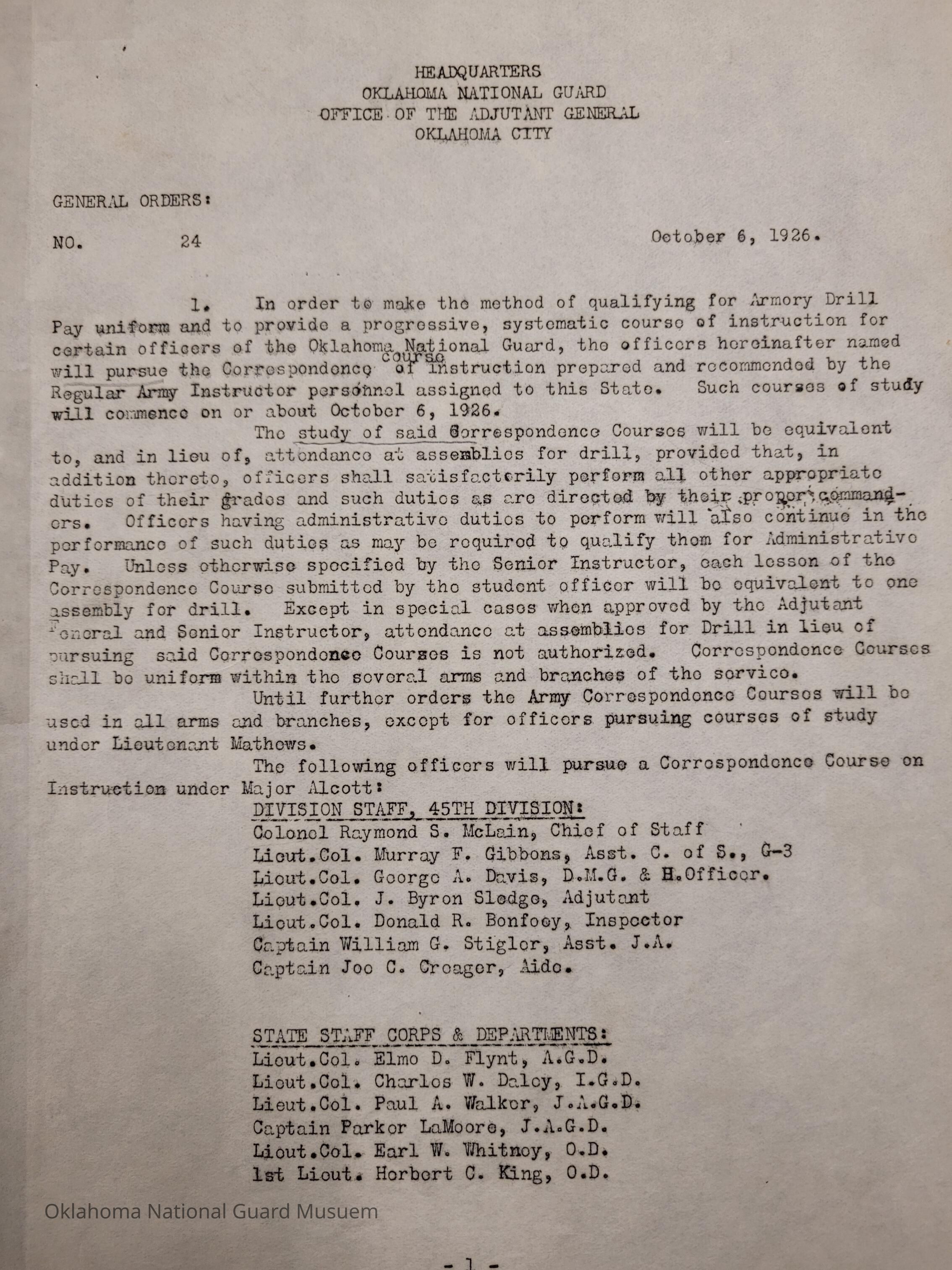 General Order #24 from Headquarters Adjutant General's Office in Oklahoma City. The order details the officers required to take a Correspondence Course to make the method for qualifying fro Armory Drill Pay uniform and to provide progressive, systematic course of instructionDate(s) of Creation