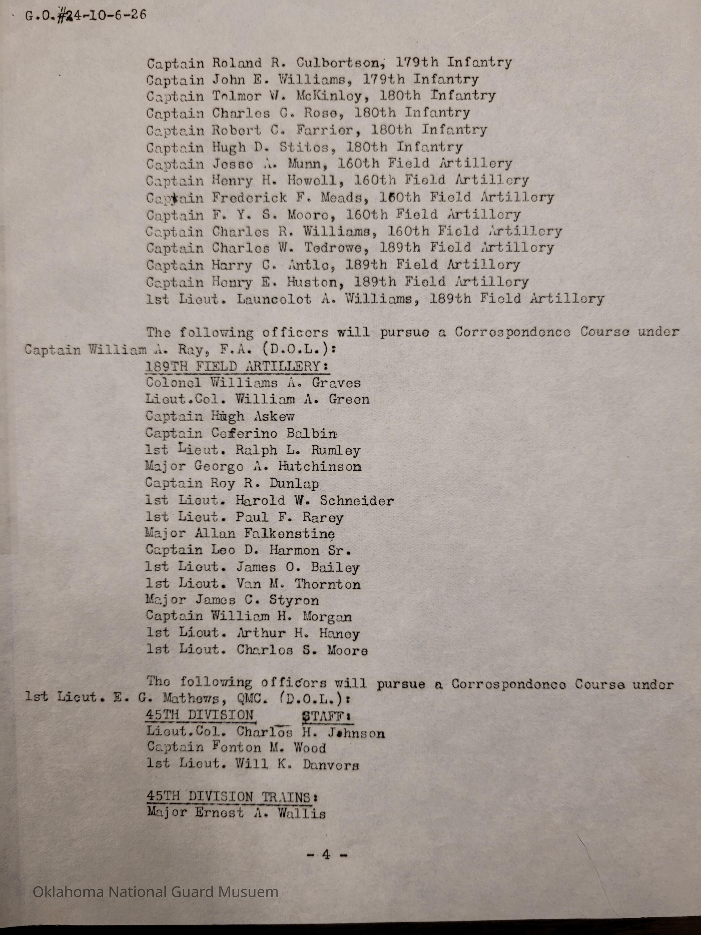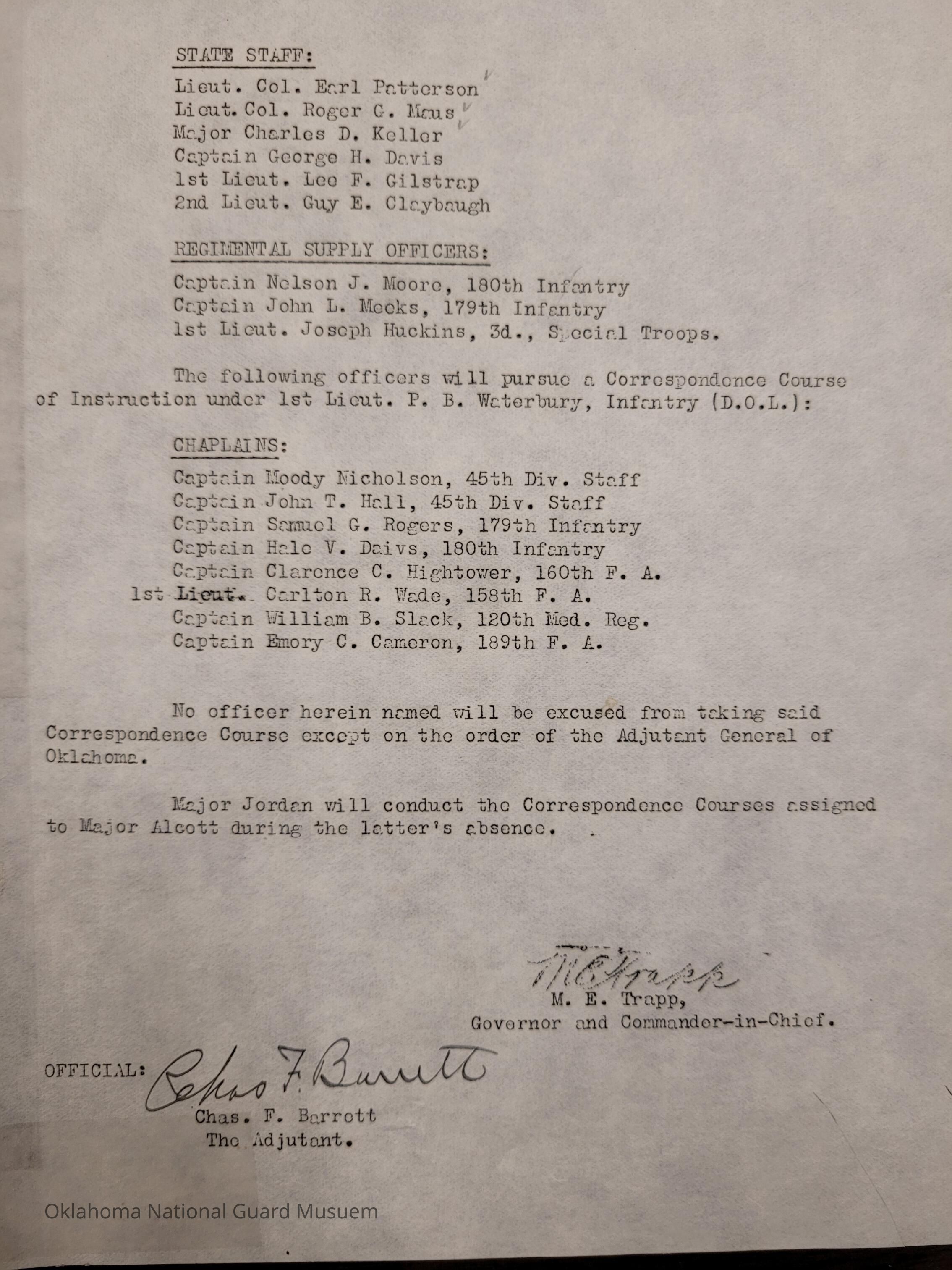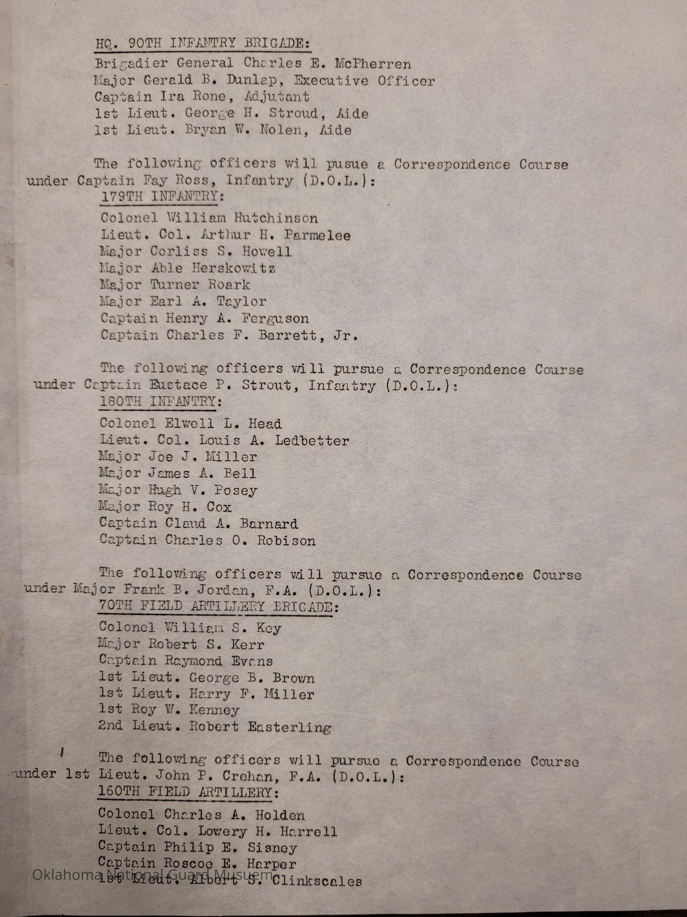Adjutant General, Oklahoma City, Charles F. Barrett, Martin E. Trapp, Correspondence Course, Armory Drill Pay, 45th Division, Raymond S. McLain, Murray F. Gibbons, George A. Davis, J. Byron Sledge, Donald R. Bonfoey, William G. Stigler, Joe C. Creager, Elmo D. Flynt, Charles W. Daley, Paul A. Walker, Parker LaMoore, Earl W. Whitney, Herbert C. King, 90th Infantry Brigade, Charles E. McPherren, Gerald B. Dunlap, Ira Rone, George H. Stroud, Bryan W. Nolen, Fay Ross, 179th Infantry, William Hutchinson, Arthur H. Parmelee, Corliss S. Howell, Able Herskowitz, Turner Roark, Earl A. Taylor, Henry A. Ferguson, Charles F. Barrett Jr., Eustace P. Strout, 180th Infantry, Elwell L. Head, Louis A. Ledbetter, Joe J. Miller, James A. Bell, Hugh V. Posey, Roy H. Cox, Claud A. Barnard, Charles O. Robison, Frank B. Jordan, 70th Field Artillery, William S. Key, Robert S. Kerr, Raymond Evans, George B. Brown, Harry F. Miller, Roy W. Kenney, Robert Easterling, John P. Crehan, 160th Field Artillery, Charles A. Holden, Lowery H. Harrell, Phillip E. Sisney, Roscoe E. Harper, Albert S. Clinkscales, John J. McCartney, Cabell C. Cornish, William T. Cameron, Barney H. McKellop, John P. Kennedy, Clarence L. Tylee, John L. Holbrook, Bernald R. Stubbs, John W. Beck, 158th Field Artillery, Grover C. Wamsley, John D. Brown, Edgar B. Ross, Jesse H. Long, James F. Cussen, Otis M. Smith, Sidney P. Kretlow, Owen Black, A.J. Rawlings, P.B. Waterbury, Special Troops, Harry B. Gilstrap, Harvey Lee Minton, 120th Engineers, William P. Danford, Paschal Grimes, Benjamin J. Marshall, 120th Medical Regiment, Floyd J. Bolend, Rex Bolend, Harry H. Cloudman, William C. McConnell, William S. Williams, John H. Carey, Henry H. Turner, Leo F. Cailey, Henry C. Ricks, Austin L. Guthrie, Russell J. Shull, Ray L. Murdoch, Parkey H. Anderson, Roland R. Culbertson, John E. Williams, Tolmer W. McKinley, Charles C. Rose, Robert C. Farrier, Hugh D. Stites, Jesse A. Munn, Henry H. Howell, Frederick F. Meads, F.Y.S. Moore, 189th Field Artillery, Charles R. Williams, Charles W. Tedrowe, Harry C. Antle, Henry E. Huston, Launcelot A. Williams, William A. Ray, Williams A. Graves, William A. Green, Hugh Askew, Ceferino Balbin, Ralph L. Rumley, George A. Hutchinson, Roy R. Dunlap, Harold W. Schneider, Paul F. Rarey, Allan Falkenstine, Leo D. Harmon Sr., James O. Bailey, Van M. Thornton, James C. Styron, William H. Morgan, Arthur H. Haney, Charles S. Moore, E.G. Mathews, Charles H. Johnson, Fenton M. Wood, Will K. Danvers, 45th Division Trains, Ernest A. Wallis, Earl Patterson, Roger G. Maus, Charles D. Keller, George H. Davis, Lee F. Gilstrap, Guy E. Claybaugh, Nelson J. Moore, John L. Meeks, Joseph Huckins, P.B. Waterbury, Chaplains, Moody Nicholson, John T. Hall, Samuel G. Rogers, Hale V. Davis, Clarence G. Hightower, Carlton R. Wade, William B. Slack, Emory C. Cameron