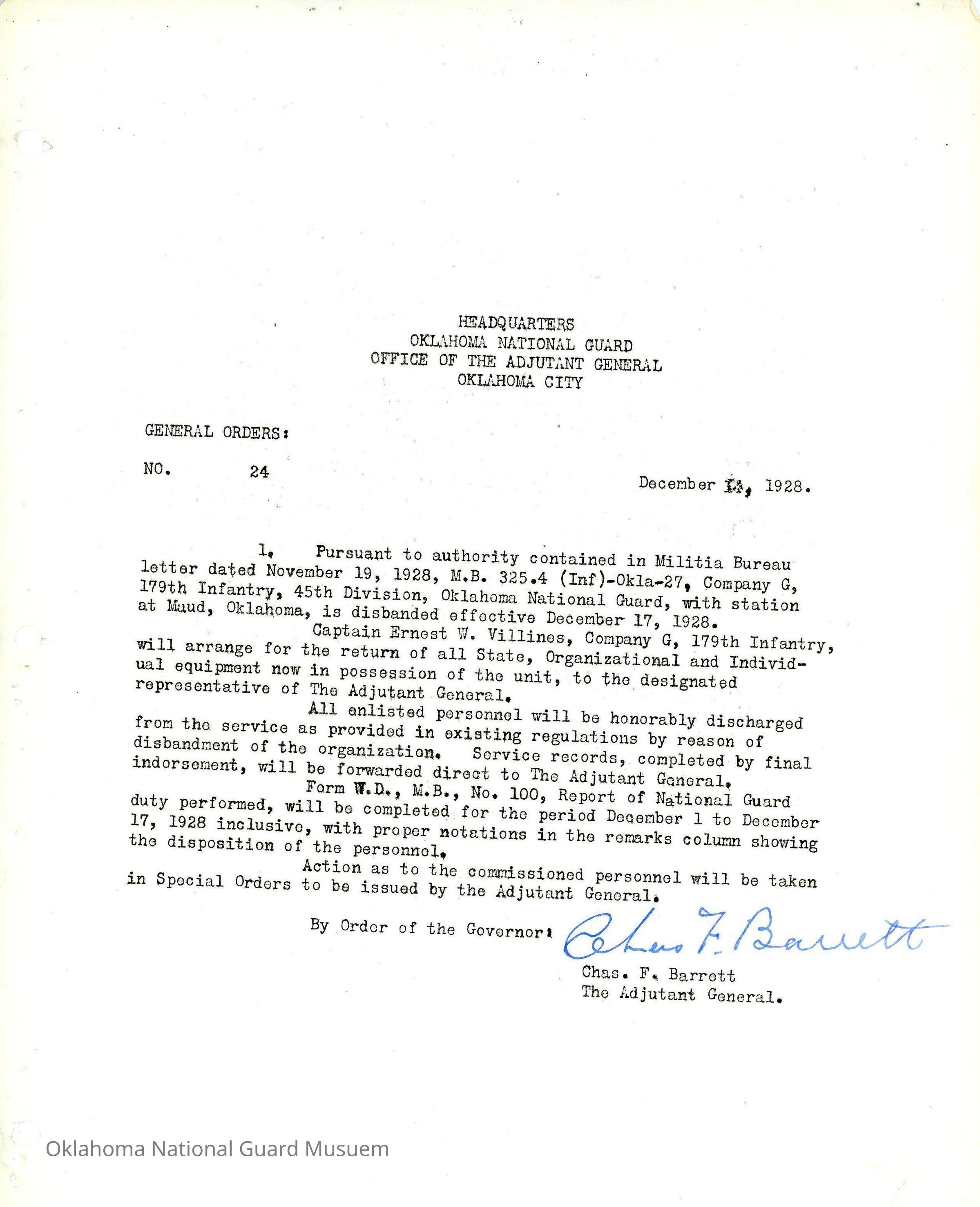 General Order #24 from Headquarters Adjutant General's Office in Oklahoma City. The order disbands Company G 179th Infantry 45th Division stationed in Maud.Date(s) of Creation
