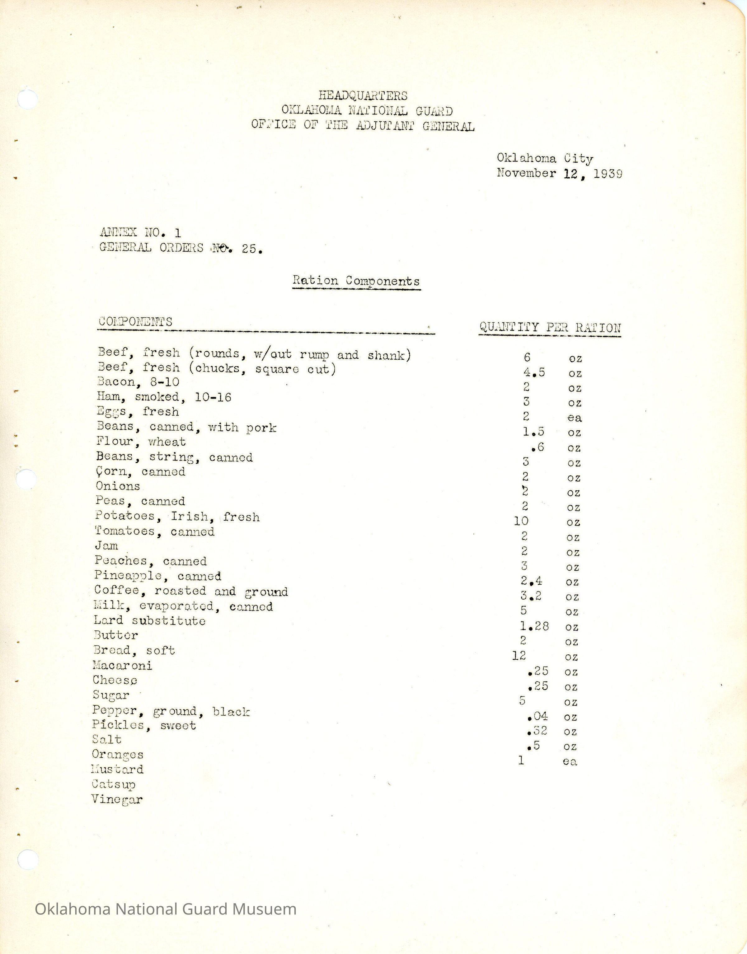 General Order #25 Annex 1 from Headquarters Adjutant General's Office in Oklahoma City. The order details the rations and quantity for the field trainingDate(s) of Creation