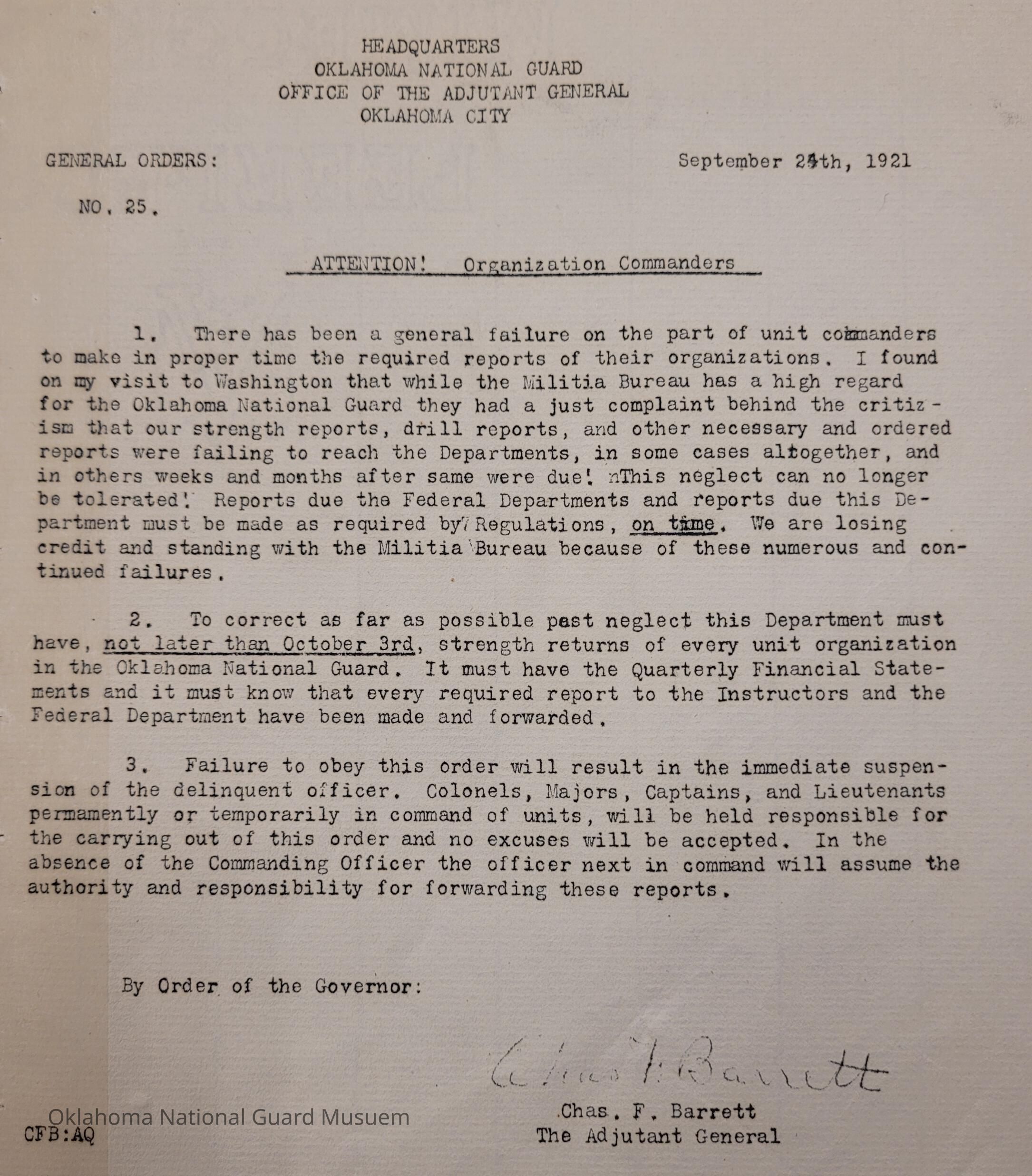 General Order #25 from Headquarters Adjutant General's Office in Oklahoma City. The order requires all reports due to Federal Departments be filed on time. The Oklahoma National Guard has been filing reports very late or not at all in some cases.Date(s) of Creation