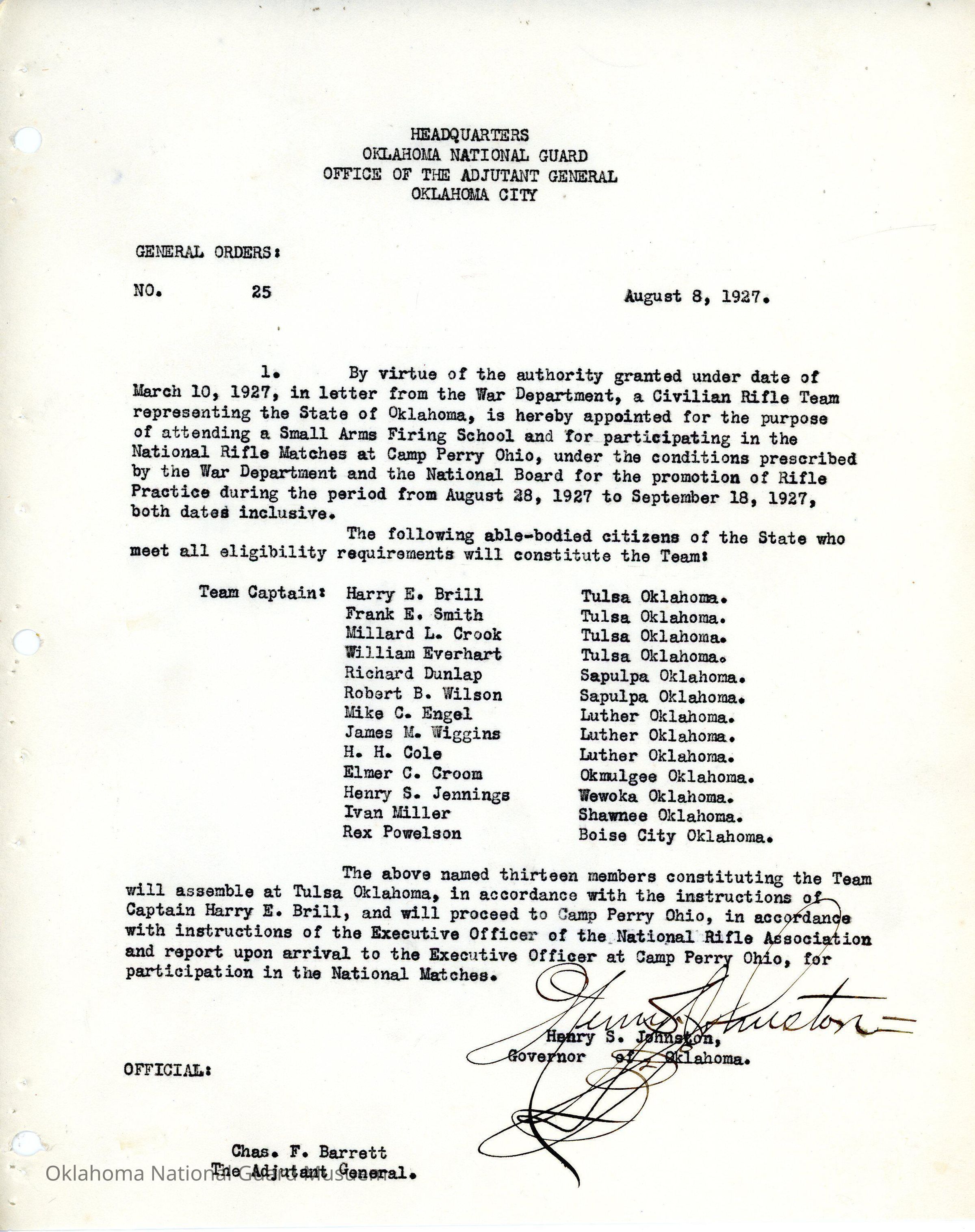 General Order #25 from Headquarters Adjutant General's Office in Oklahoma City. The order details the members of the Civilian Rifle Team representing Oklahoma at Camp Perry, Ohio.Date(s) of Creation