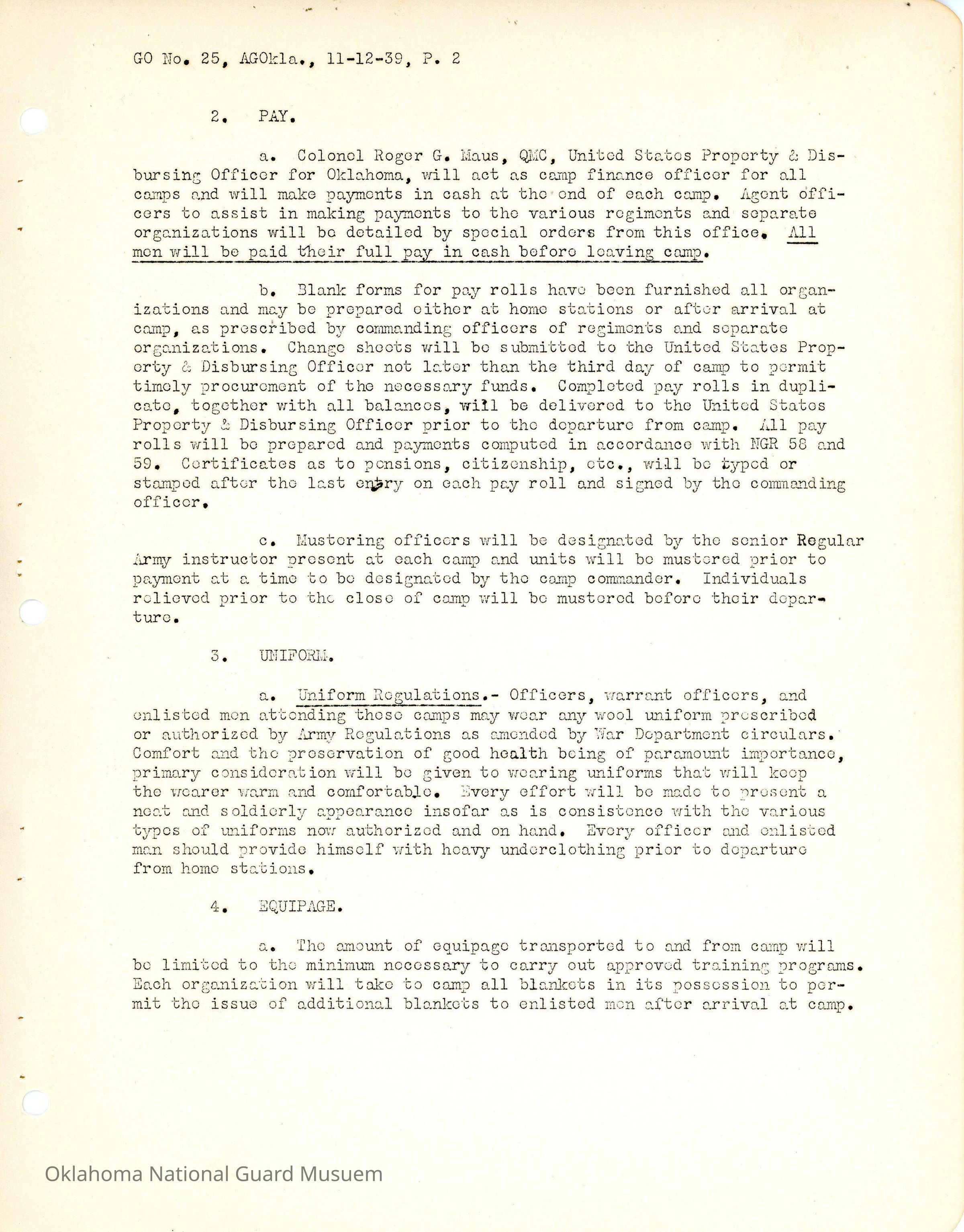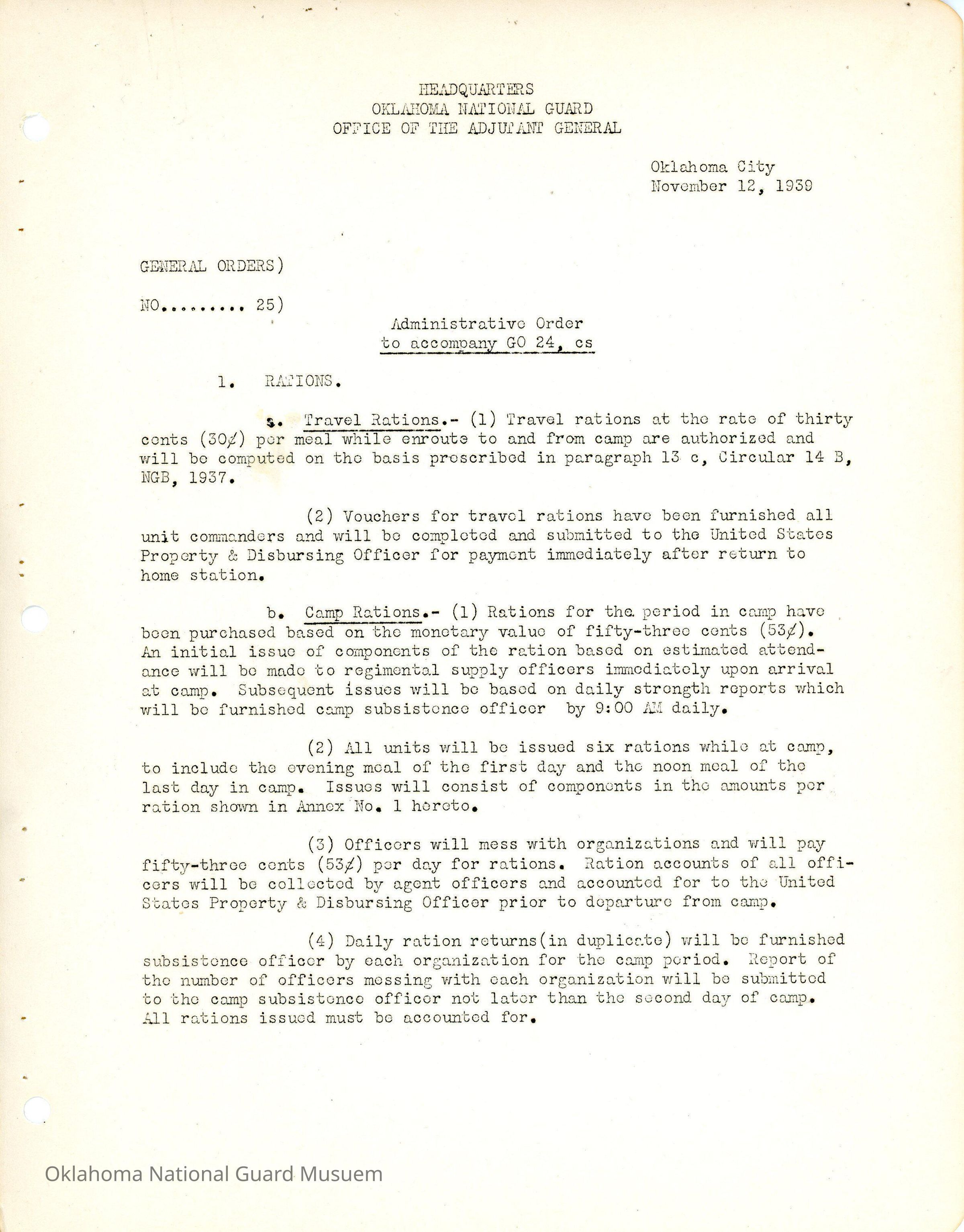 General Order #25 from Headquarters Adjutant General's Office in Oklahoma City. The order accompanies General Order #24 1939. It details the rations, pay, uniform requirements, and equipment needed for the additional field trainingDate(s) of Creation