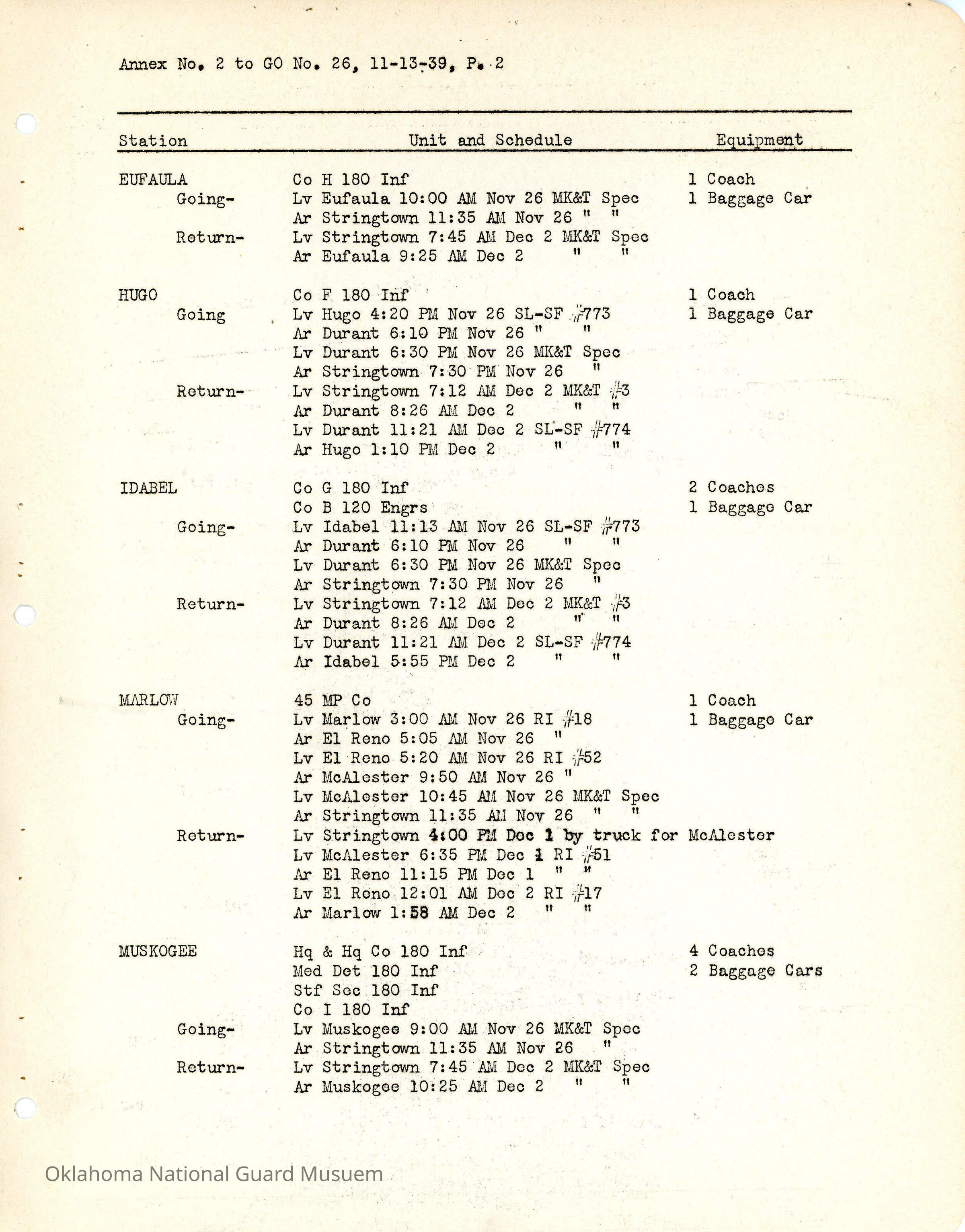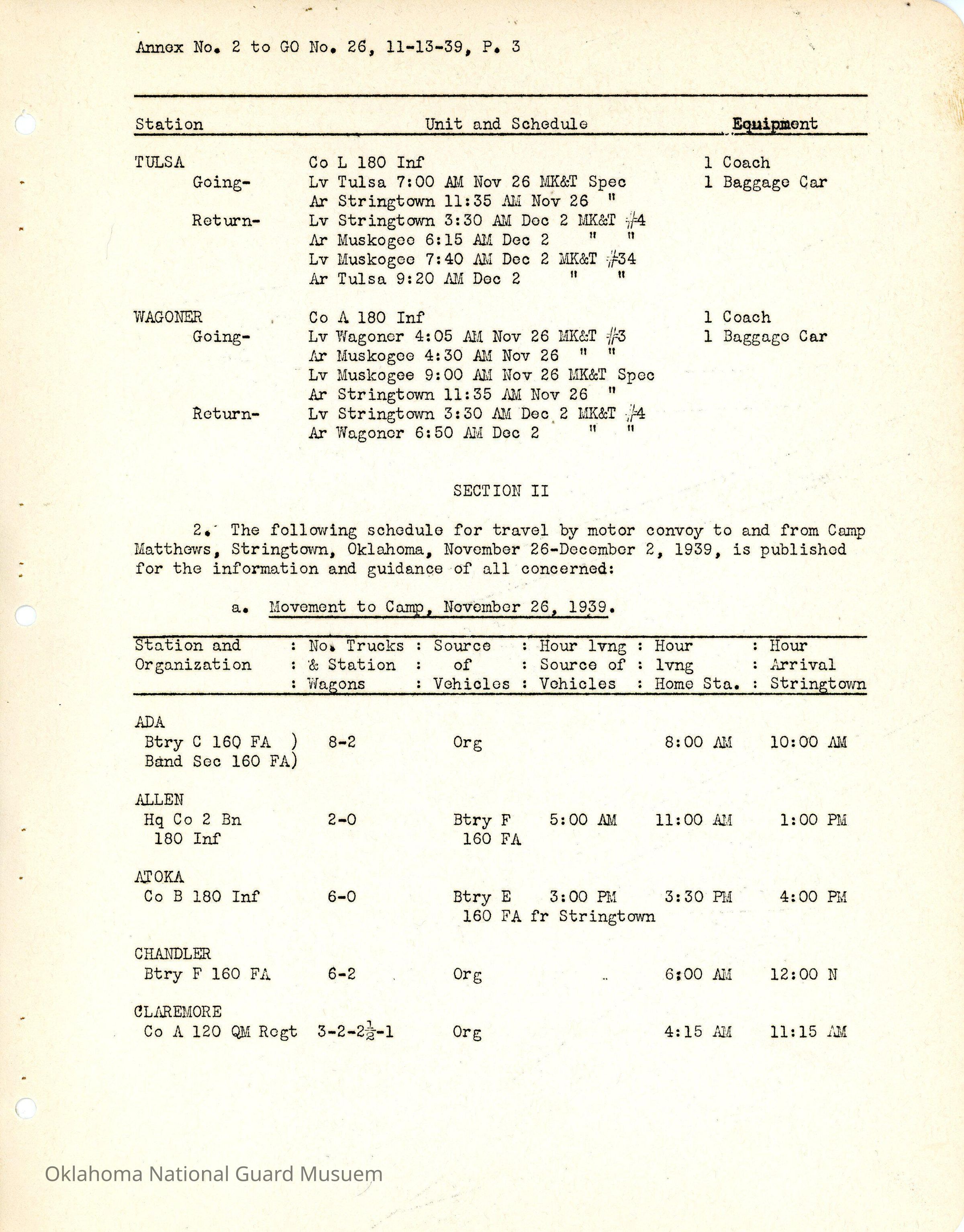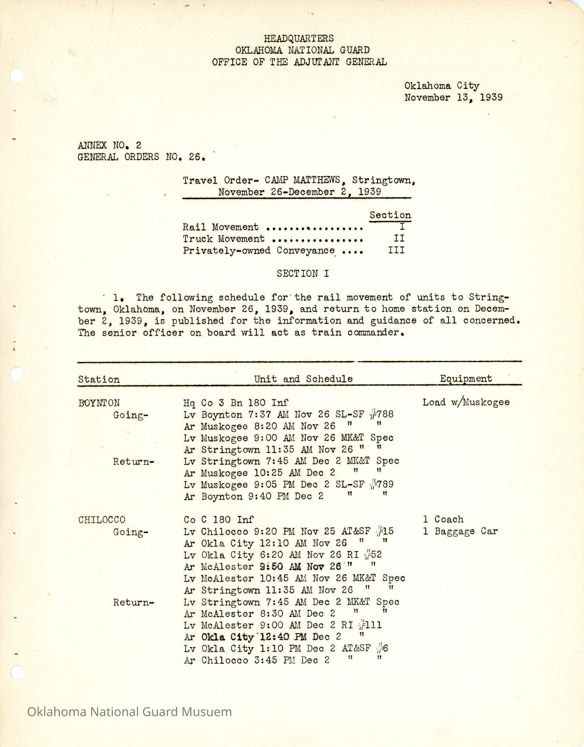 General Order #26 Annex 2 from Headquarters Adjutant General's Office in Oklahoma City. The order details the schedule from home stations to Camp Matthews for additional field training.Date(s) of Creation