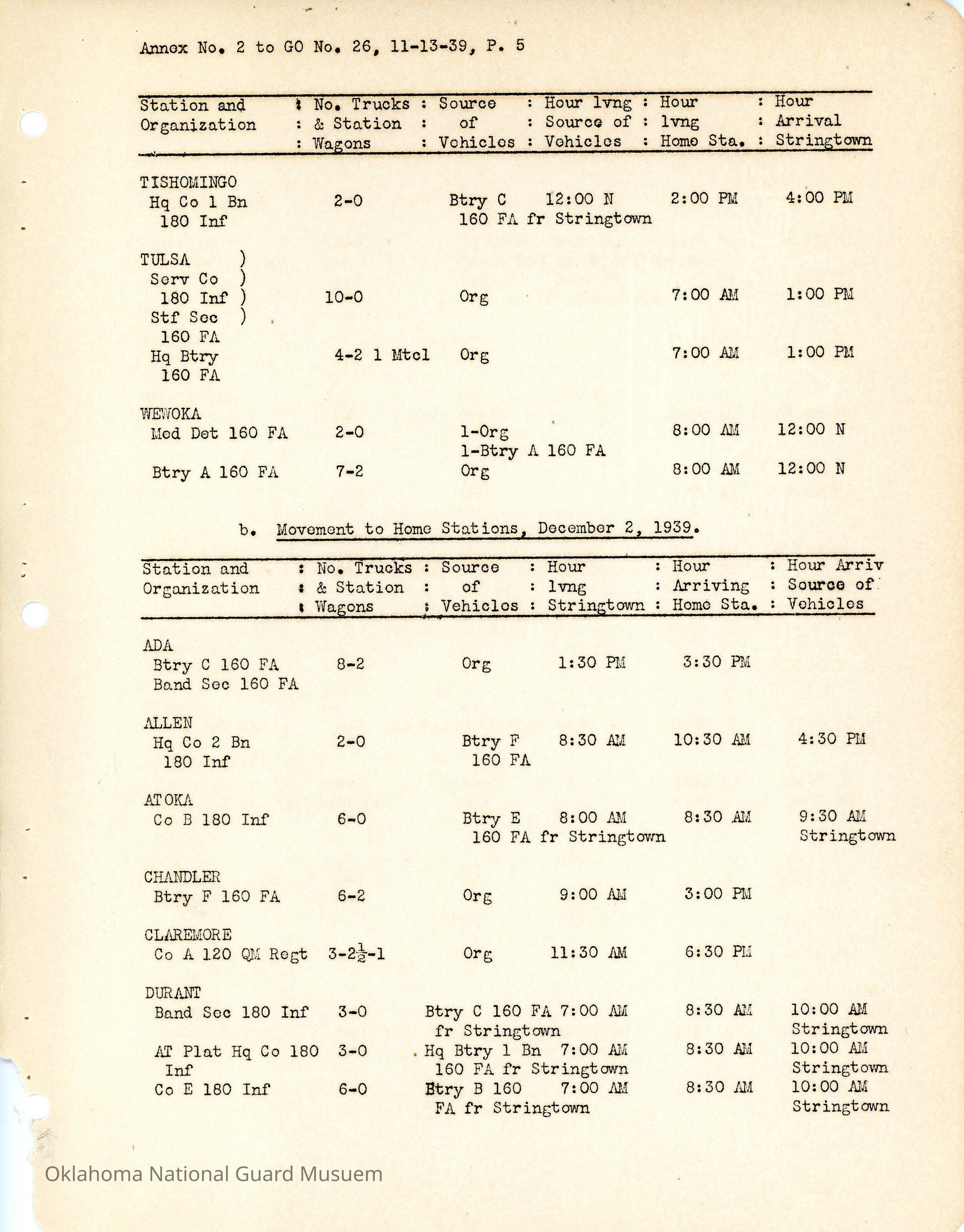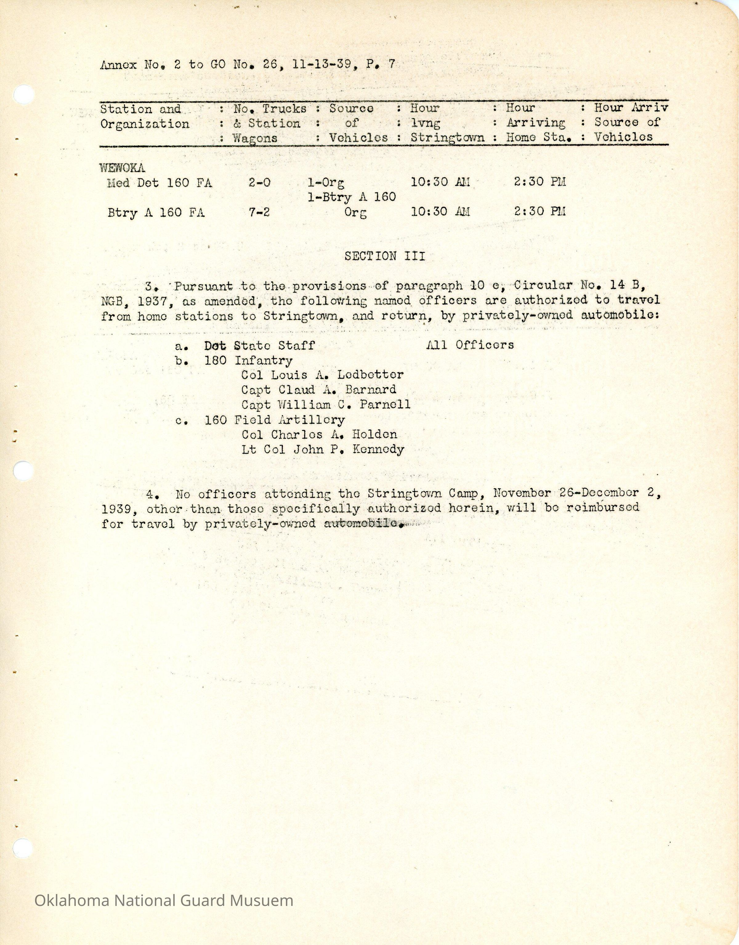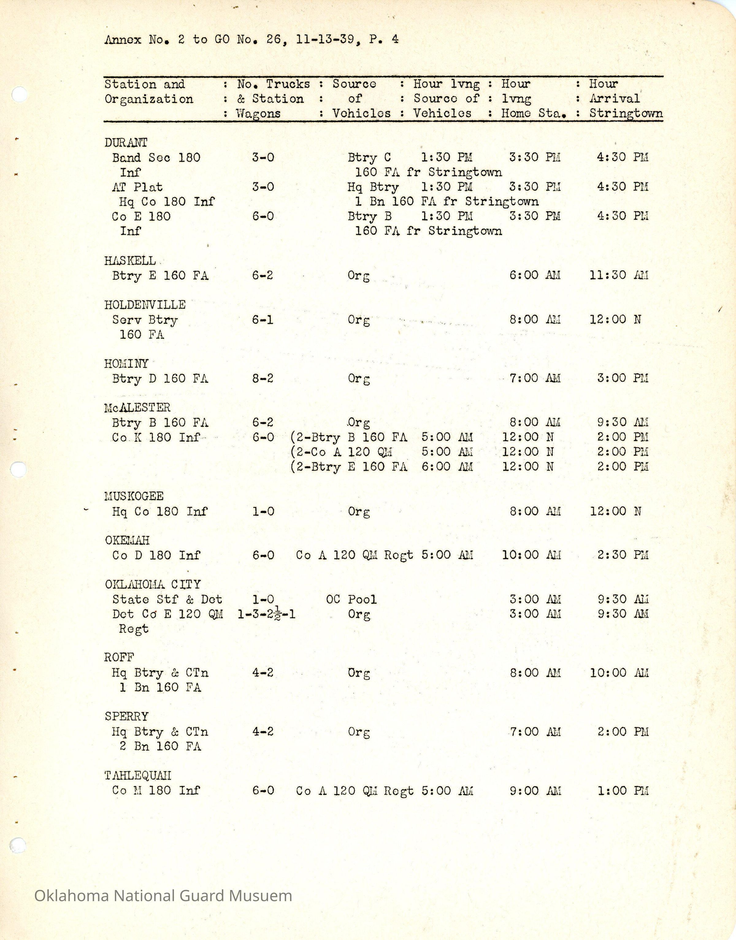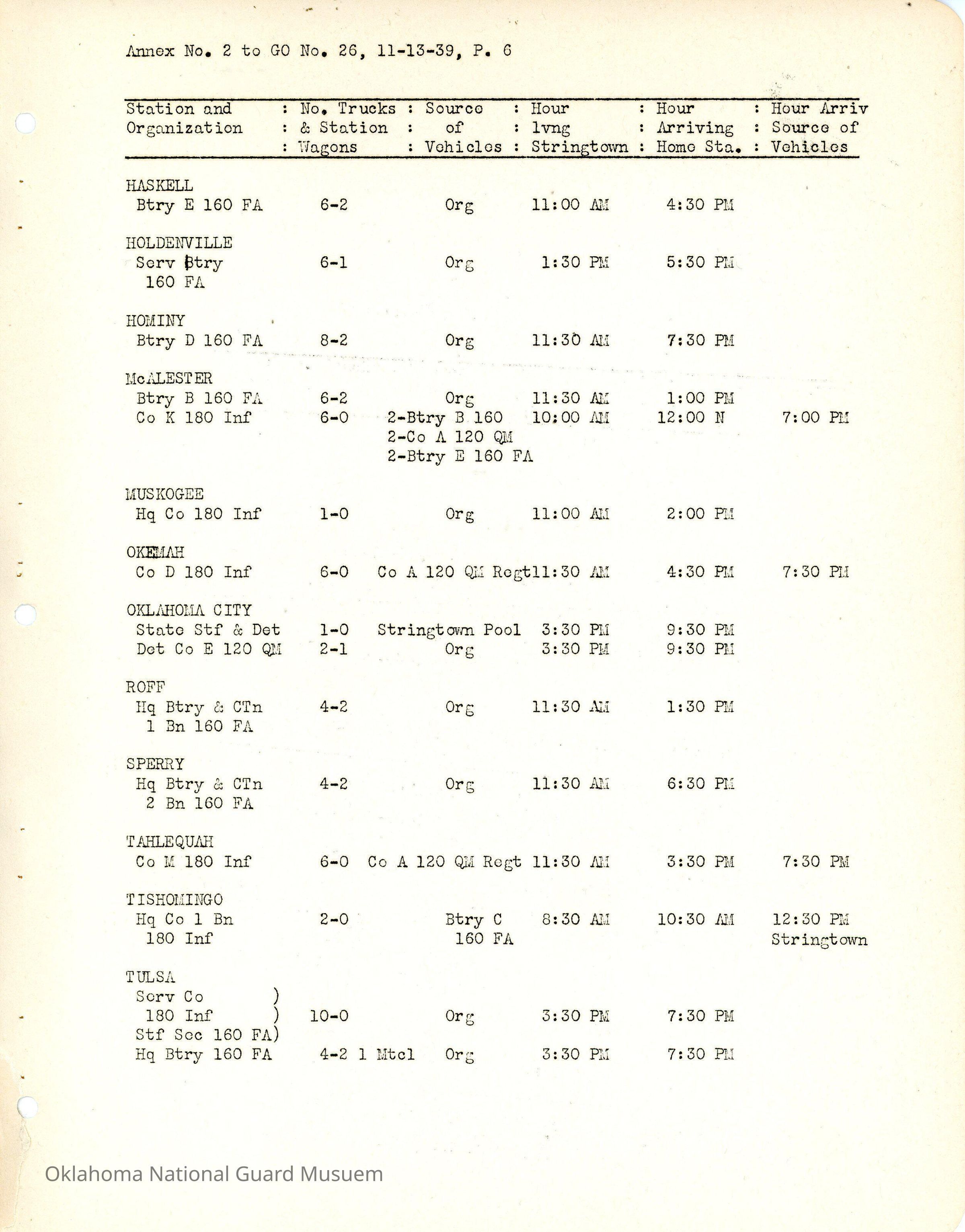 General Order #26 Annex 2 from Headquarters Adjutant General's Office in Oklahoma City. The order details the schedule from home stations to Camp Matthews for additional field training.Date(s) of Creation