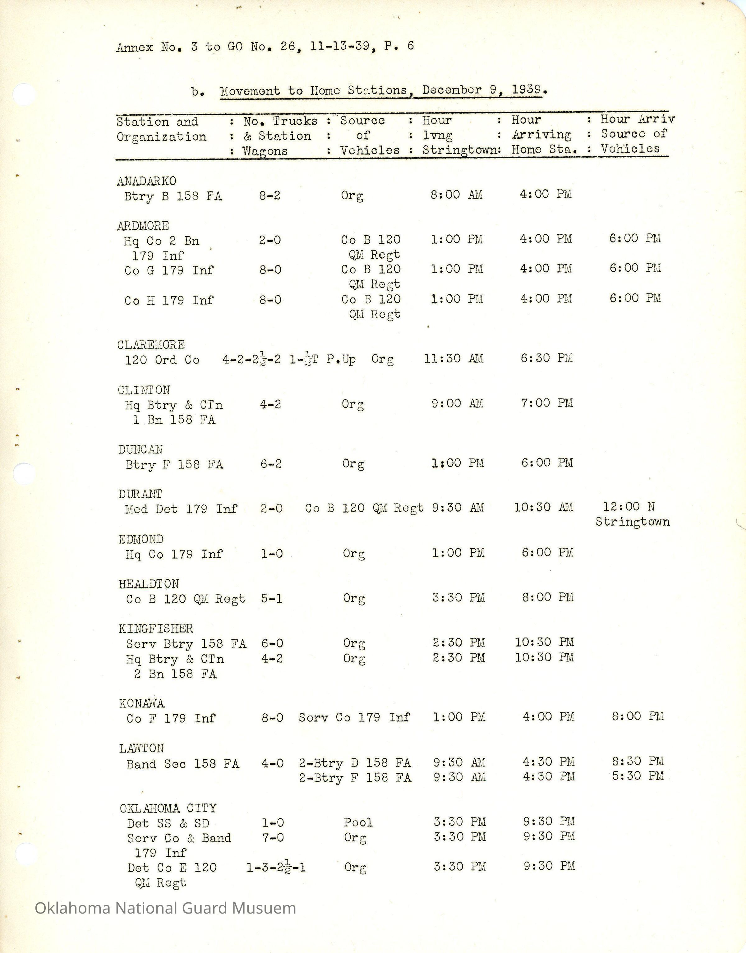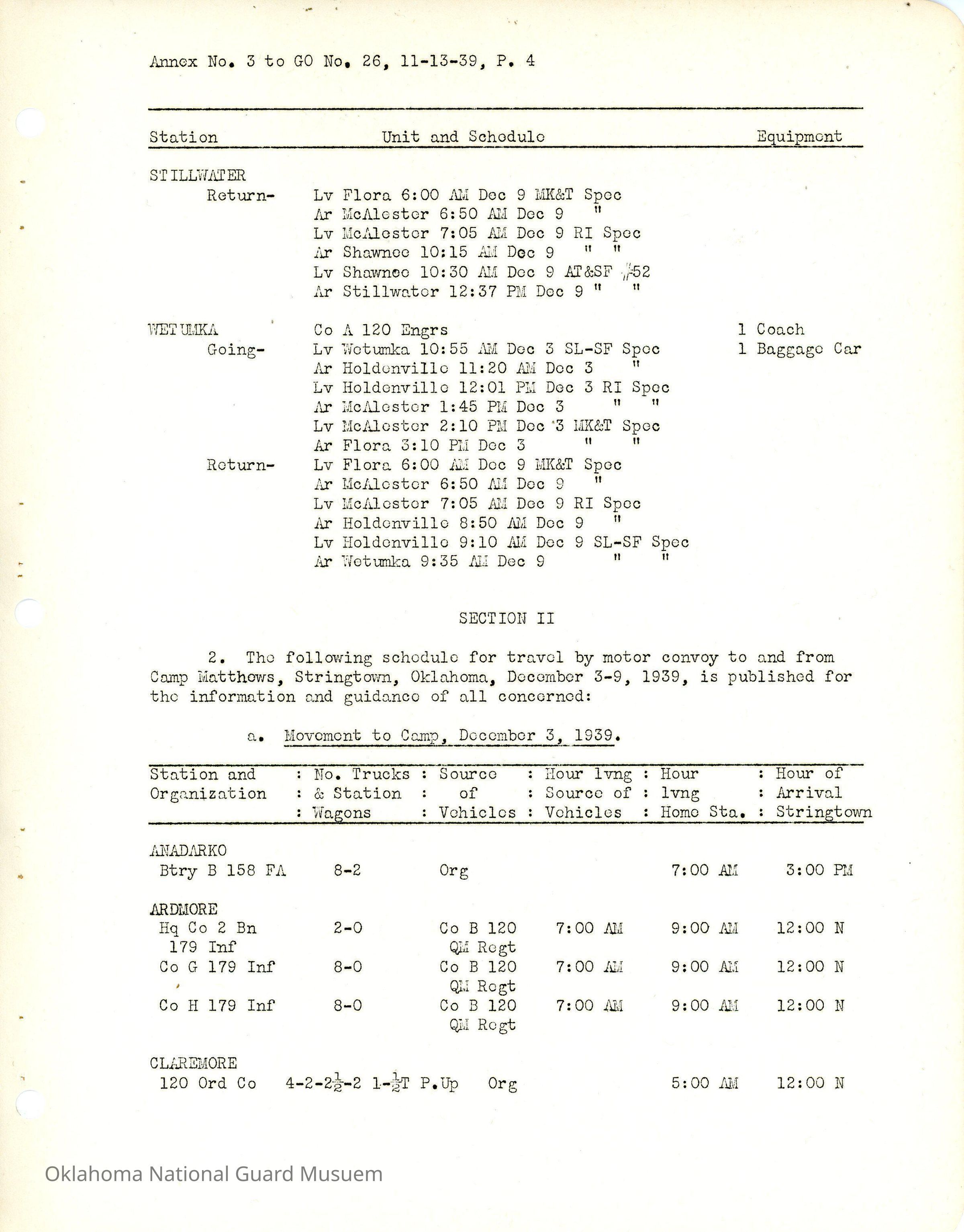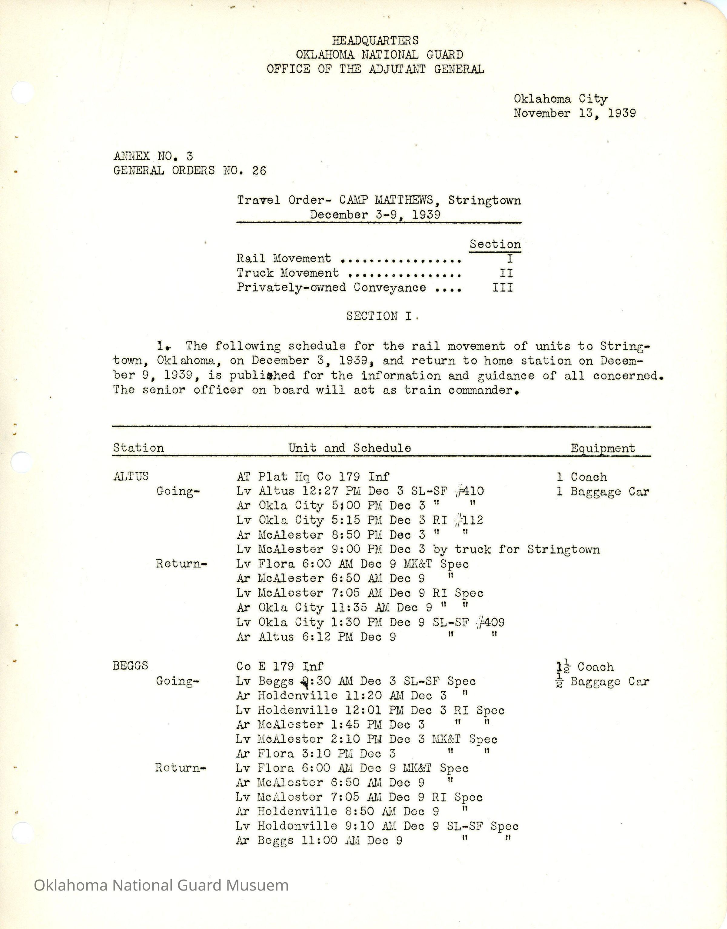 General Order #26 Annex 3 from Headquarters Adjutant General's Office in Oklahoma City. The order details the schedule for the second trip from home stations to Camp Matthews for additional field training.Date(s) of Creation