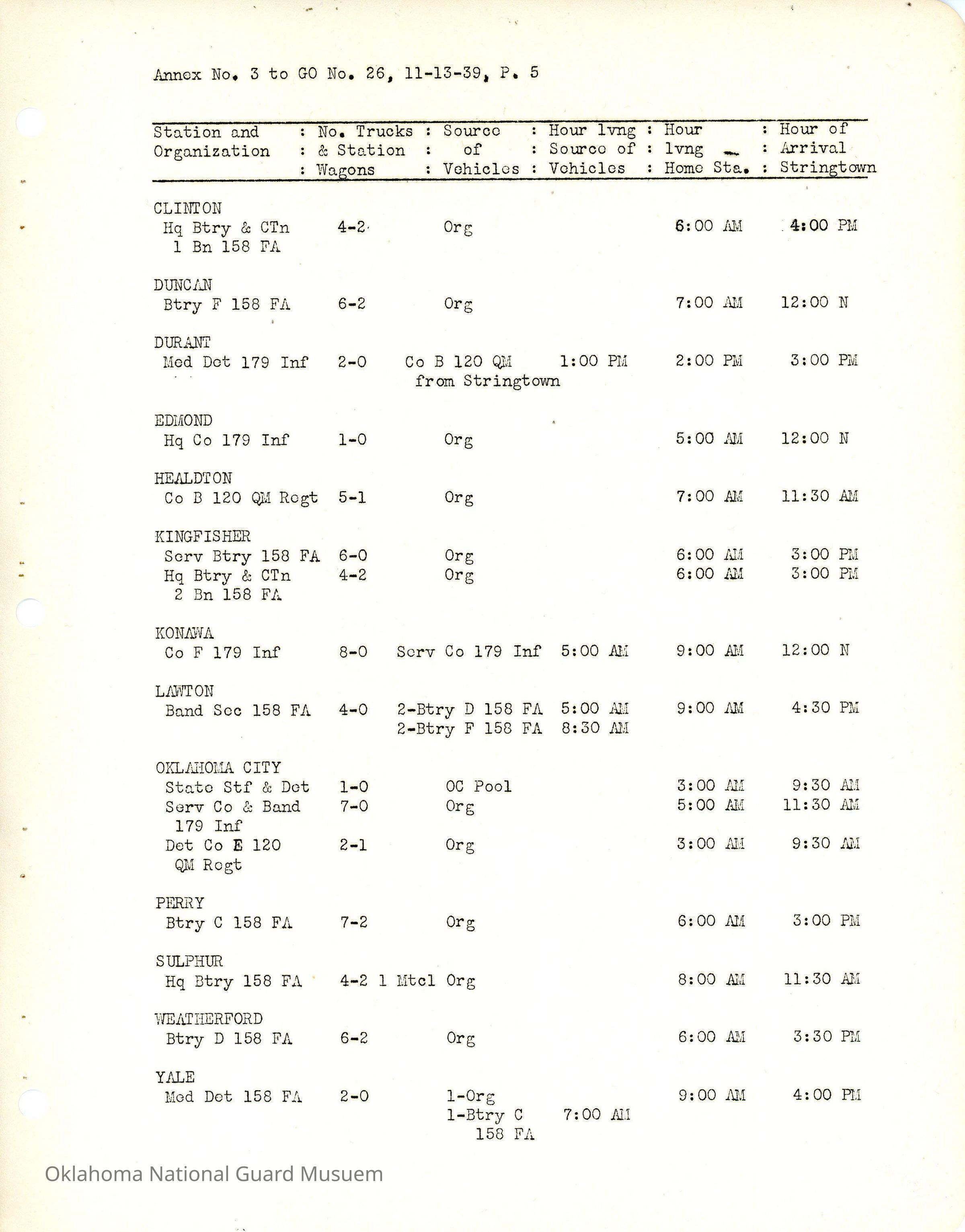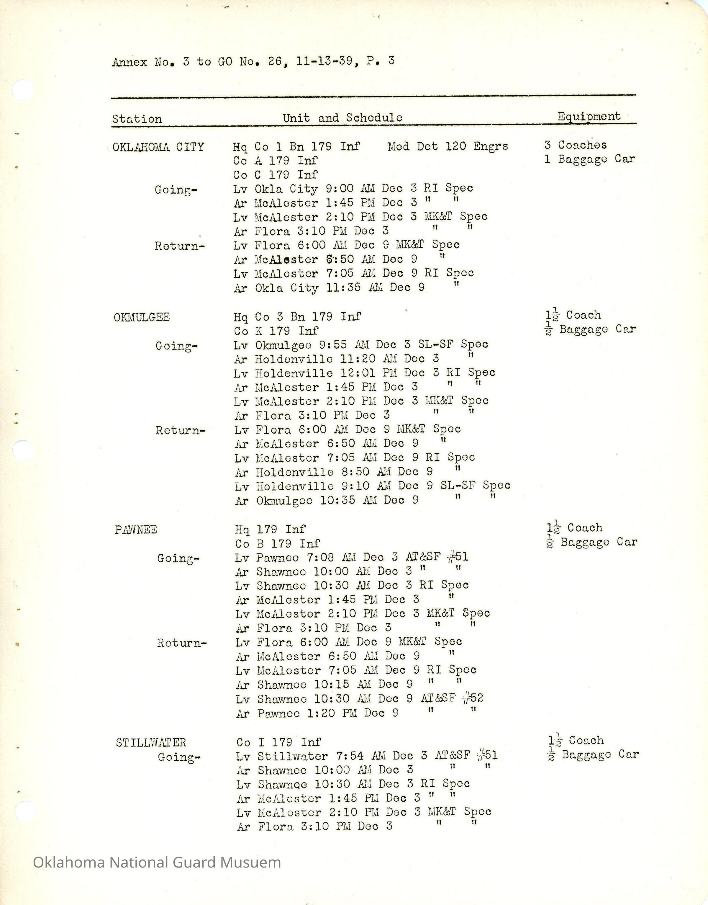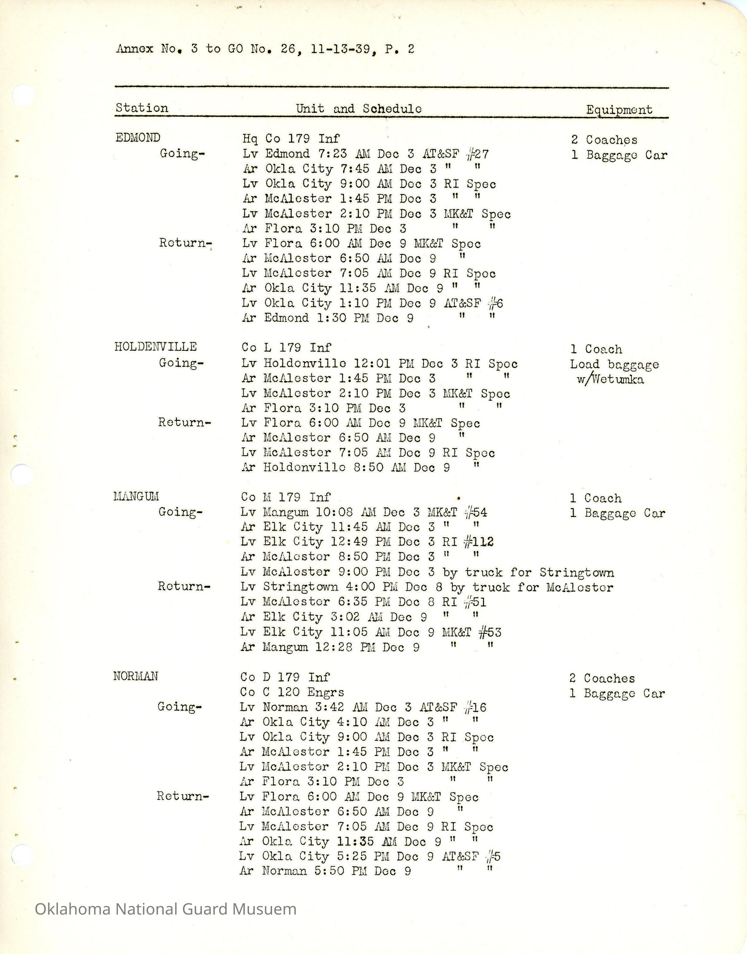 General Order #26 Annex 3 from Headquarters Adjutant General's Office in Oklahoma City. The order details the schedule for the second trip from home stations to Camp Matthews for additional field training.Date(s) of Creation