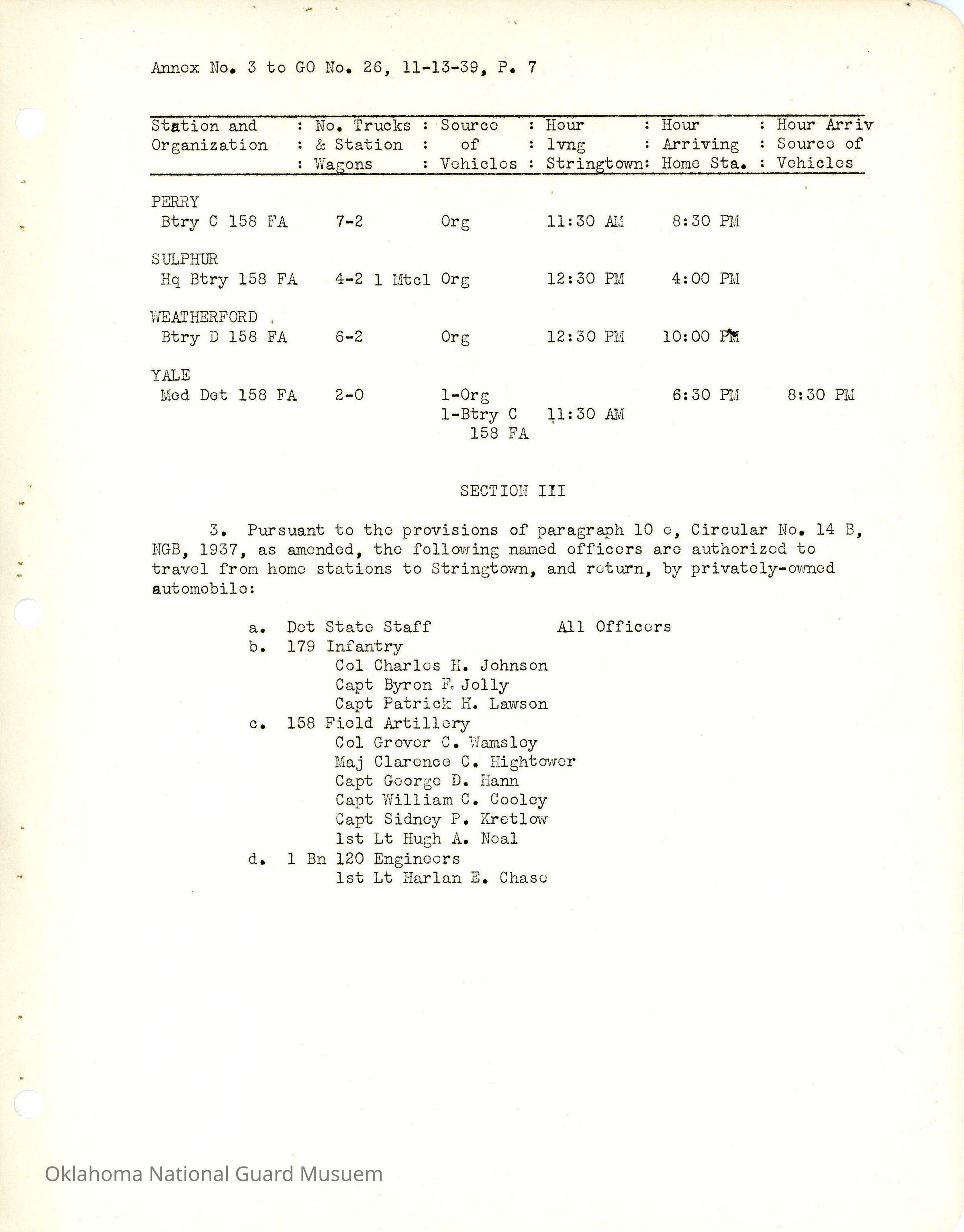 Adjutant General, Oklahoma City, Camp Matthews, Stringtown, Altus, 179th Infantry, McAlester, Beggs, Holdenville, Flora, Edmond, Mangum, Elk City, Norman, 120th Engineers, Okmulgee, Pawnee, Shawnee, Stillwater, Wetumka, Anadarko, 158th Field Artillery, Ardmore, Claremore, 120th Ordinance Company, Clinton, Duncan, Durant, Edmond, Healdton, Kingfisher, 120th Quartermaster Regiment, Konawa, Lawton, Perry, Sulphur, Weatherford, Yale, Charles H. Johnson, Byron F. Jolly, Patrick H. Lawson, Grover C. Wamsley, Clarence C. Hightower, George D. Hann, William C. Cooley, Sidney P. Kretlow, Hugh A. Neal, Harlan E. Chase