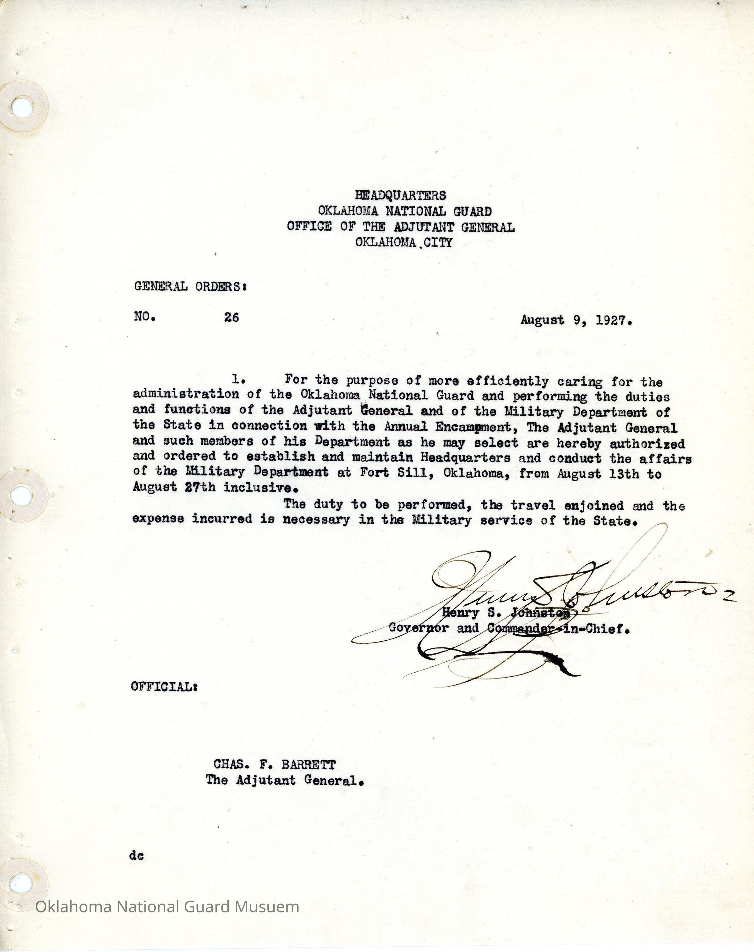 General Order #26 from Headquarters Adjutant General's Office in Oklahoma City. The order approves the establishment of headquarters in Fort Sill during the Annual EncampmentDate(s) of Creation