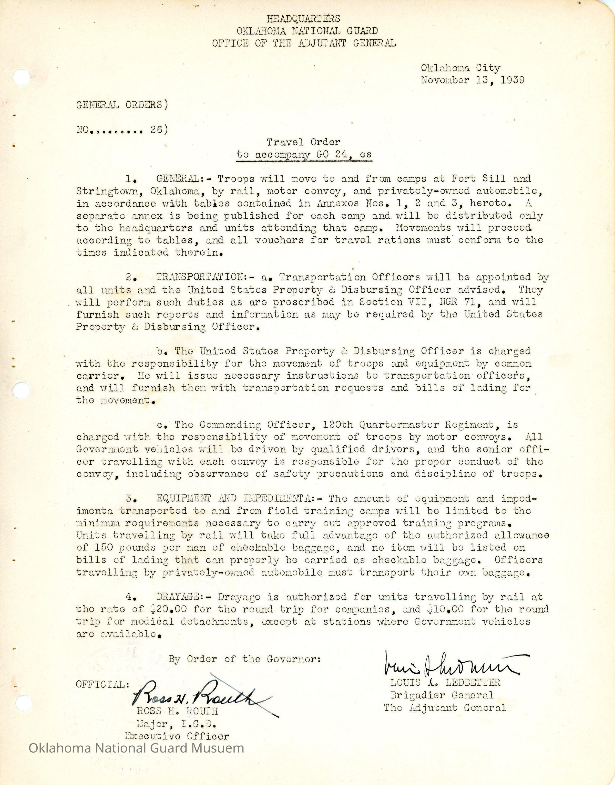 General Order #26 from Headquarters Adjutant General's Office in Oklahoma City. The order accompanies General Order #24 1939 and details the travel and transportation of the troops to the field trainingDate(s) of Creation