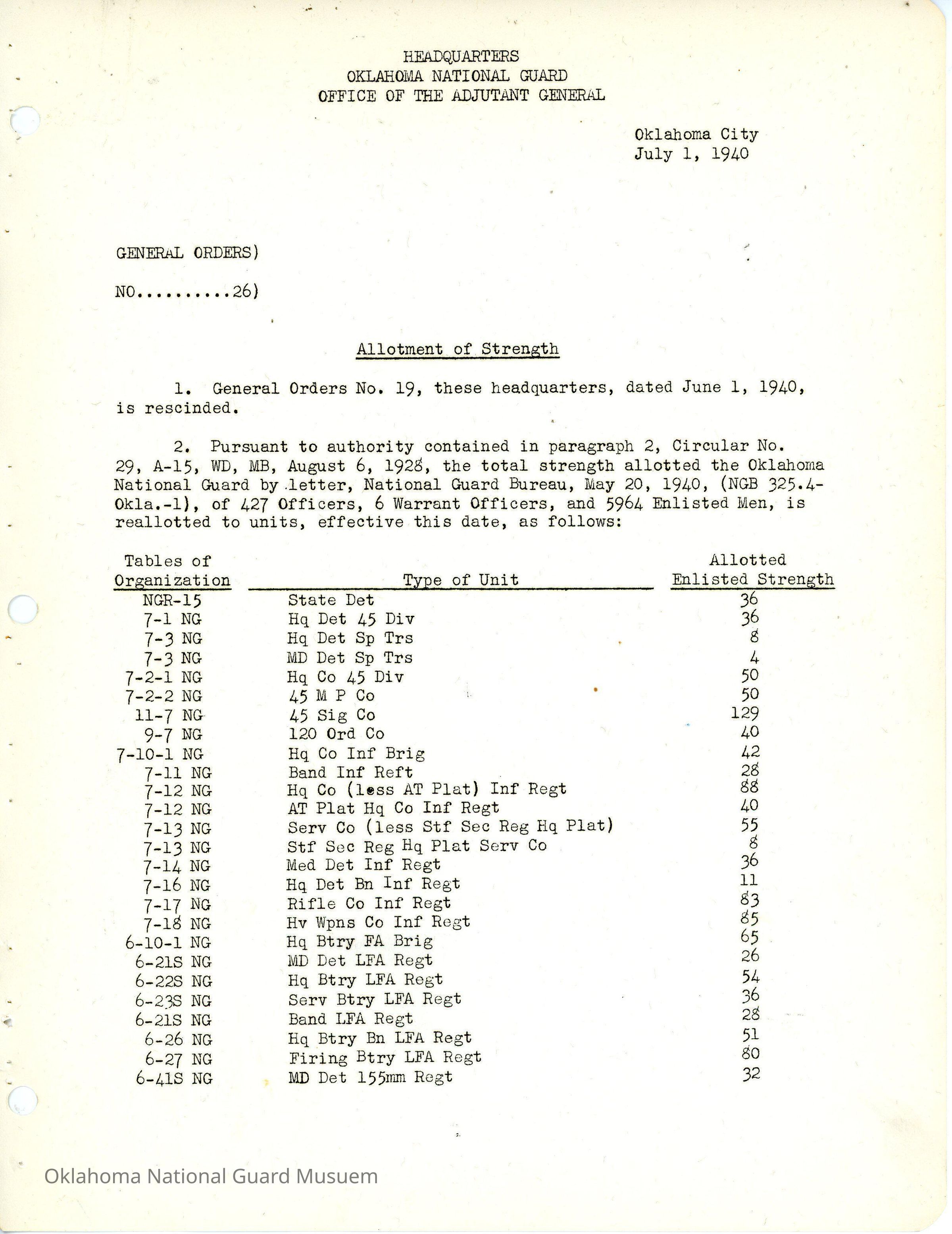 General Order #26 from Headquarters Adjutant General's Office in Oklahoma City. The order rescinds General Order #19 1940 and establishes new strength allotment numbers for the Oklahoma GuardDate(s) of Creation