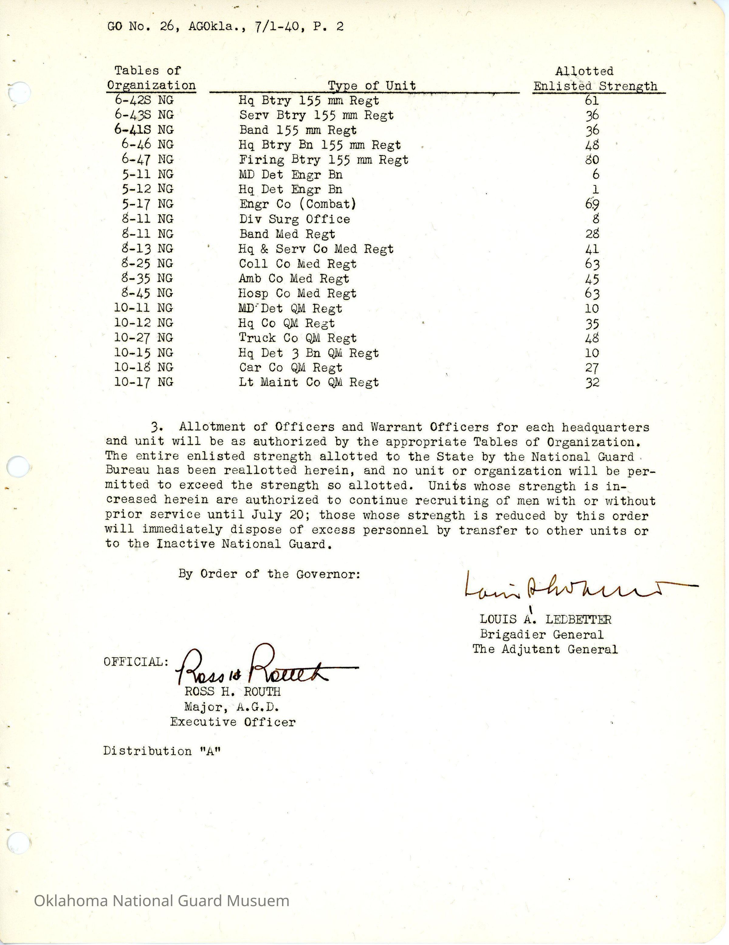 Adjutant General, Oklahoma City, Louis Ledbetter, Ross H. Routh, Rescinds, Allotment of Strength, 45th Division, 90th Infantry Brigade, 179th Infantry, 180th Infantry, 70th Field Artillery Brigade, 158th Field Artillery, 160th Field Artillery, 189th Field Artillery, 120th Engineers, 120th Medical Regiment, 120th Quartermaster Regiment