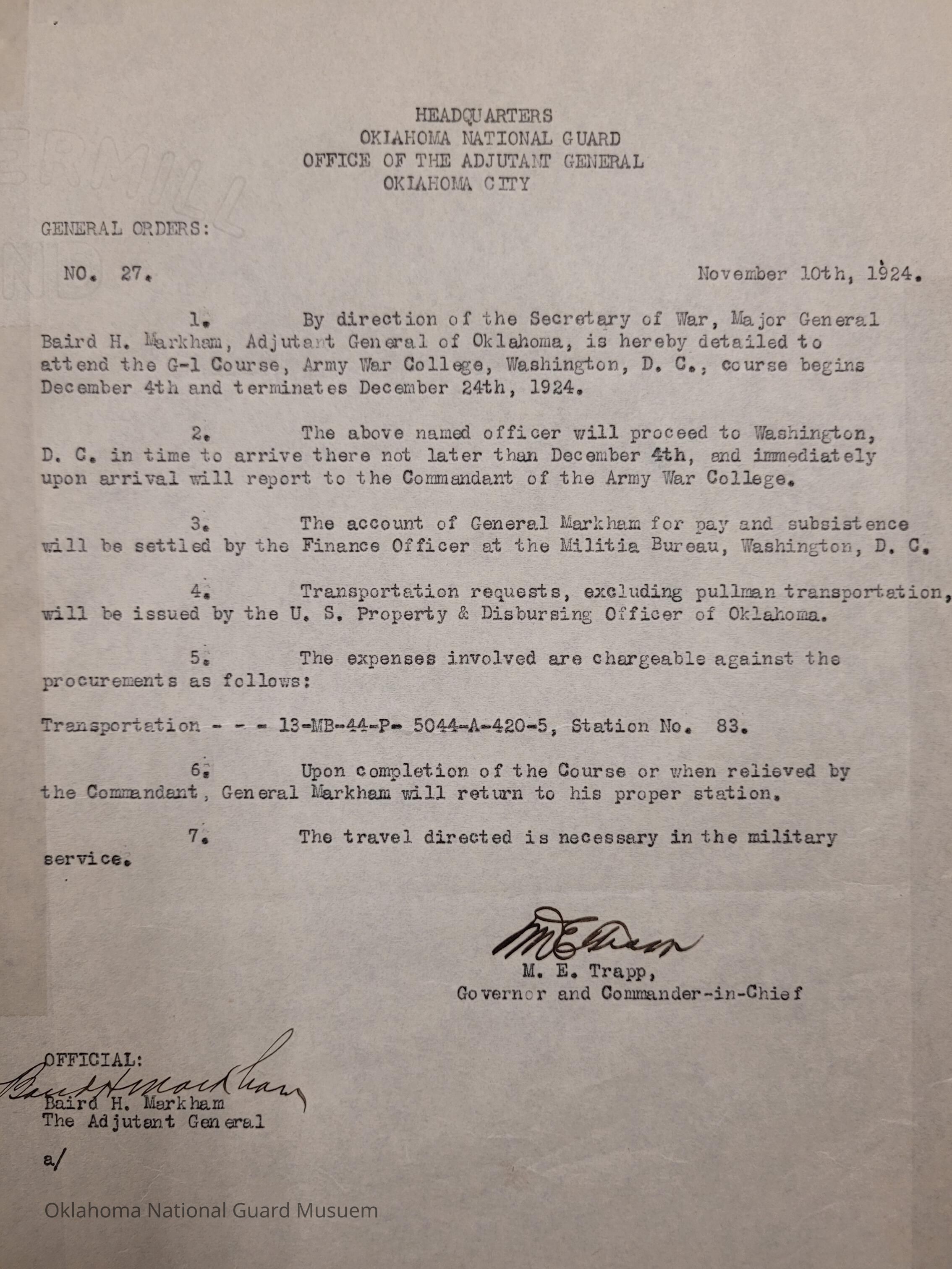 General Order #27 from Headquarters Adjutant General's Office in Oklahoma City. The order directs Baird H. Markham to attend the G-1 course at the Army War College.Date(s) of Creation