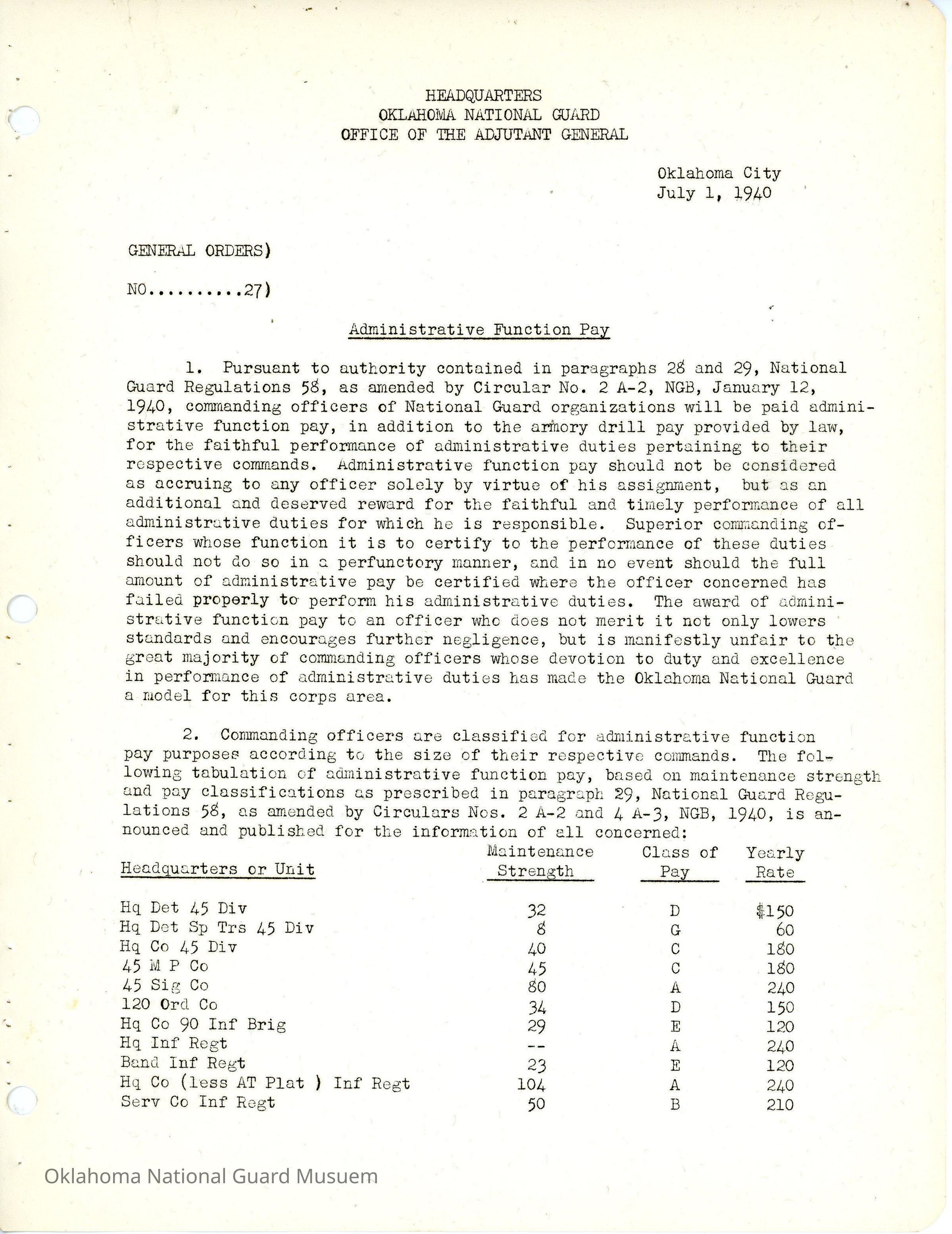 General Order #27 from Headquarters Adjutant General's Office in Oklahoma City. The order pays officers in administrative function pay in addition to the armory drill pay. They earn this extra pay for the faithful performance of administrative duties related to their command. The order lists the yearly rate and class of pay for different units. The order rescinds General Order #15 1940Date(s) of Creation