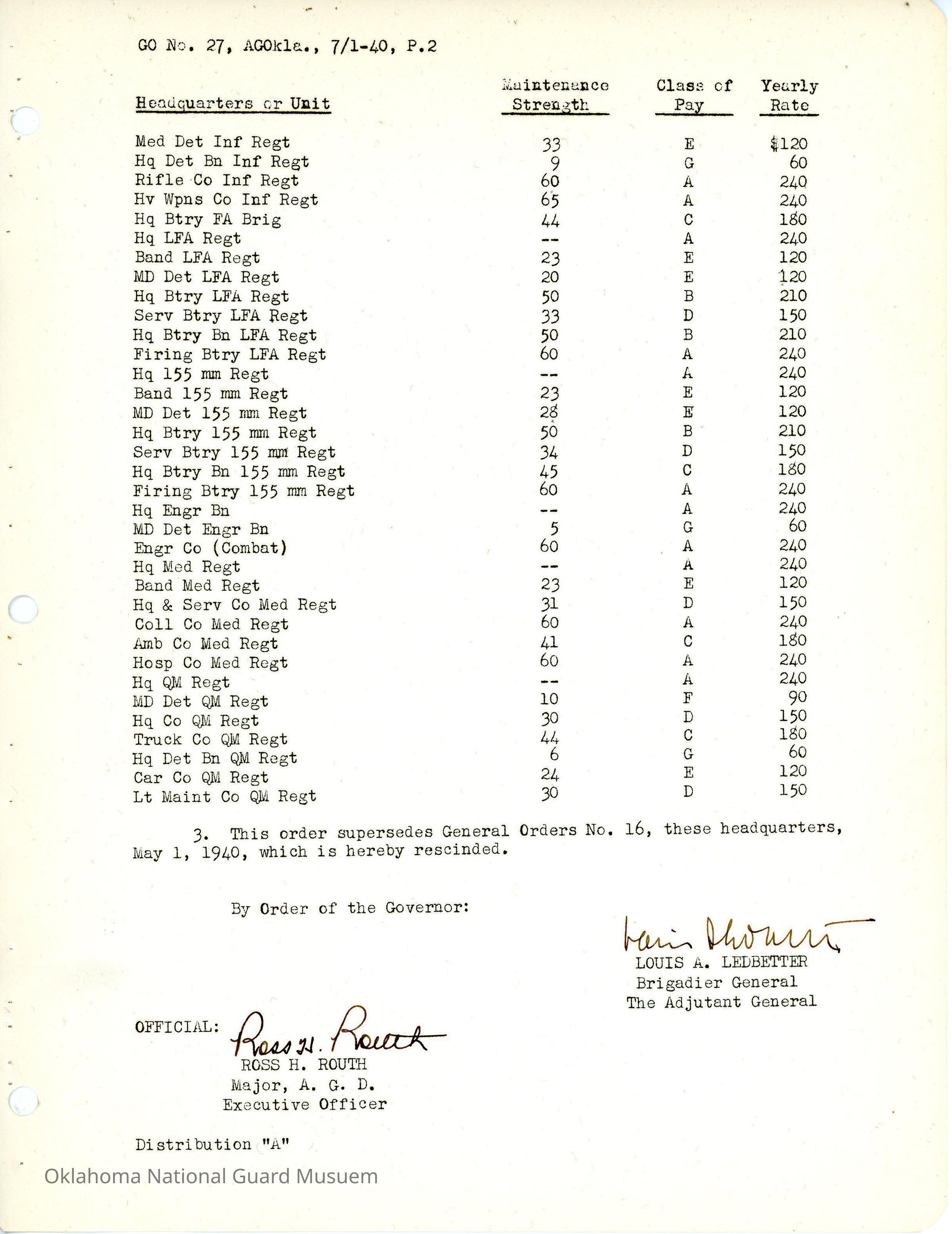 Adjutant General, Oklahoma City, Louis A. Ledbetter, Ross H. Routh, Pay, Drill pay, Administrative function pay, 45th Division, 120th Ordinance Company, 45th Signal Corps, 90th Infantry Brigade