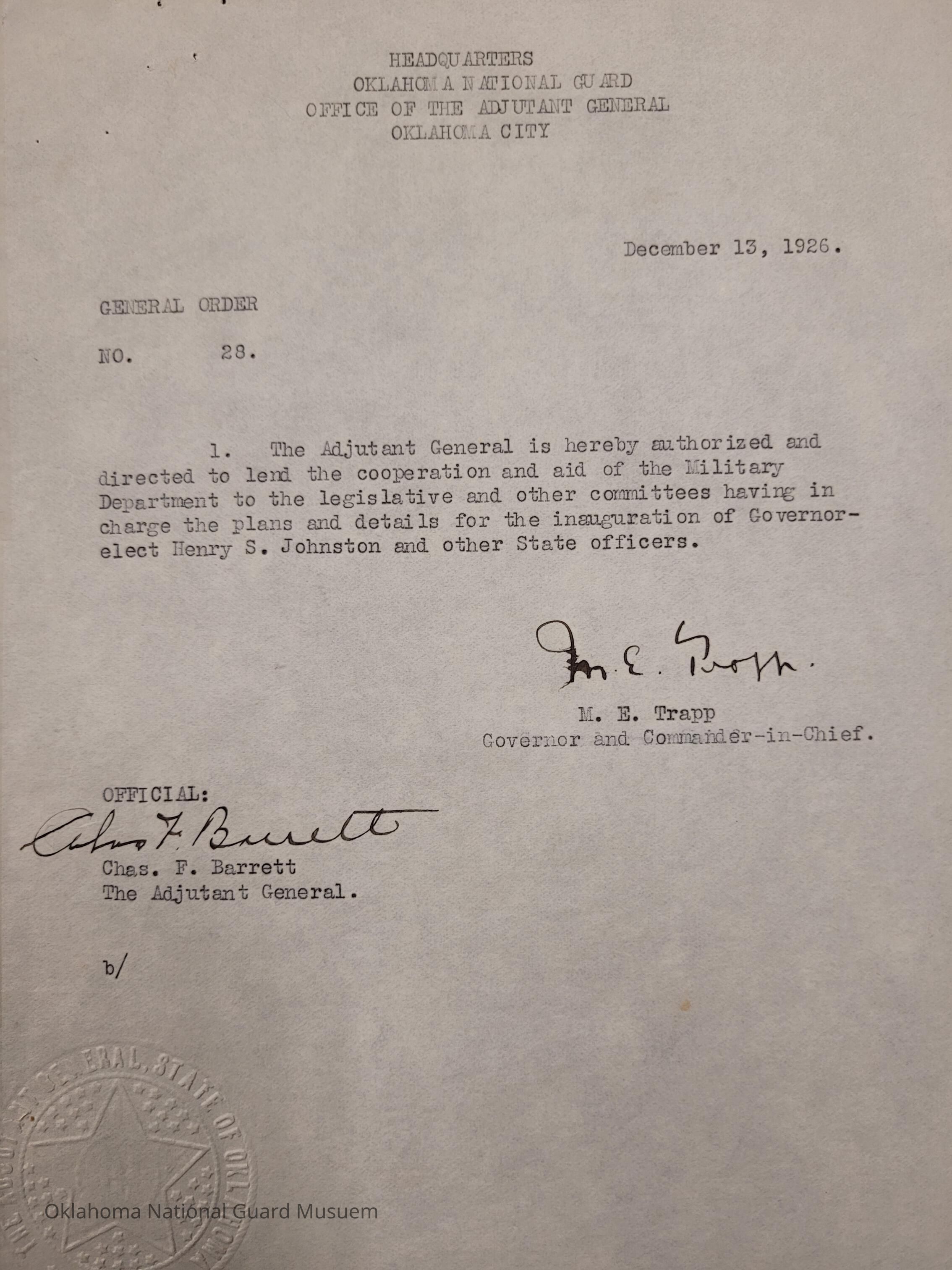 General Order #28 from Headquarters Adjutant General's Office in Oklahoma City. The order instructs Charles F. Barrett to lend the cooperation of the Military Department to the legislative committees in charge of planning the inauguration of Henry S. JohnstonDate(s) of Creation
