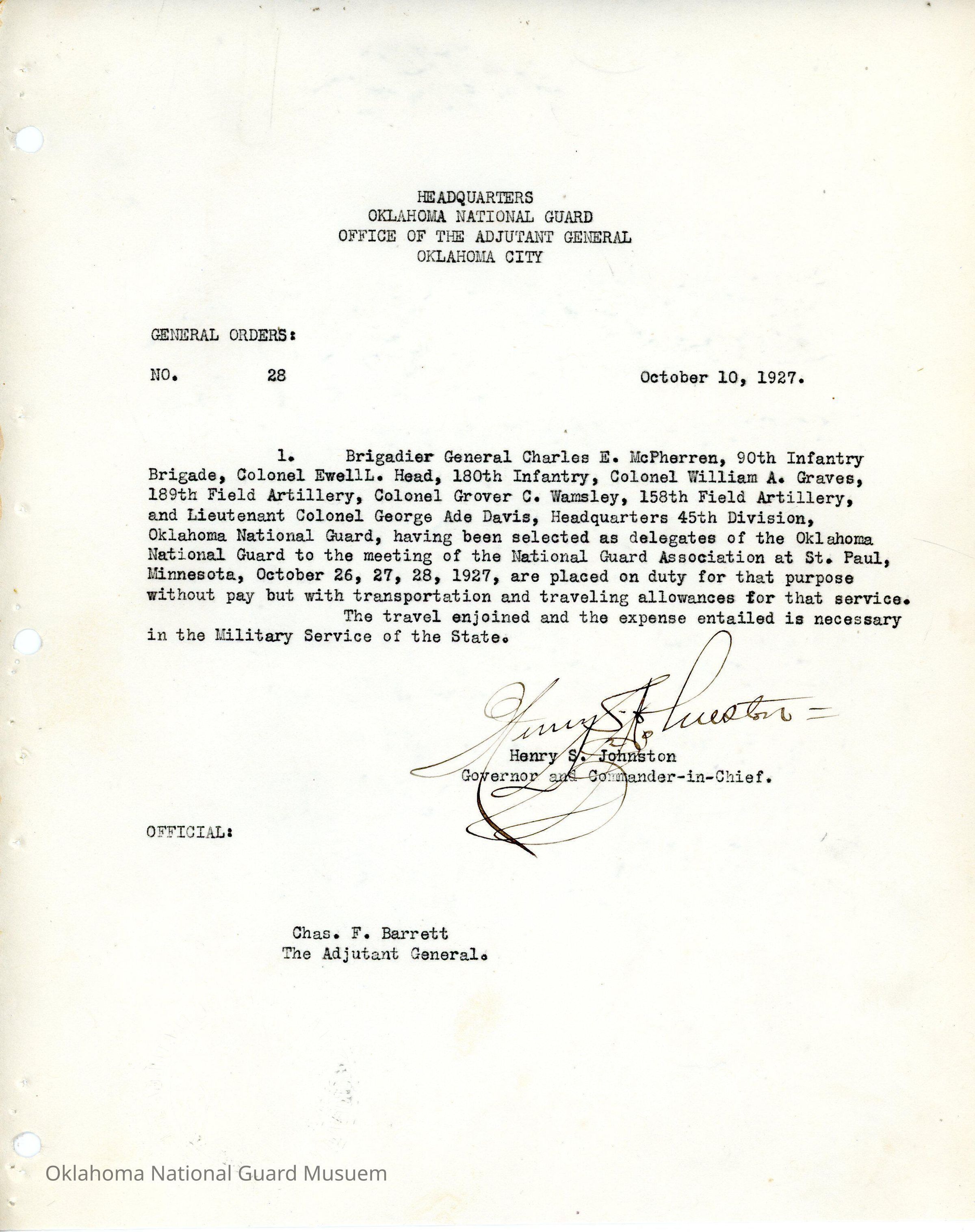 General Order #28 from Headquarters Adjutant General's Office in Oklahoma City. The order designates delegates to represent the Oklahoma National Guard at the National Guard Association meeting in St. Paul, Minnesota.Date(s) of Creation