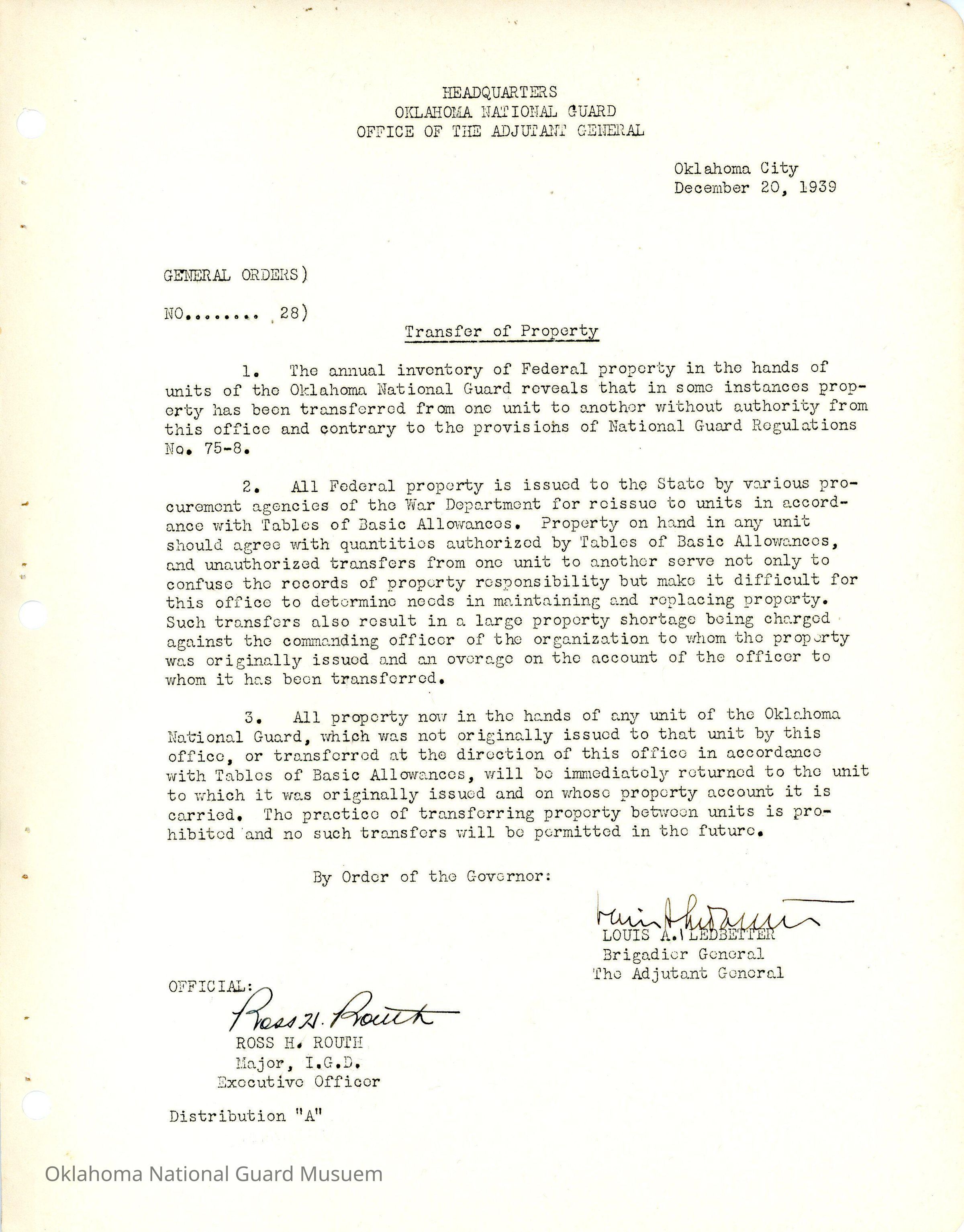 General Order #28 from Headquarters Adjutant General's Office in Oklahoma City. The order details the procedure and handling of federal property in possession of the Oklahoma National GuardDate(s) of Creation