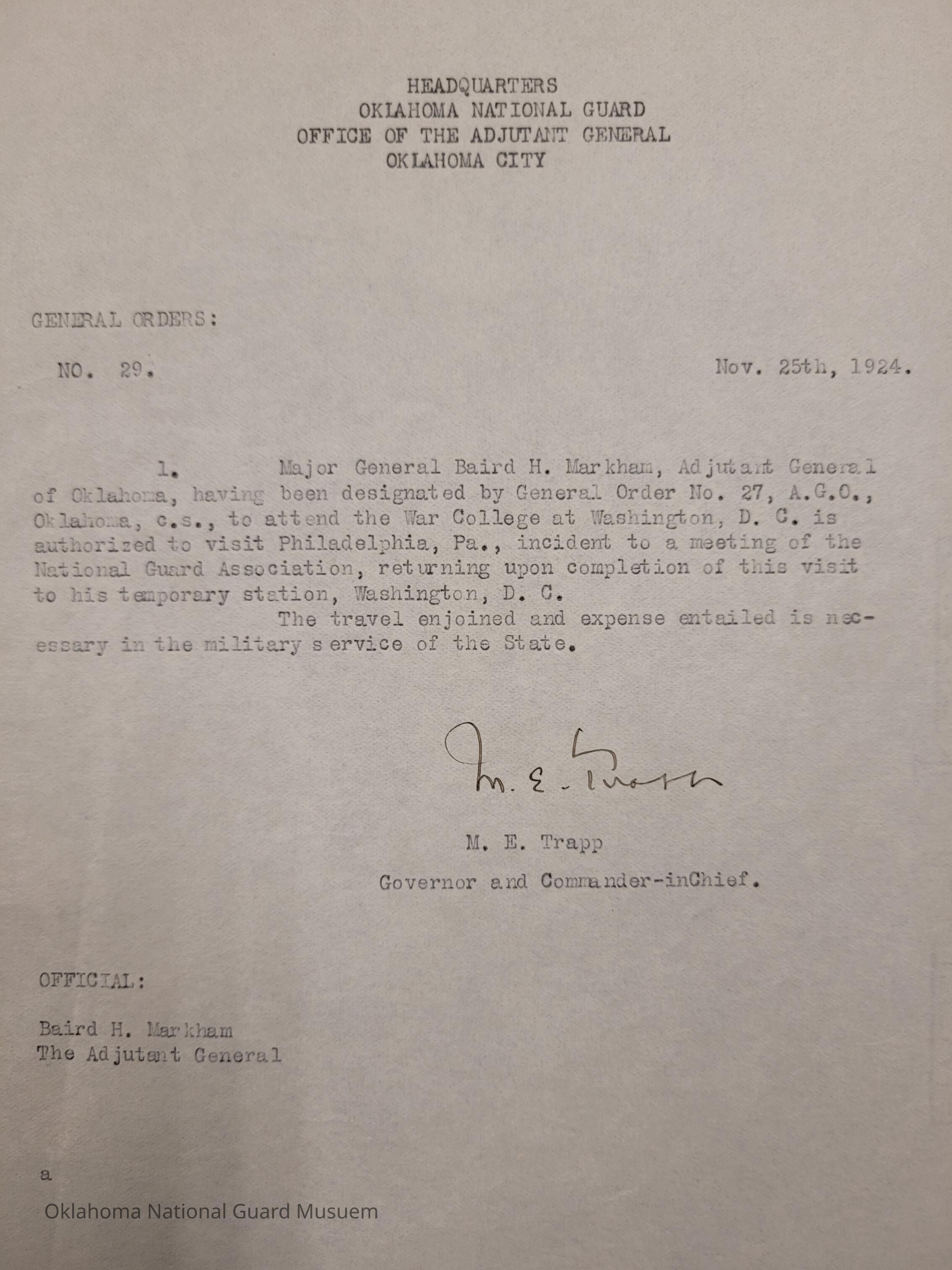 General Order #29 from Headquarters Adjutant General's Office in Oklahoma City. The order allows Baird H. Markham to visit Philadelphia, Pennsylvania for the meeting of the National Guard Association while attending the Army War CollegeDate(s) of Creation