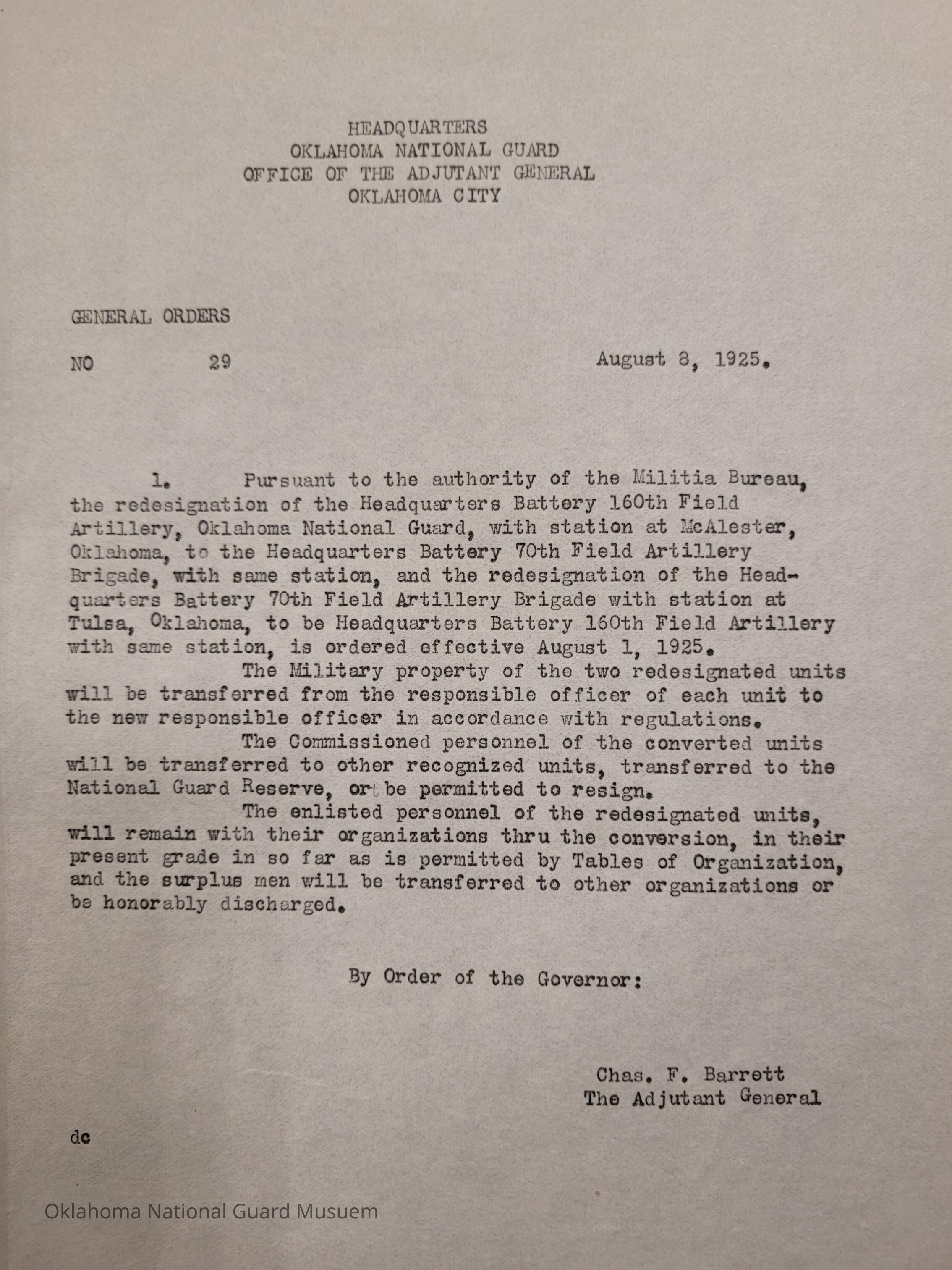 General Order #29 from Headquarters Adjutant General's Office in Oklahoma City. The order re-designates Headquarters Battery 160th Field Artillery in McAlester tot the Headquarters Battery 70th Field Artillery. Re-designation of the Headquarters 70th Field Artillery Brigade in Tulsa to be Headquarters Batter 160th Field ArtilleryDate(s) of Creation