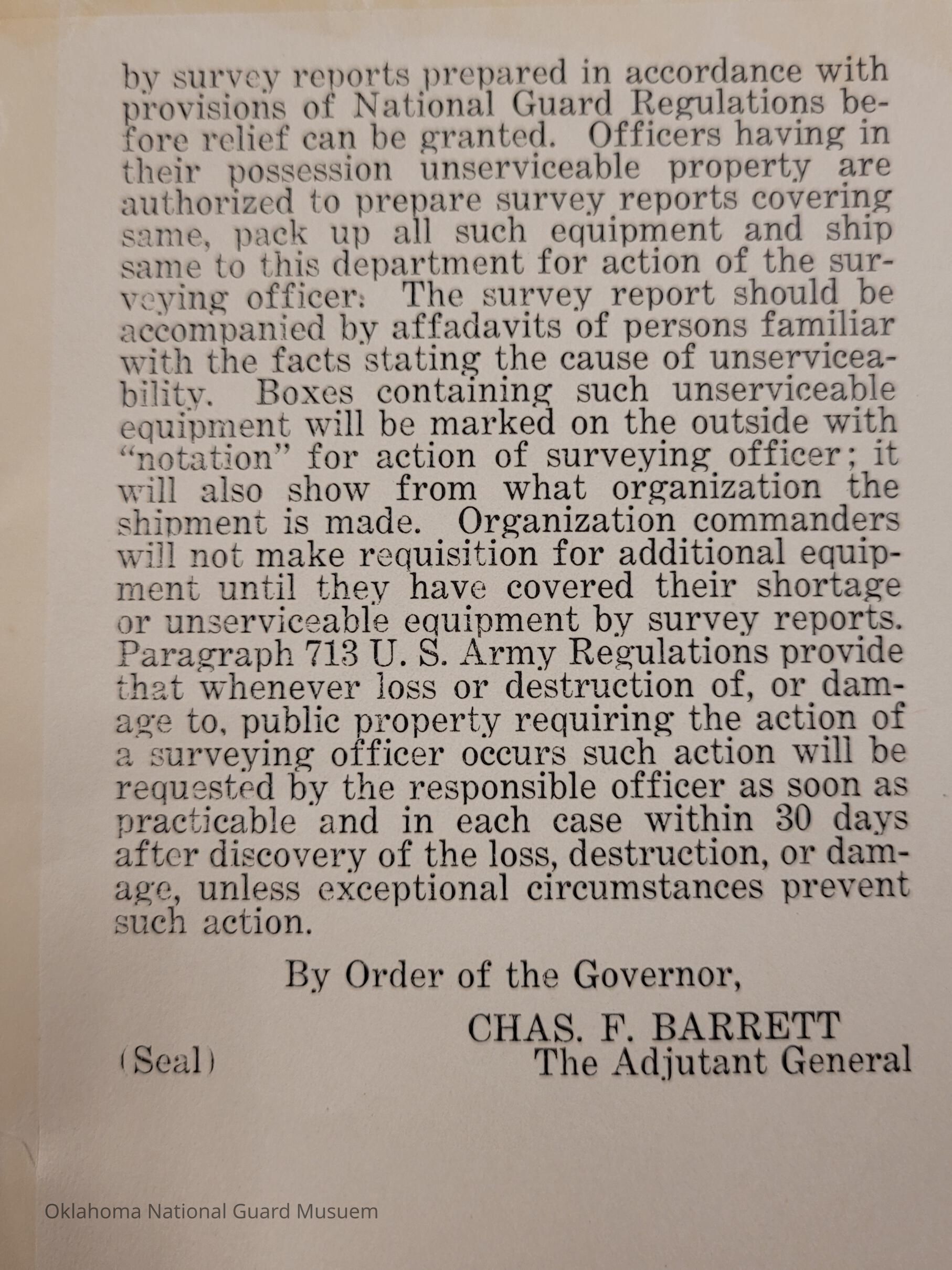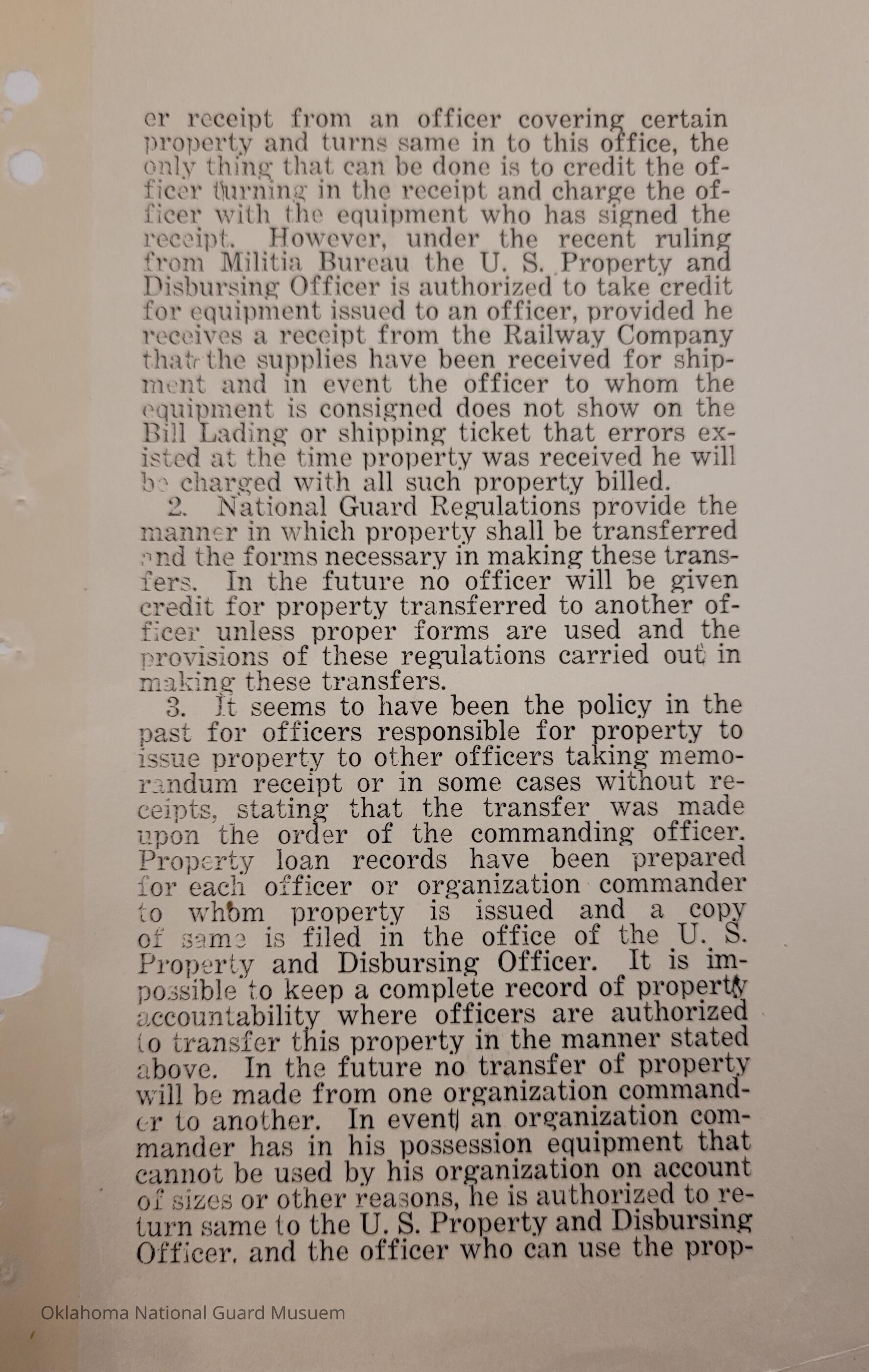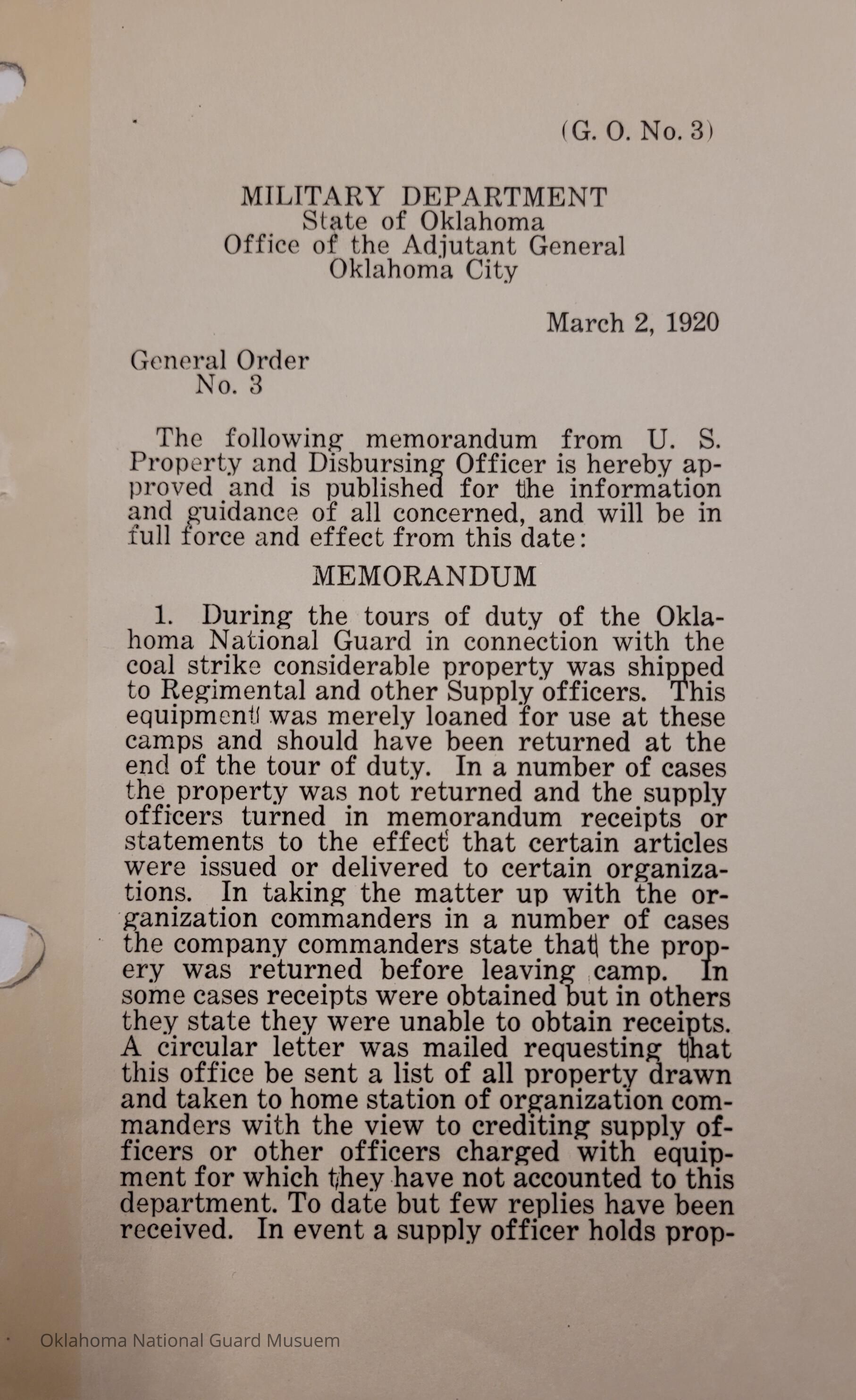 General Order #3 from Headquarters Adjutant General's Office in Oklahoma City. The order issues a memorandum from the U.S. Property and Disbursing Officer regarding missing federal military property loaned to the Oklahoma National Guard during their deployment in connection with the coal strikes. Some of that federal equipment and property was not returned after the deployment was completed.Date(s) of Creation