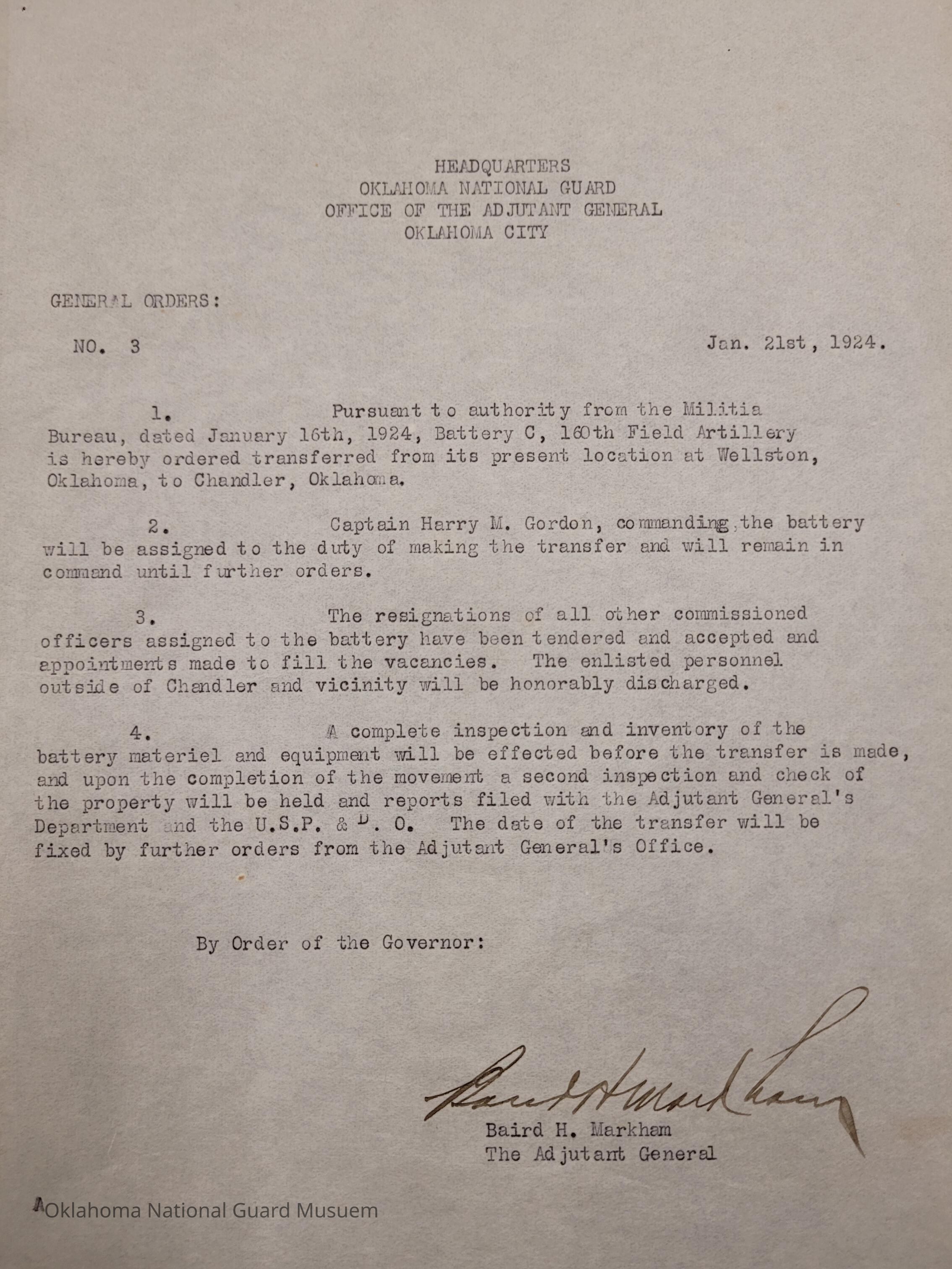 General Order #3 from Headquarters Adjutant General's Office in Oklahoma City. The order transfers Battery C 160th Field Artillery from Wellston to ChandlerDate(s) of Creation