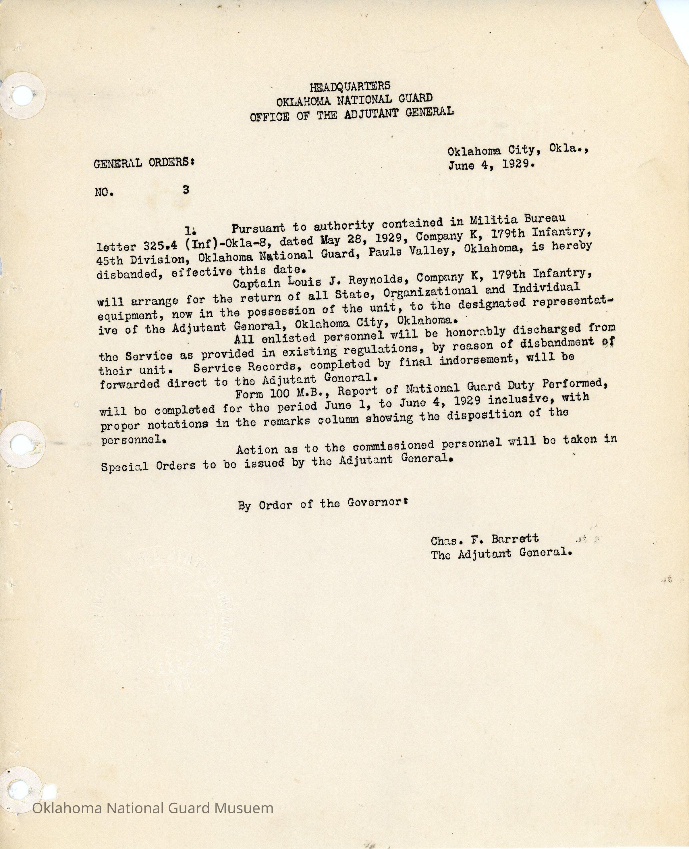 Adjutant General, Oklahoma City, Charles F. Barrett, 179th Infantry, 45th Division, Pauls Valley, Disband, Louis J. Reynolds