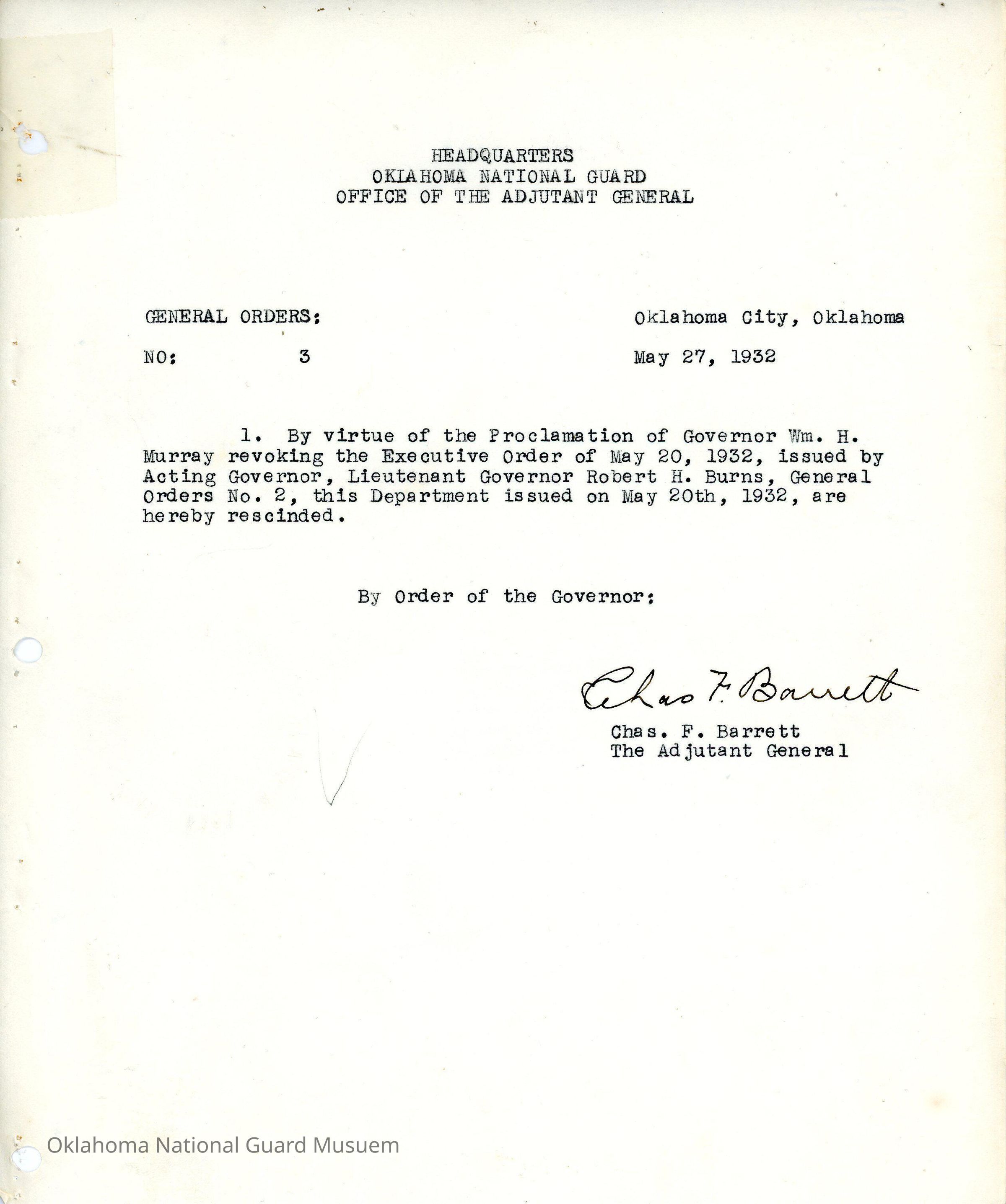 General Order #3 from Headquarters Adjutant General's Office in Oklahoma City. The order rescinds General Order #2 1932Date(s) of Creation
