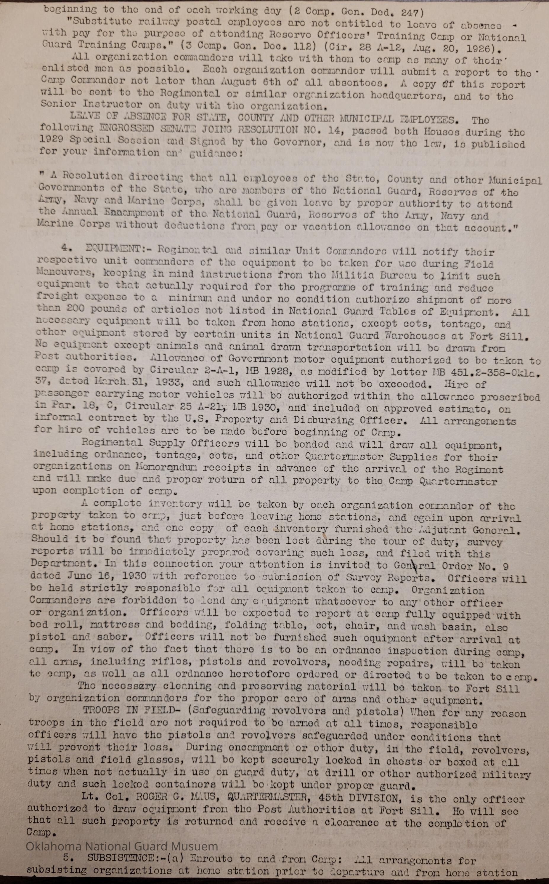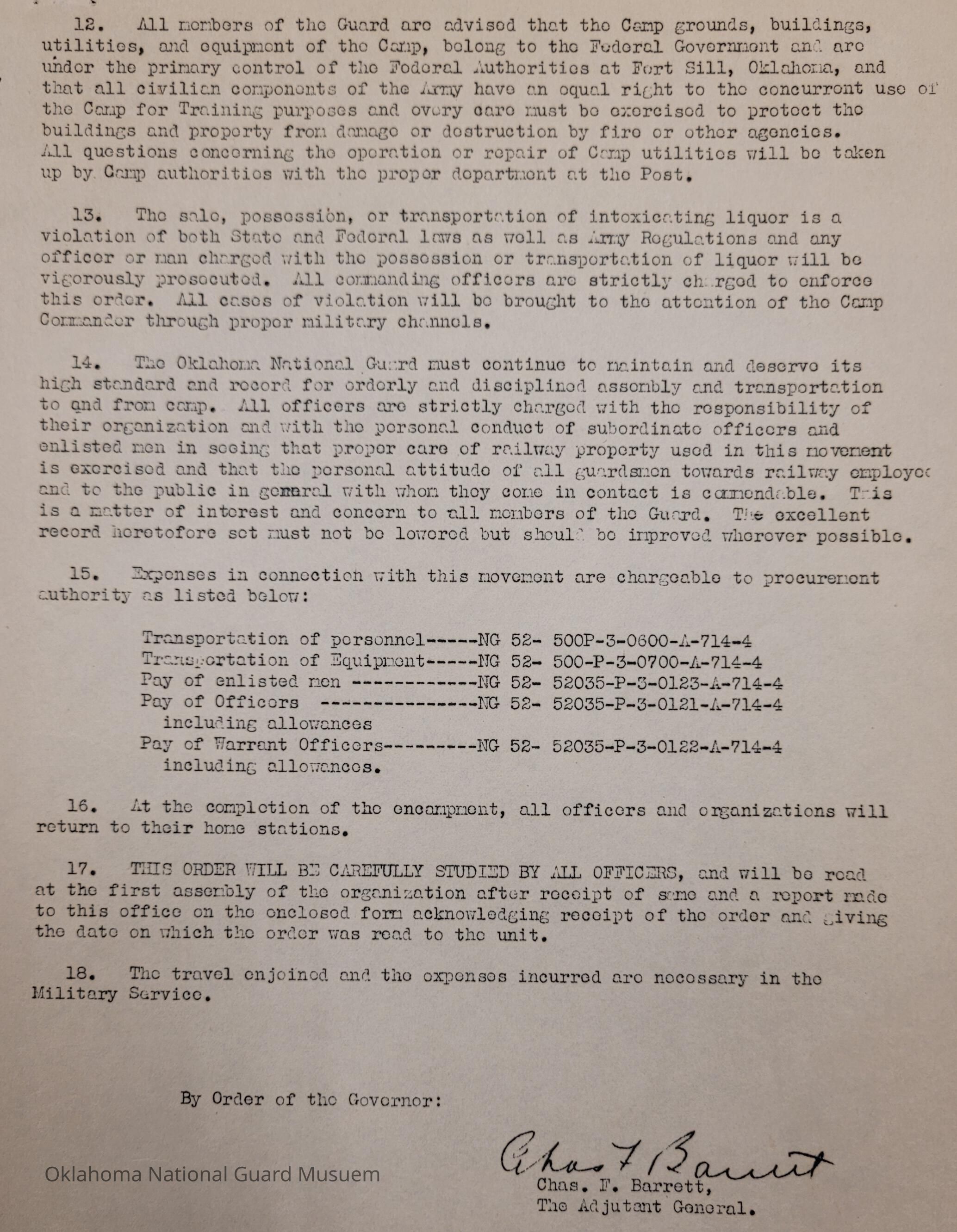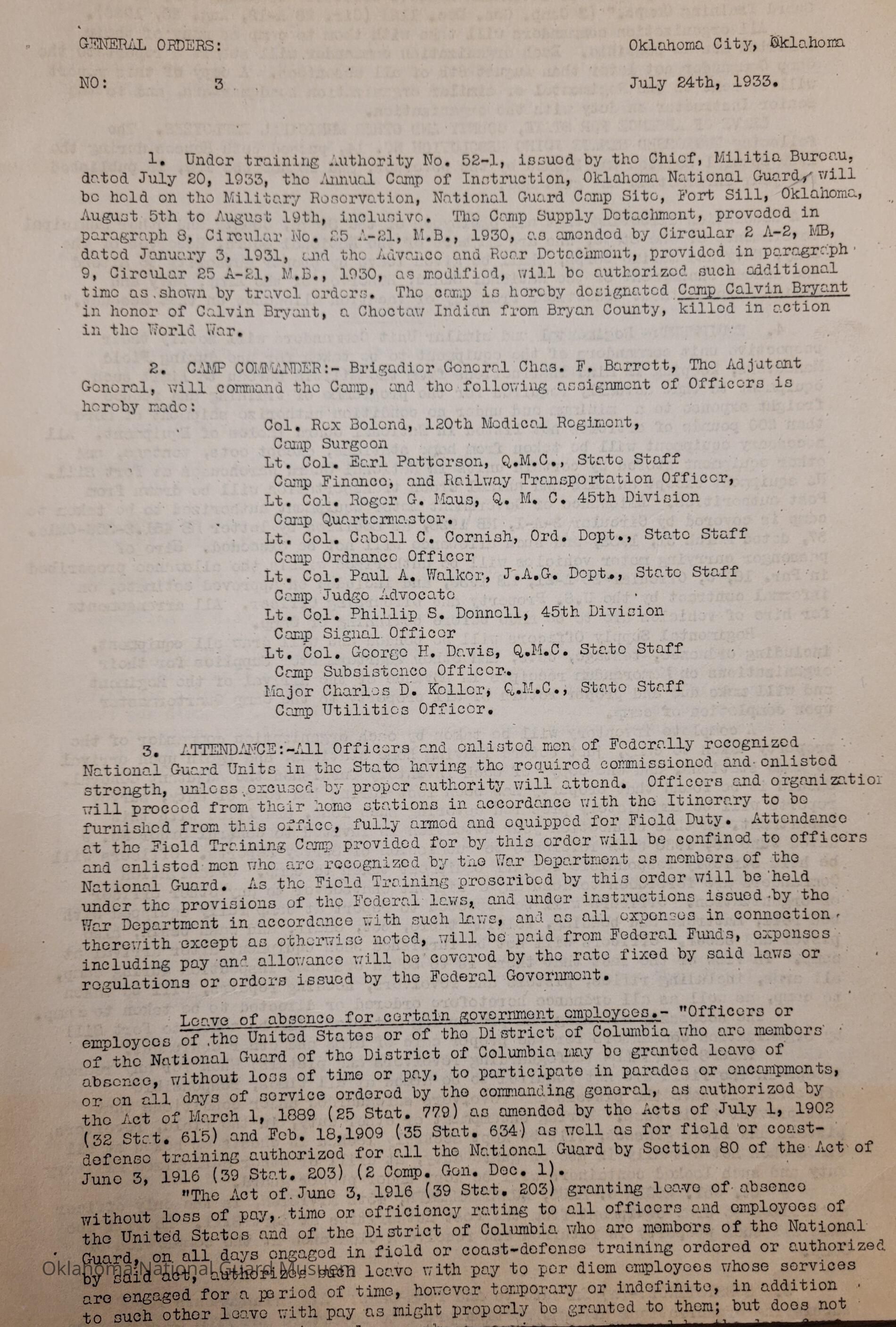 Adjutant General, Oklahoma City, Charles F. Barrett, 45th Division, Camp of Instruction, Fort Sill, Attendance, Pay, Transportation, William H. Murray, Roger G. Maus, Camp Calvin Bryant, Calvin Bryant, World War One, Choctaw Indian, Rex Bolend, 120th Medical Regiment, Earl Patterson, Cabell C. Cornish, Paul A. Walker, Phillip C. Donnell, 45th Signal Officer, George H. Davis, Charles D. Keller