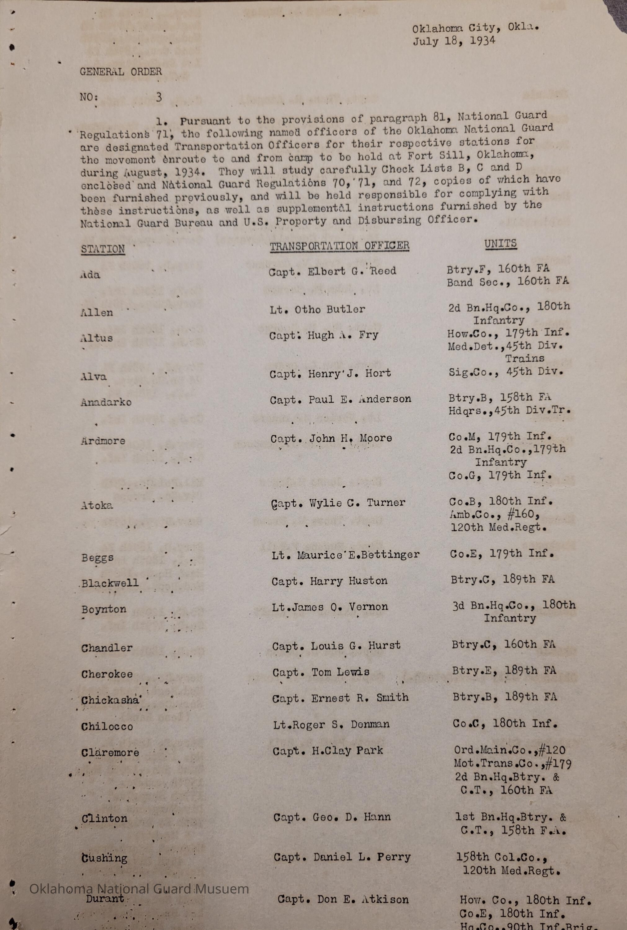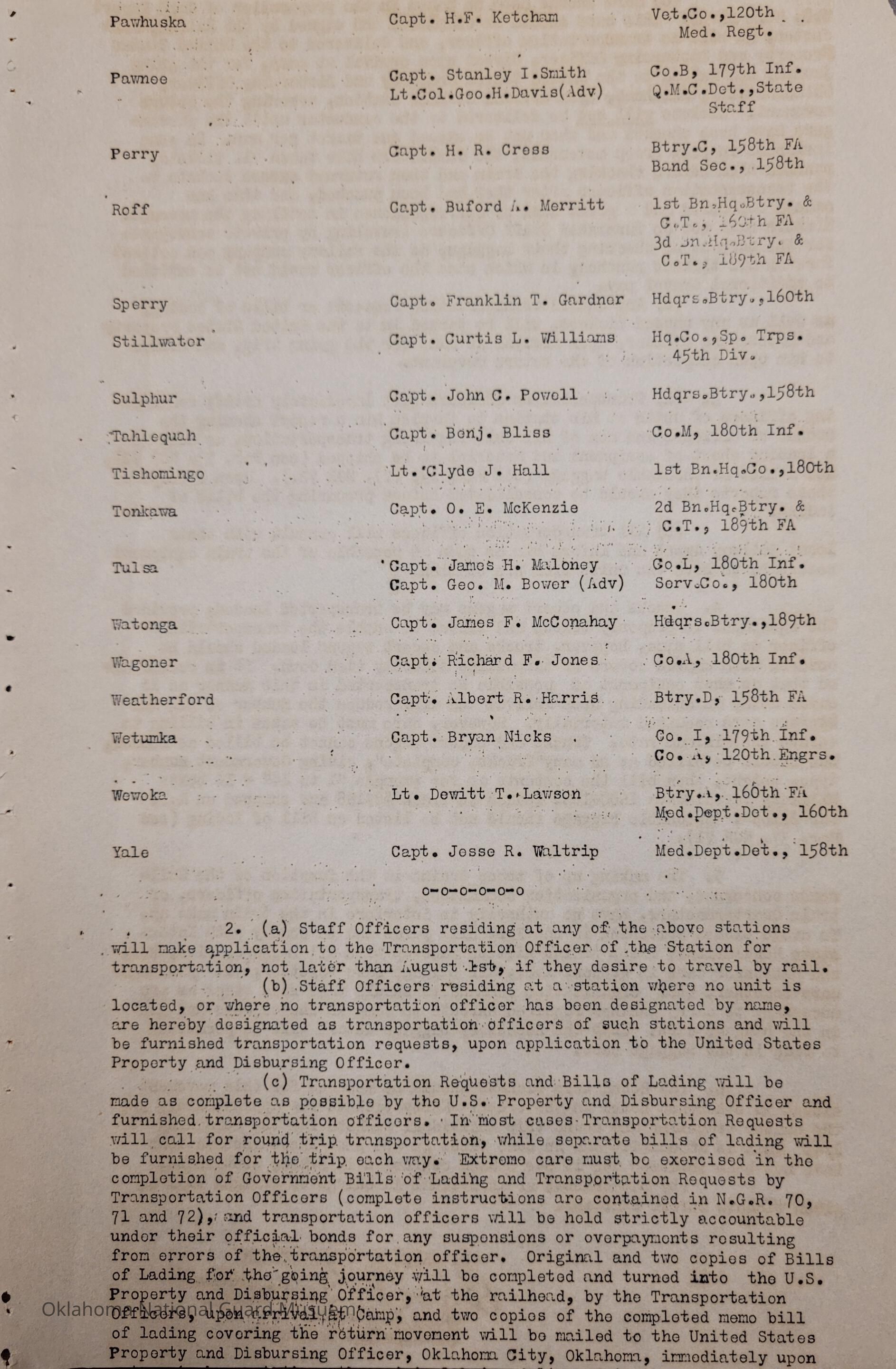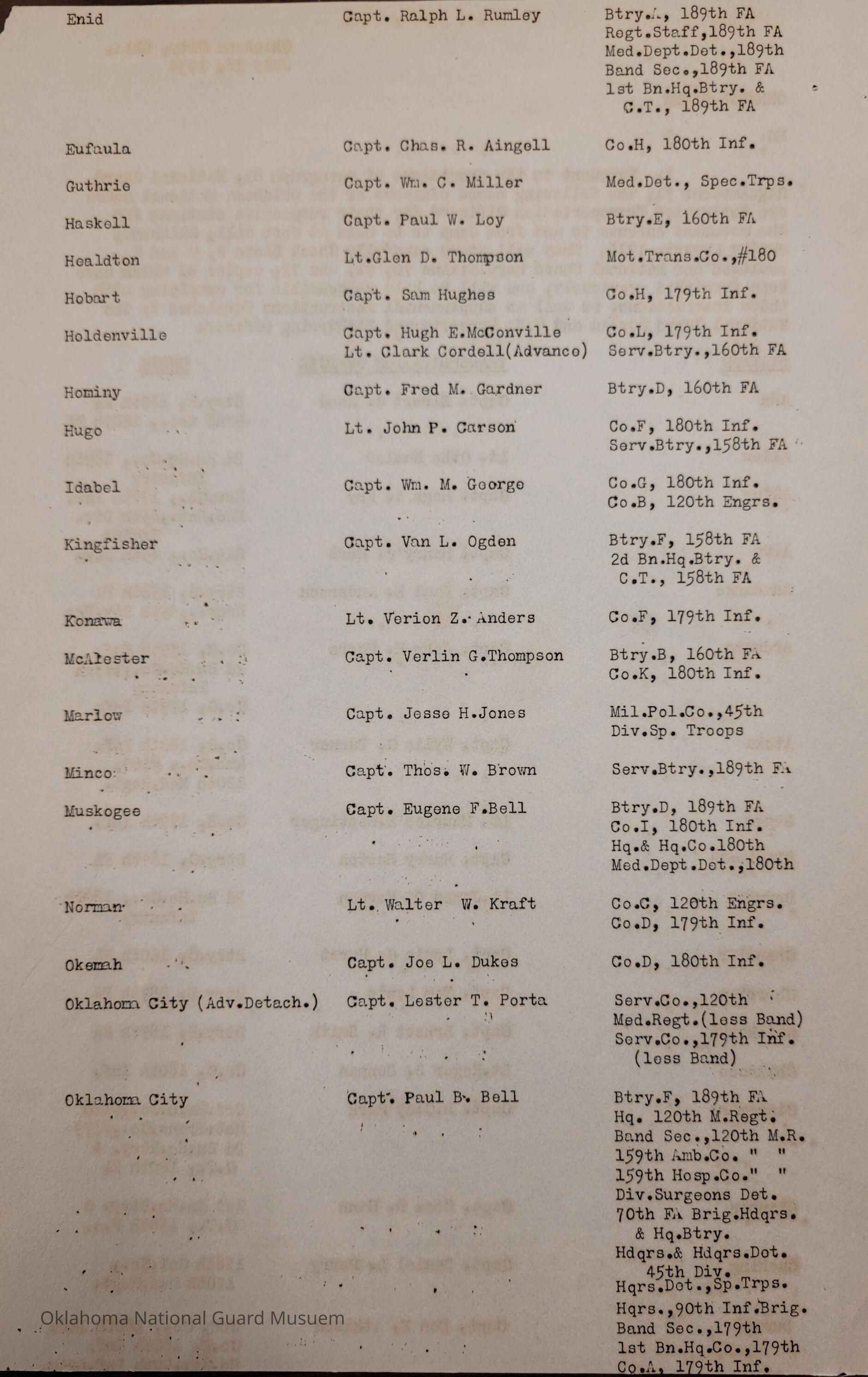 Adjutant General, Oklahoma City, Charles F. Barrett, Transportation officers, Ada, Elbert G. Reed, 160th Field Artillery, Allen, Otho Butler, 180th Infantry, Alva, Henry J. Hort, 45th Signal Company, Anadarko, Paul E. Anderson, 158th Field Artillery, Ardmore, John H. Moore, Atoka, Wylie C. Turner, 120th Medical Regiment, 160th Ambulance Company, Beggs, Maurice E. Bettinger, Blackwell, Harry Huston, 189th Field Artillery, Boynton, James O. Vernon, Chandler, Louis G. Hurst, 160th Field Artillery, Cherokee, Tom Lewis, Chickasha, Earnest R. Smith, Chilocco, Roger S. Denman, Claremore, H. Clay Park, Cushing, Daniel F. Perry, Durant, Don E. Atkinson, 90th Infantry Brigade, Edmond, Byron F. Jolly, Enid, Ralph L. Rumley, Eufaula, Charles A. Aingell, Guthrie, William C. Miller, Special Troops, Haskell, Paul W. Loy, Healdton, Glenn D. Thompson, Hobart, Sam Hughes, Holdenville, Hugh E. McConville, Clark Cordell, Hominy, Fred M. Gardner, Hugo, John P. Carson, Idabel, William M. George, 120th Engineers, Kingfisher, Van L. Ogden, Konawa, Verion Z. Anders, McAlester, Verlin G. Thompson, Marlow, Jesse H. Jones, Minco, Thomas W. Brown, Muskogee, Eugene F. Bell, Norman, Walter W. Kraft, Okemah, Joe L. Dukes, Paul B. Bell, Lester T. Porta, 70th Field Artillery Brigade, Pawhuska, H.F. Ketcham, Pawnee, Stanley I. Smith, George H. Davis, Perry, Howard R. Cress, Roff, Buford A. Merritt, Sperry, Franklin T. Gardner, Stillwater, Curtis L. Williams, Sulphur, John C. Powell, Tahlequah, Benjamin Bliss, Tishomingo, Clyde J. Hall, Tonkawa, O.E. McKenzie, Tulsa, James H. Maloney, George M. Bower, Watonga, James F. McConahay, Wagoner, Richard H. Jones, Weatherford, Albert R. Harris, Wetumka, Byron Nicks, Altus, Hugh A. Fry, Clinton, George D. Hann, Weowka, Dewitt T. Lawson, Yale, Jesse R. Waltrip