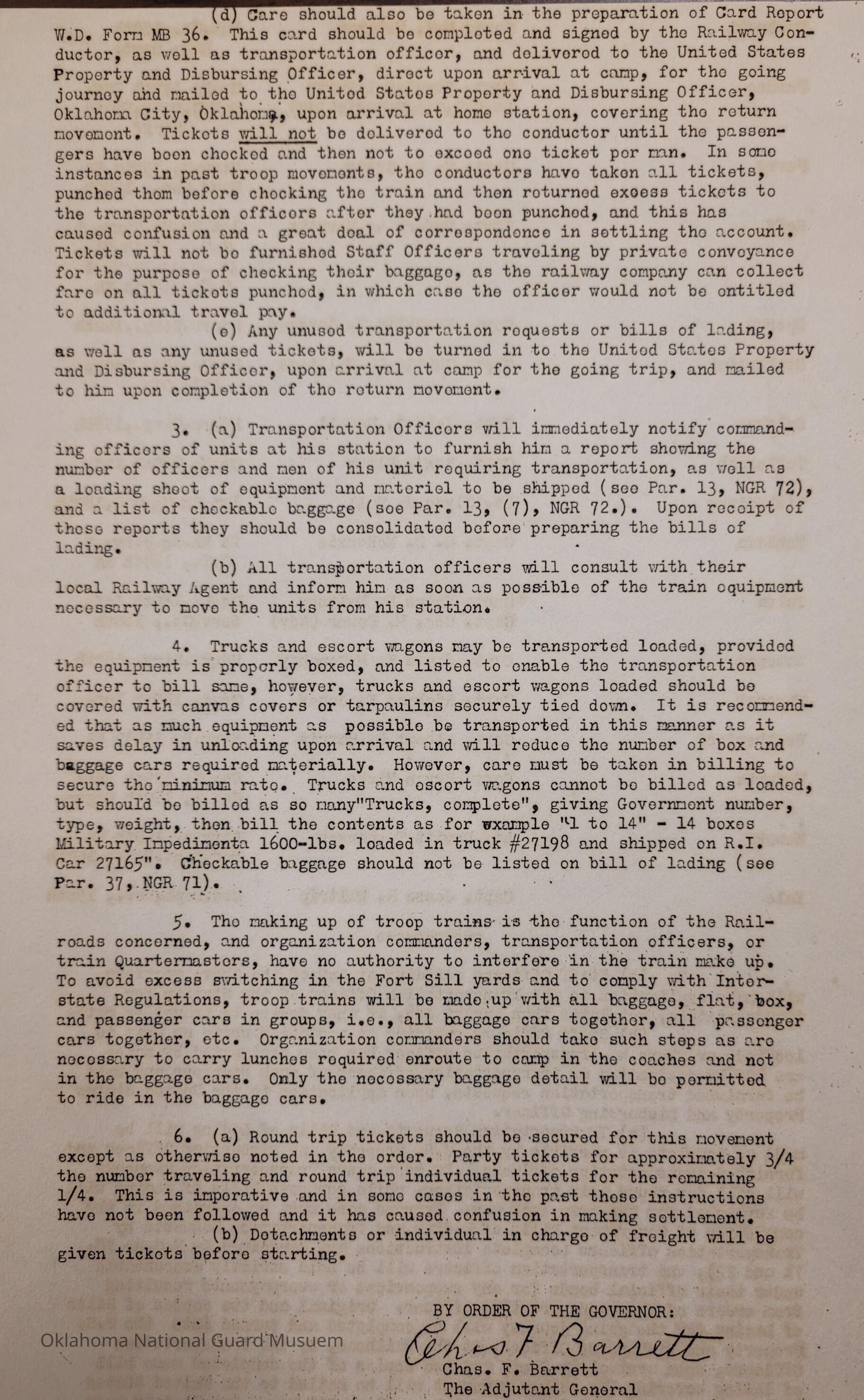 General Order #3 from Headquarters Adjutant General's Office in Oklahoma City. The order designates transportation officers and their respective units and stationsDate(s) of Creation
