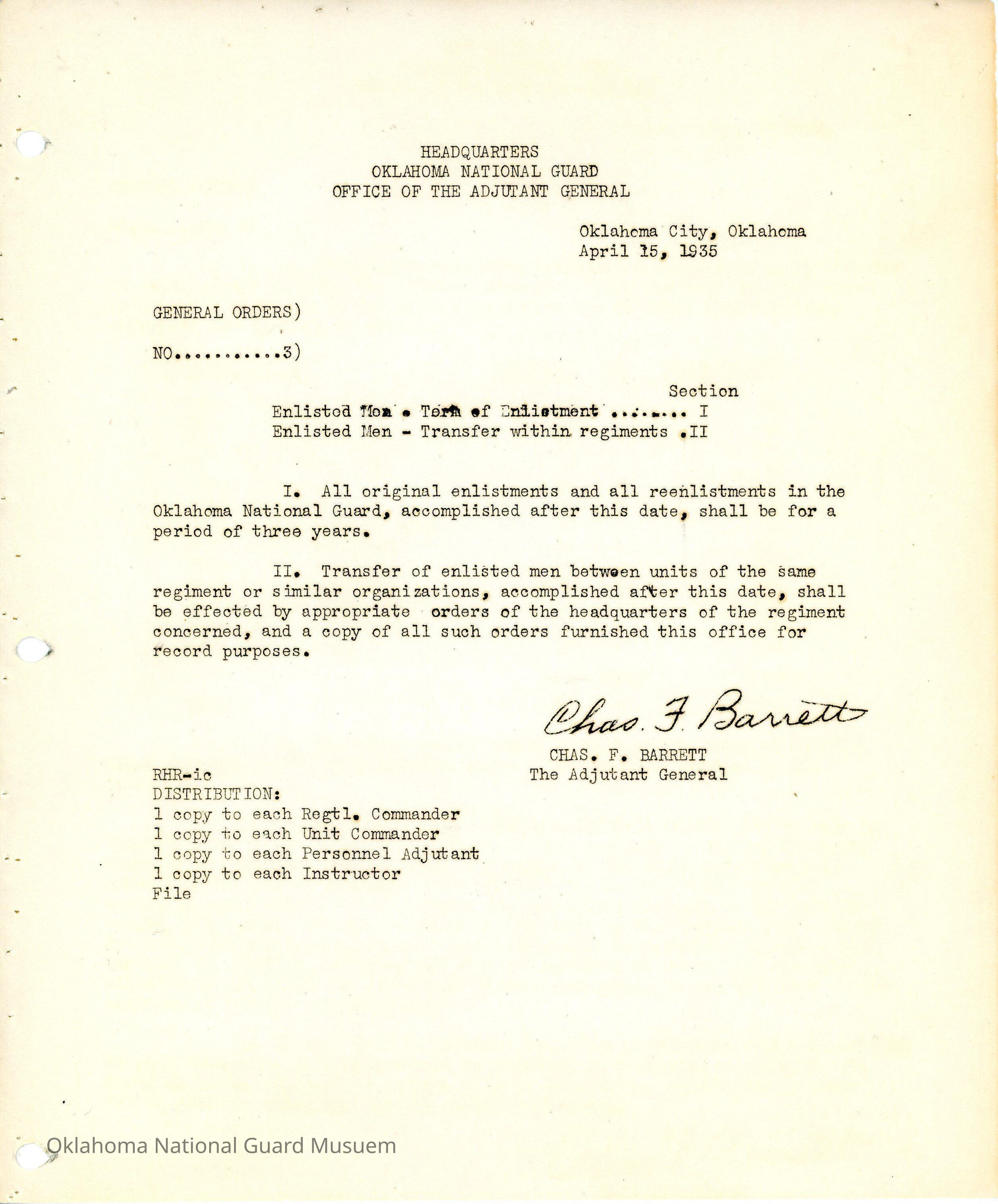 General Order #3 from Headquarters Adjutant General's Office in Oklahoma City. The order details the term of enlistment period of three years in the Oklahoma National Guard.Date(s) of Creation