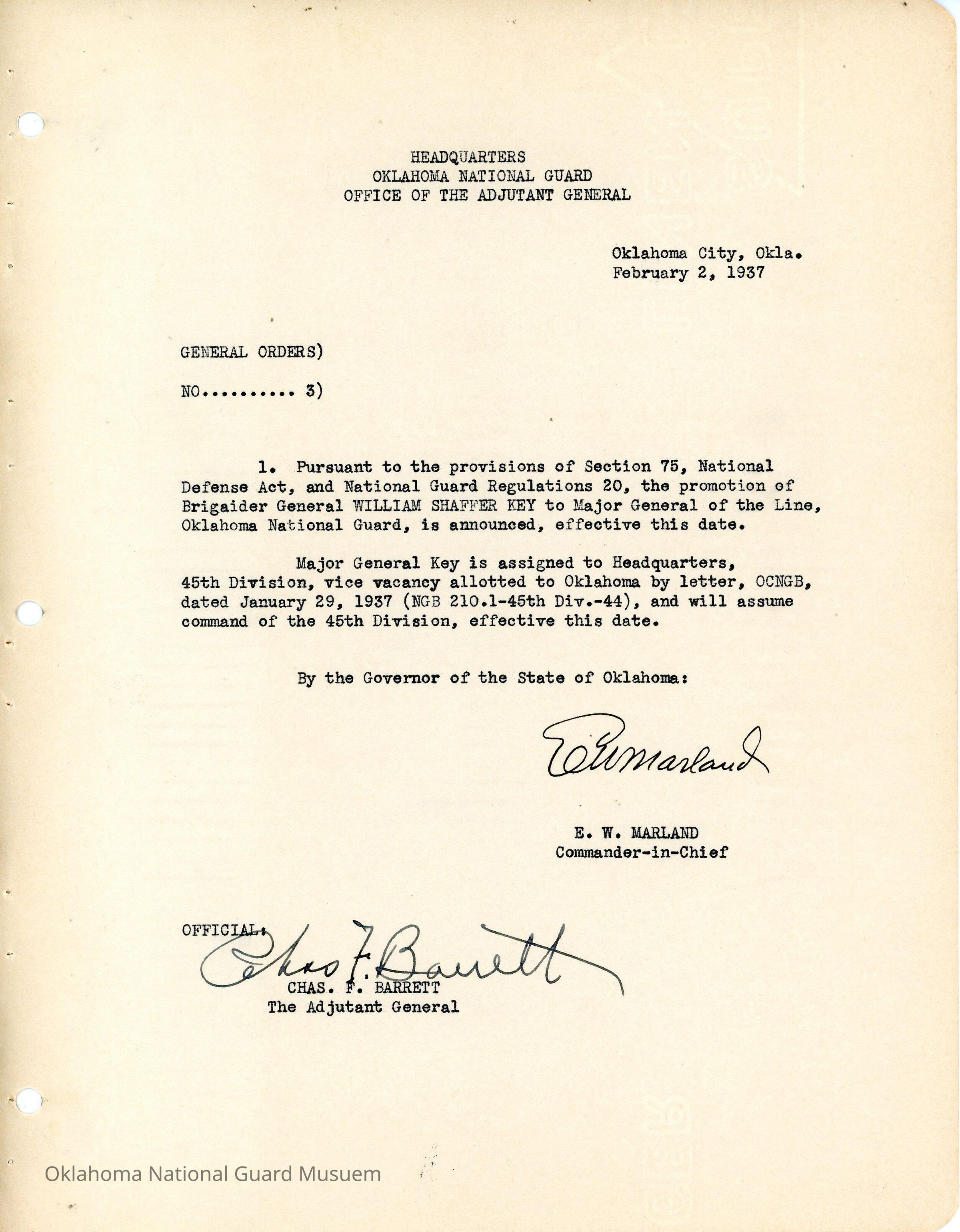 Adjutant General, Oklahoma City, Charles F. Barrett, E.W. Marland, William S. Key, 45th Division, Promotion