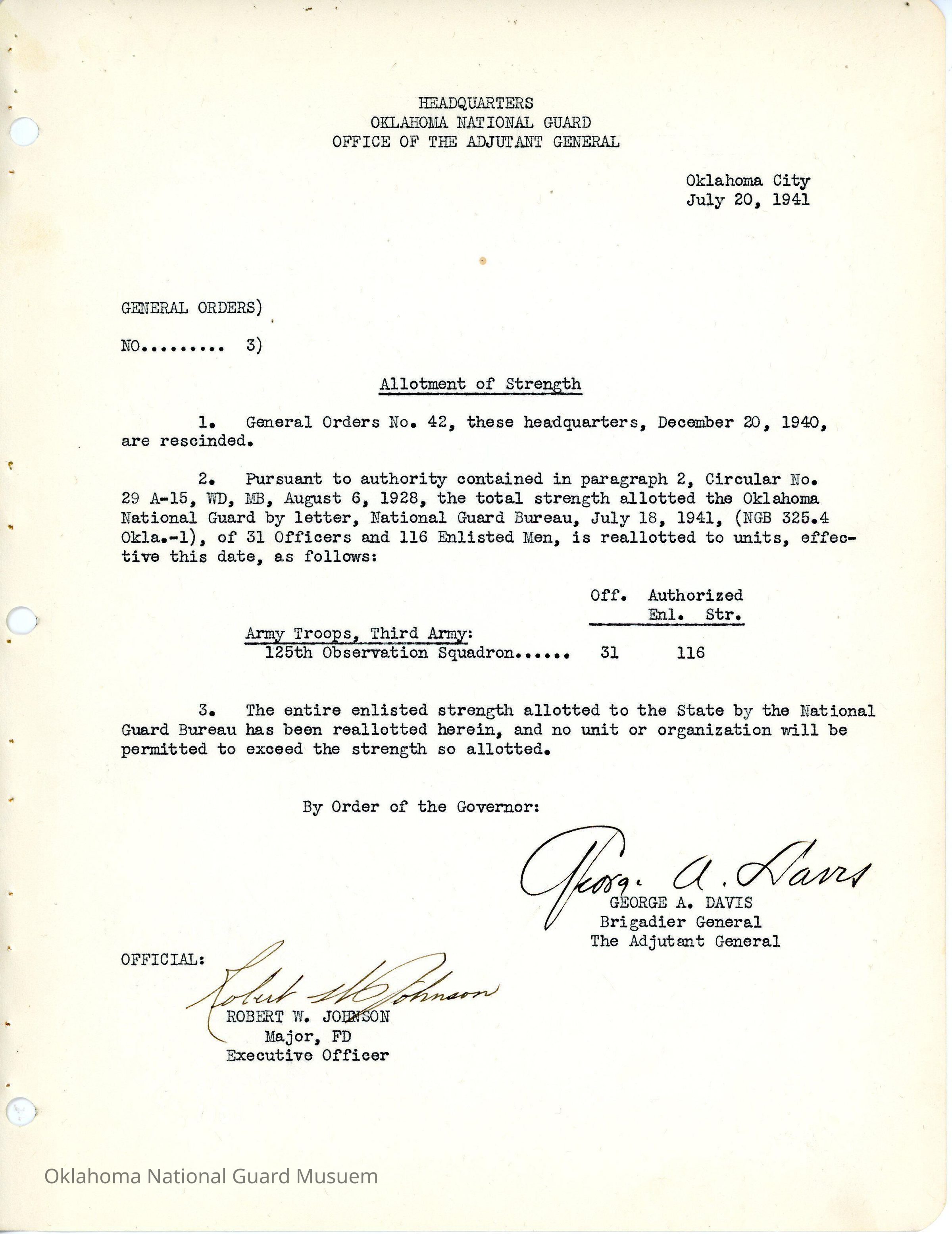 Adjutant General, Oklahoma City, George A. Davis, Robert W. Johnson, 125th Observation Squadron, Allotment of Strength, Rescind