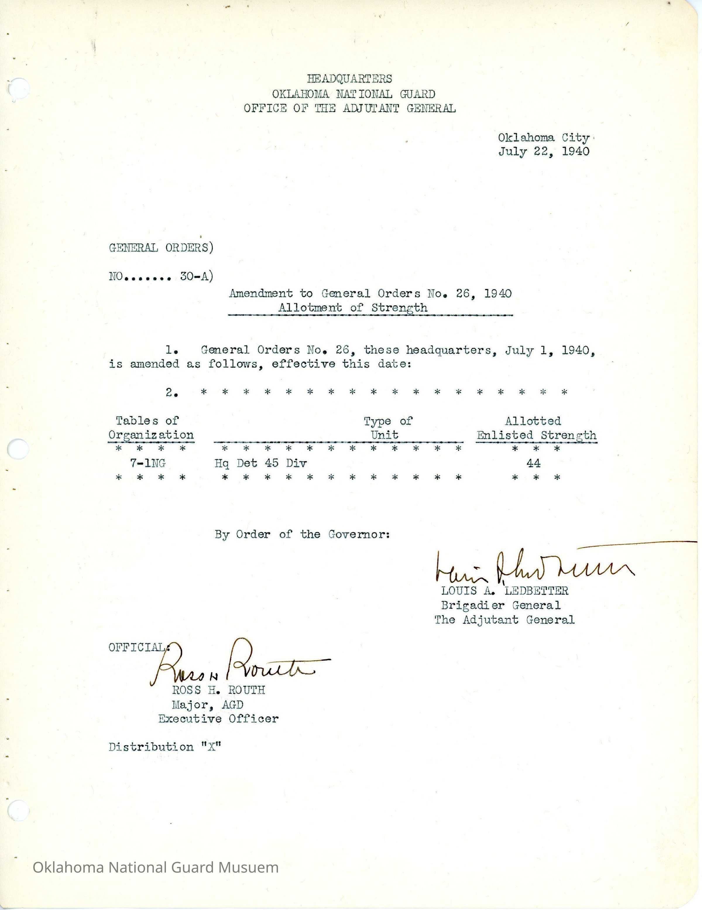 General Order #30-A from Headquarters Adjutant General's Office in Oklahoma City. The order amends General Order #26 1940 and establishes new strength allotment numbers for the Oklahoma GuardDate(s) of Creation