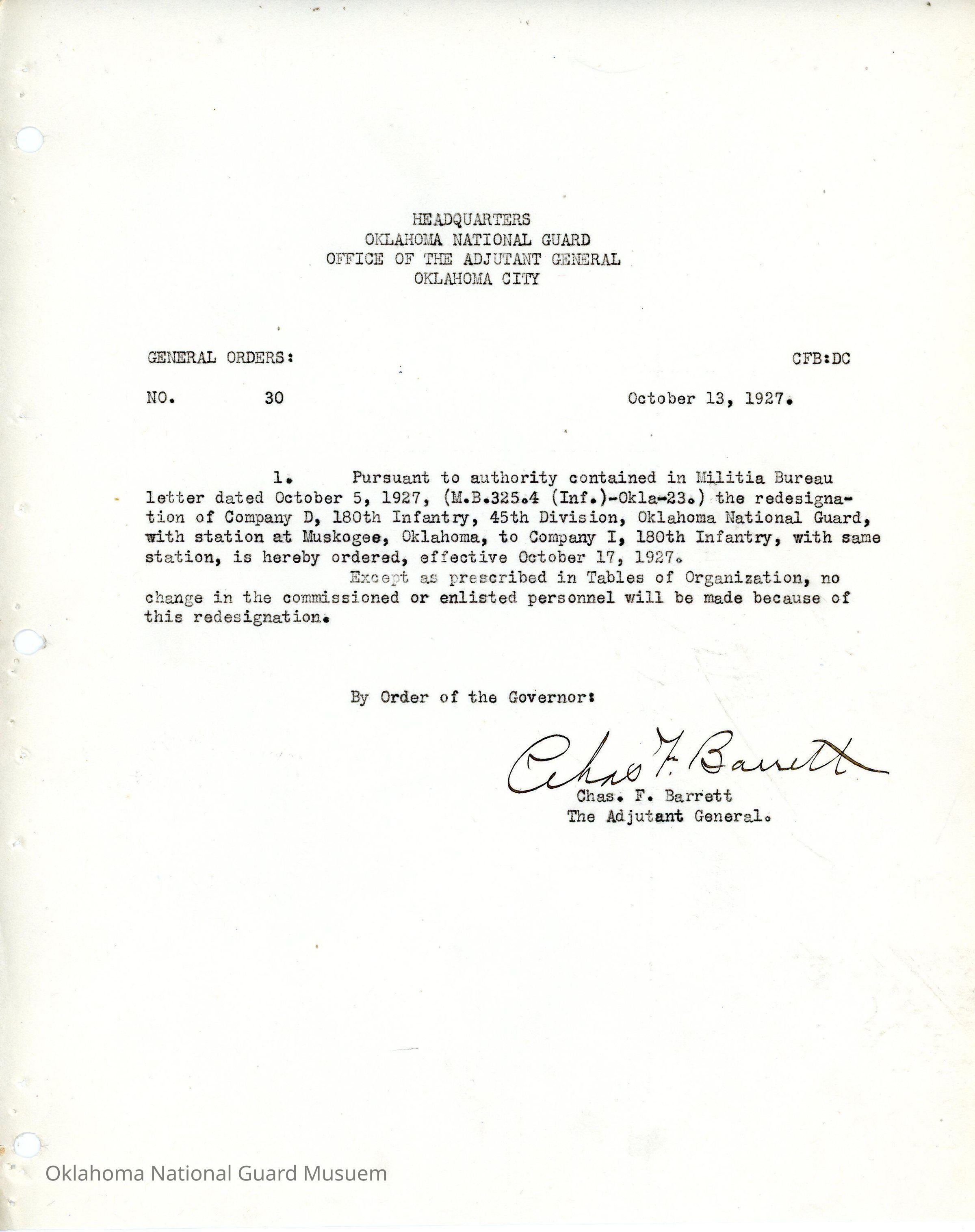 General Order #30 from Headquarters Adjutant General's Office in Oklahoma City. The order re-designates Company D 180th Infantry located in Muskogee to Company I 180th InfantryDate(s) of Creation