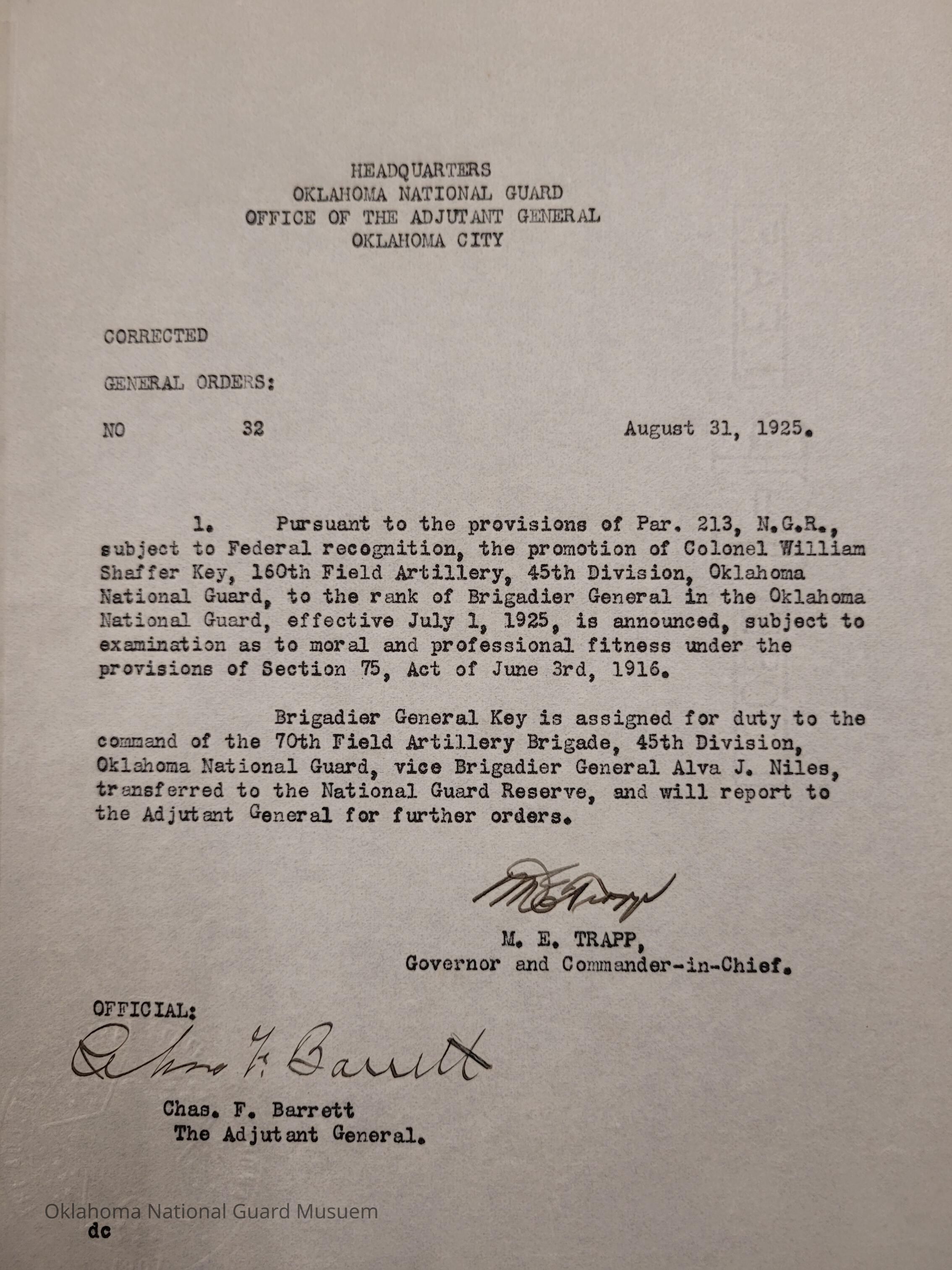 General Order #32 from Headquarters Adjutant General's Office in Oklahoma City. The order promotes William S. Key to Brigadier General and assigns him to command the 70th Field Artillery Brigade after Alva J. Niles transferred to the National Guard ReservesDate(s) of Creation