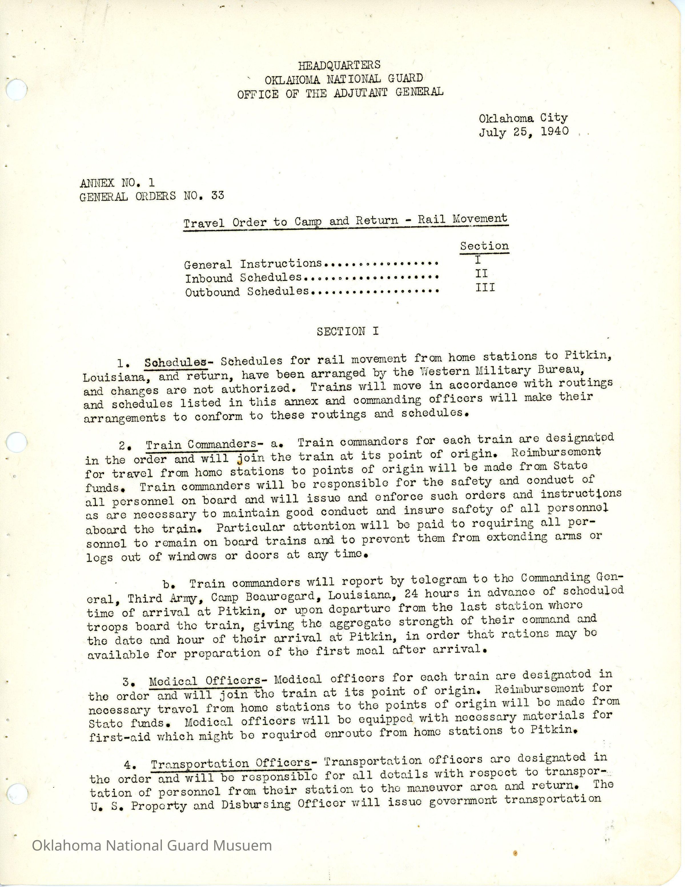 General Order #33 Annex 1 from Headquarters Adjutant General's Office in Oklahoma City. This order details the train schedule to and from Pitkin, Louisiana for field trainingDate(s) of Creation