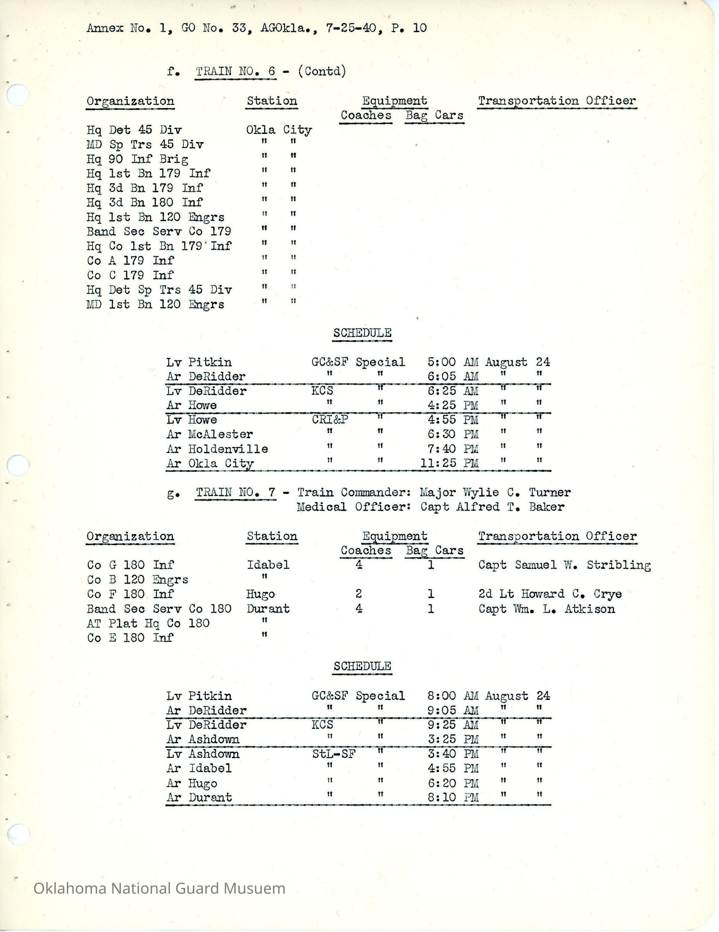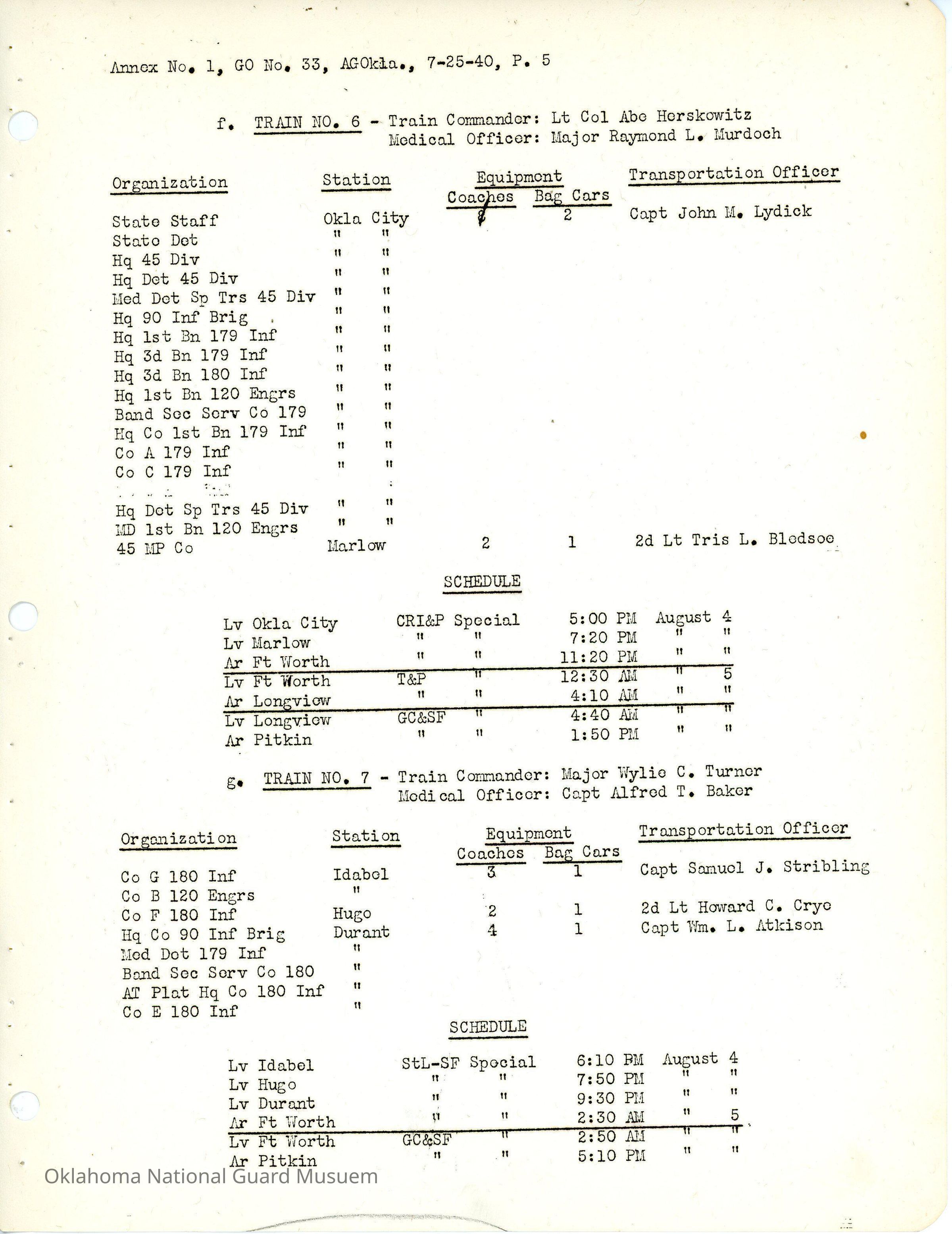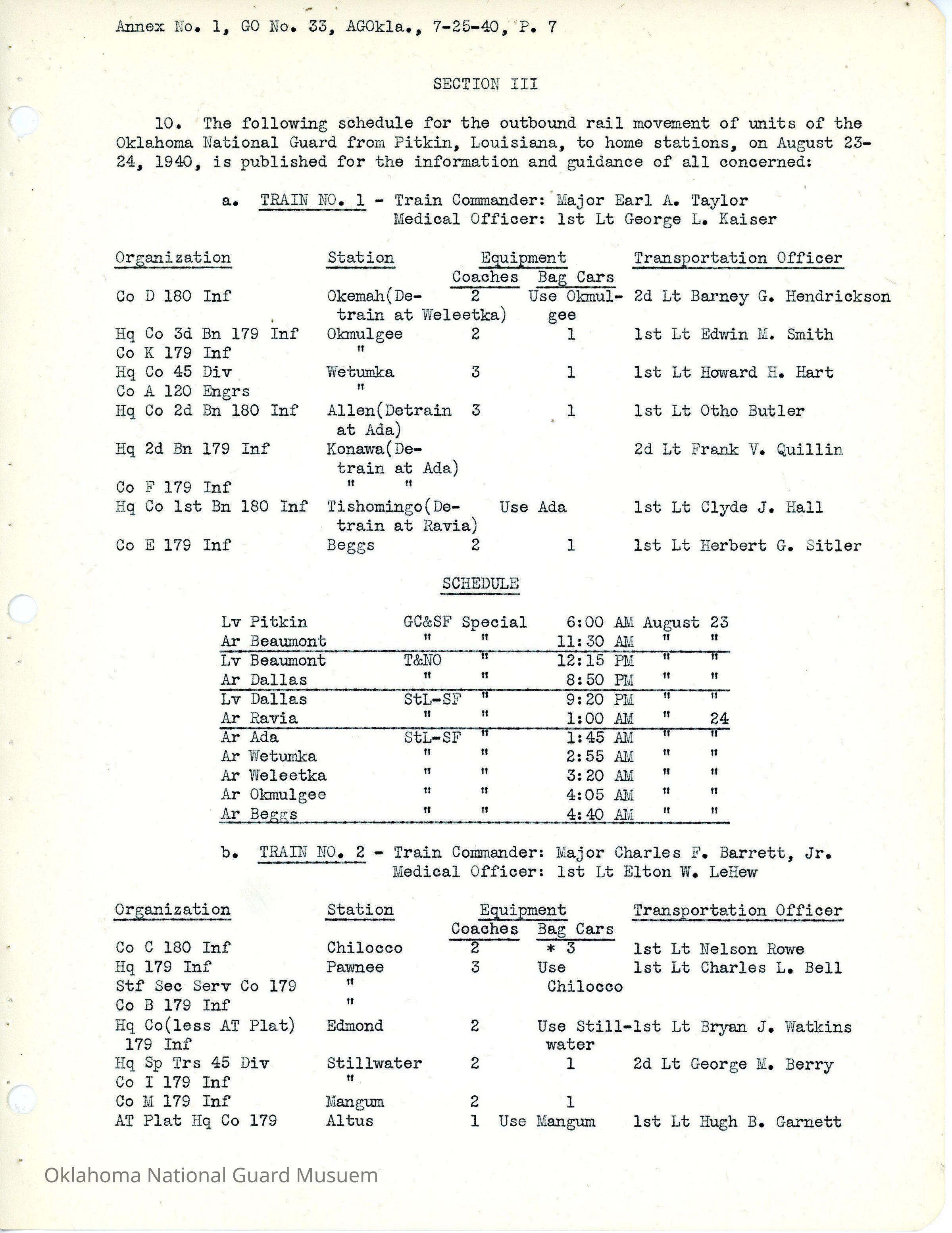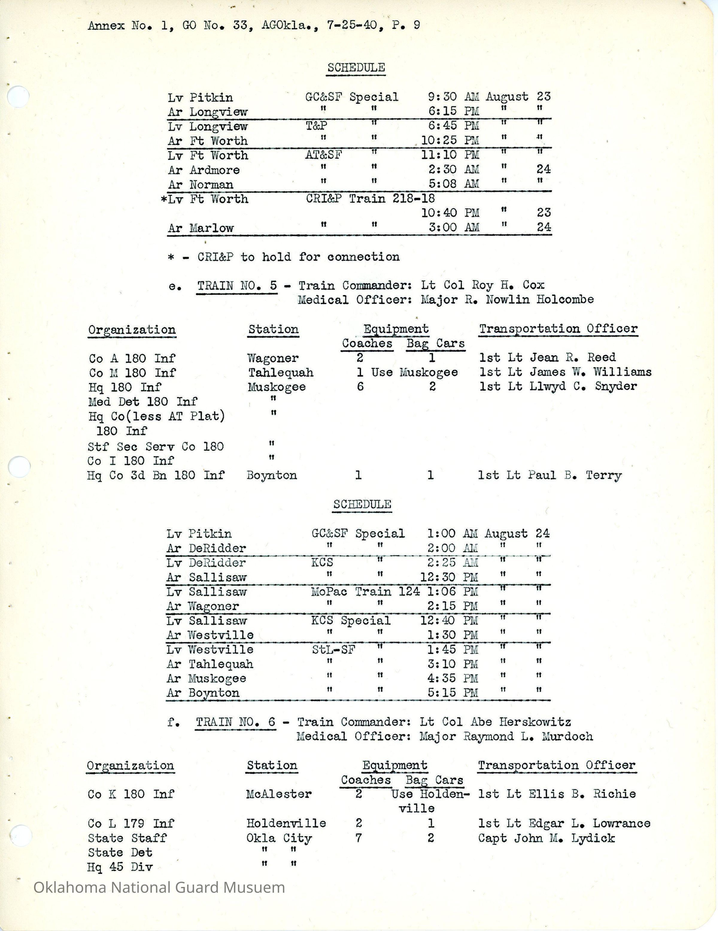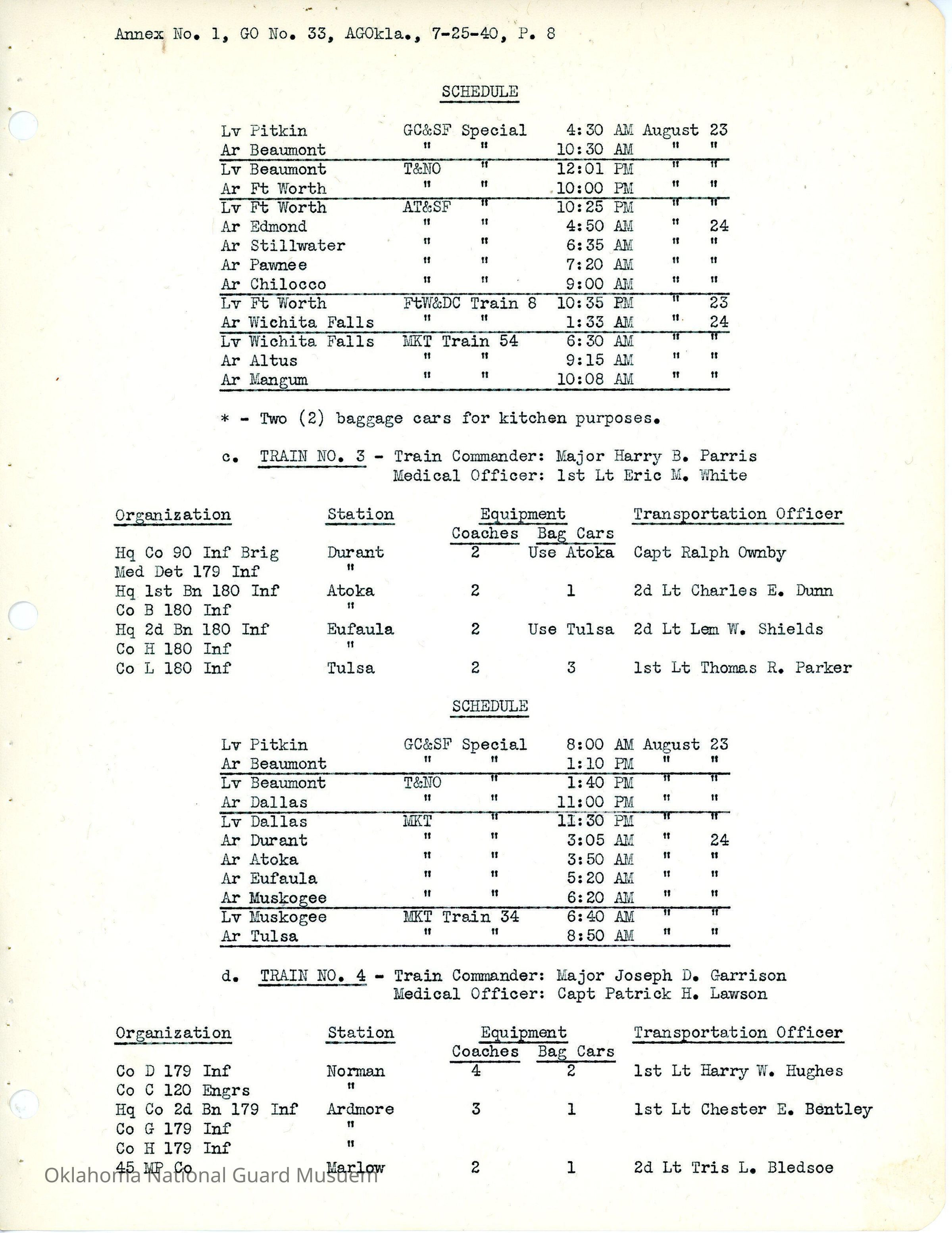 Adjutant General, Oklahoma City, 45th Division, Louisiana, Schedule, Western Military Bureau, Camp Beauregard, Harry B. Parris, Carson L. Oglesbee, Medical Officer, Transportation Officer, 180th Infantry, Eufaula, McAlester, Atoka, Lem W. Shields, Train Commander, Ellis D. Richie, Charles E. Dunn, Fort Worth, Texas, Joseph D. Garrison, Patrick H. Lawson, 179th Infantry, 120th Engineers, Norman, Ardmore, Harry W. Hughes, Chester E. Bentley, Purcell, Earl A. Taylor, George L. Kaiser, 45th Division, Wetumka, Holdenville, Allen, Ada, Konawa, Tishomingo, Ravia, 158th Field Artillery, Howard H. Hart, Edgar L. Lowrance, Otho Butler, Frank V. Quillin, 160th Field Artillery, Clyde J. Hall, Charles F. Barrett Jr., Elton W. LeHew, Chilocco, Pawnee, Edmond, Stillwater, Mangum, Altus, Nelson Rowe, Charles L. Bell, Bryan J. Watkins, George M. Berry, C.C. Tillman, Hugh B. Garnett, Wichita Falls, Roy H. Cox, Nowlin Holcombe, Wagoner, Muskogee, Jean R. Reed, Llwyd C. Snyder, Dallas, Longview, Abe Herskowitz, Raymond L. Murdoch, John M. Lydick, 90th Infantry Brigade, Marlow, Tris L. Bledsoe, Wylie C. Turner, Alfred T. Baker, Idabel, Hugo, Durant, Samuel J. Stribling, Howard C. Crye, WIlliam L. Atkison, Tulsa, Beggs, Tahlequah, Boynton, Okmulgee, Weleetka, Thomas R. Parker, Herberg G. Sitler, James W. Williams, Paul B. Terry, Edwin M. Smith, Barney G. Hendrickson, Bryan W. Nolen, Eric M. White, Ralph Ownby