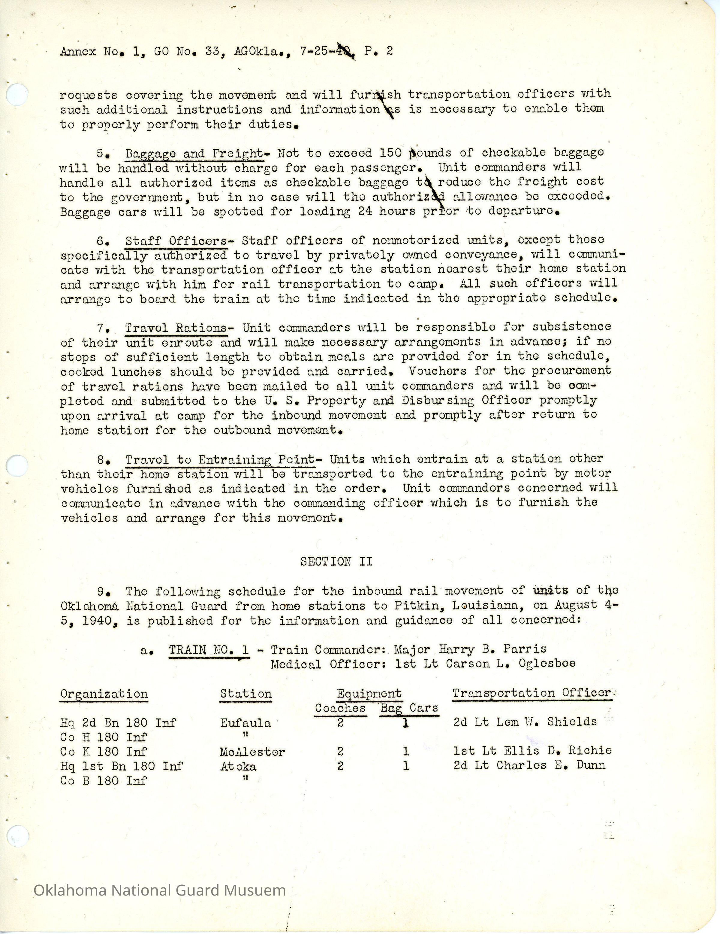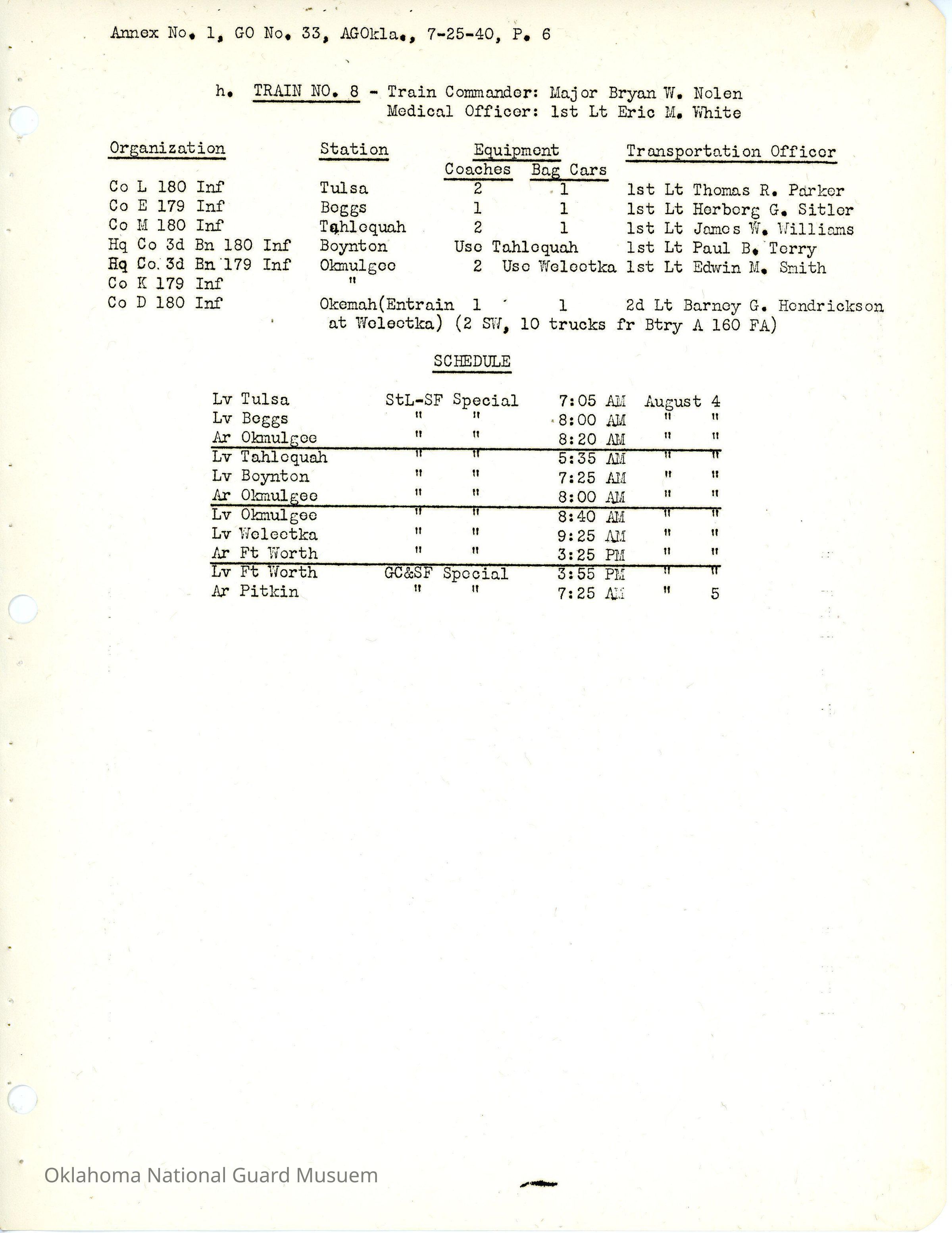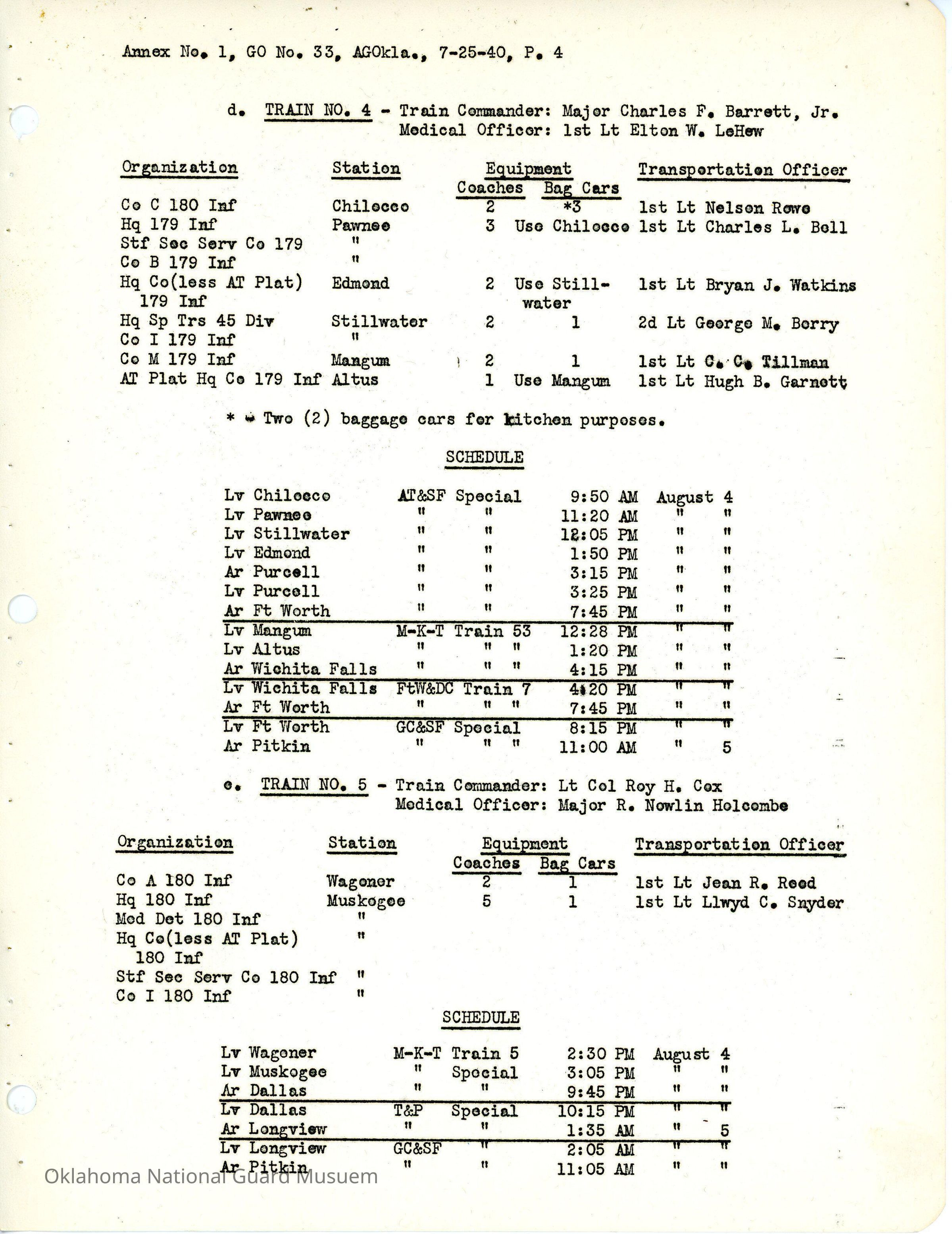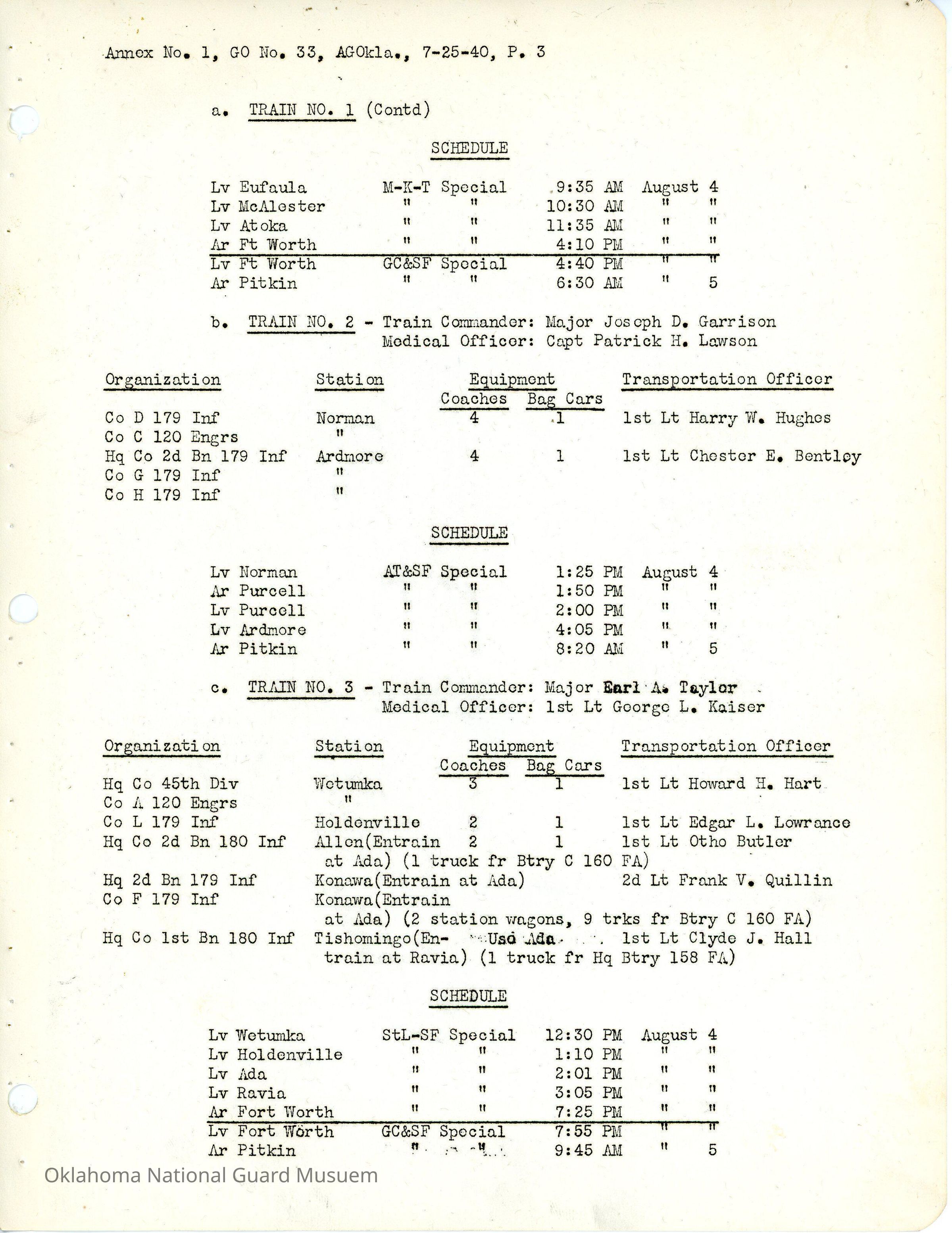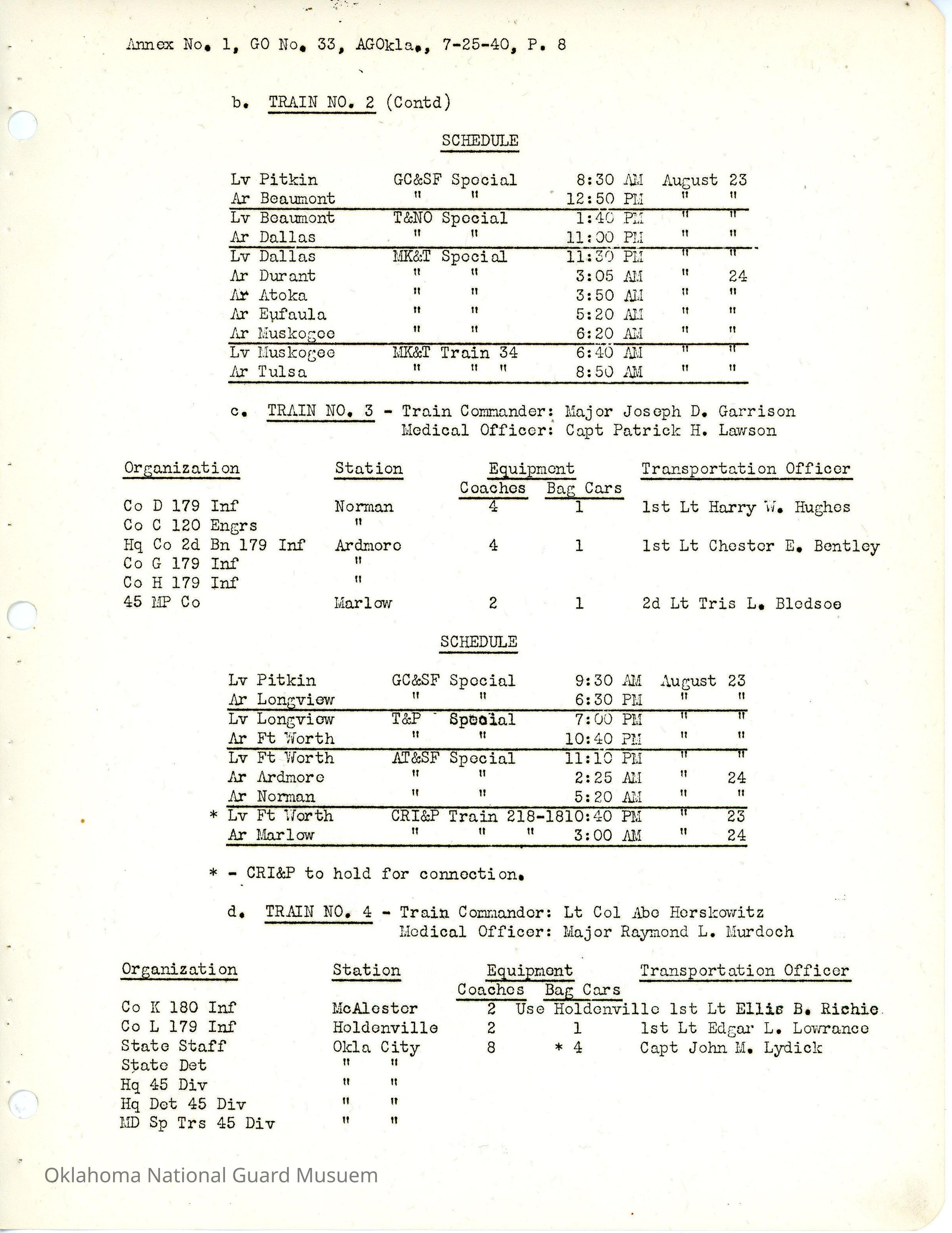 Adjutant General, Oklahoma City, 45th Division, Louisiana, Schedule, Western Military Bureau, Camp Beauregard, Harry B. Parris, Carson L. Oglesbee, Medical Officer, Transportation Officer, 180th Infantry, Eufaula, McAlester, Atoka, Lem W. Shields, Train Commander, Ellis D. Richie, Charles E. Dunn, Fort Worth, Texas, Joseph D. Garrison, Patrick H. Lawson, 179th Infantry, 120th Engineers, Norman, Ardmore, Harry W. Hughes, Chester E. Bentley, Purcell, Earl A. Taylor, George L. Kaiser, 45th Division, Wetumka, Holdenville, Allen, Ada, Konawa, Tishomingo, Ravia, 158th Field Artillery, Howard H. Hart, Edgar L. Lowrance, Otho Butler, Frank V. Quillin, 160th Field Artillery, Clyde J. Hall, Charles F. Barrett Jr., Elton W. LeHew, Chilocco, Pawnee, Edmond, Stillwater, Mangum, Altus, Nelson Rowe, Charles L. Bell, Bryan J. Watkins, George M. Berry, C.C. Tillman, Hugh B. Garnett, Wichita Falls, Roy H. Cox, Nowlin Holcombe, Wagoner, Muskogee, Jean R. Reed, Llwyd C. Snyder, Dallas, Longview, Abe Herskowitz, Raymond L. Murdoch, John M. Lydick, 90th Infantry Brigade, Marlow, Tris L. Bledsoe, Wylie C. Turner, Alfred T. Baker, Idabel, Hugo, Durant, Samuel J. Stribling, Howard C. Crye, WIlliam L. Atkison, Tulsa, Beggs, Tahlequah, Boynton, Okmulgee, Weleetka, Thomas R. Parker, Herberg G. Sitler, James W. Williams, Paul B. Terry, Edwin M. Smith, Barney G. Hendrickson, Bryan W. Nolen, Eric M. White, Ralph Ownby