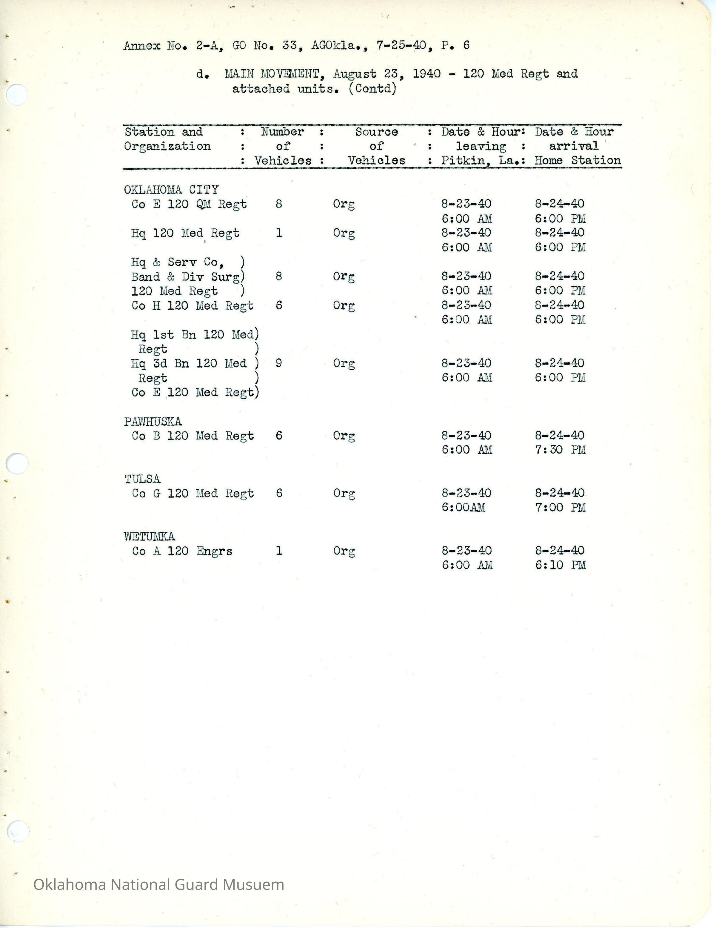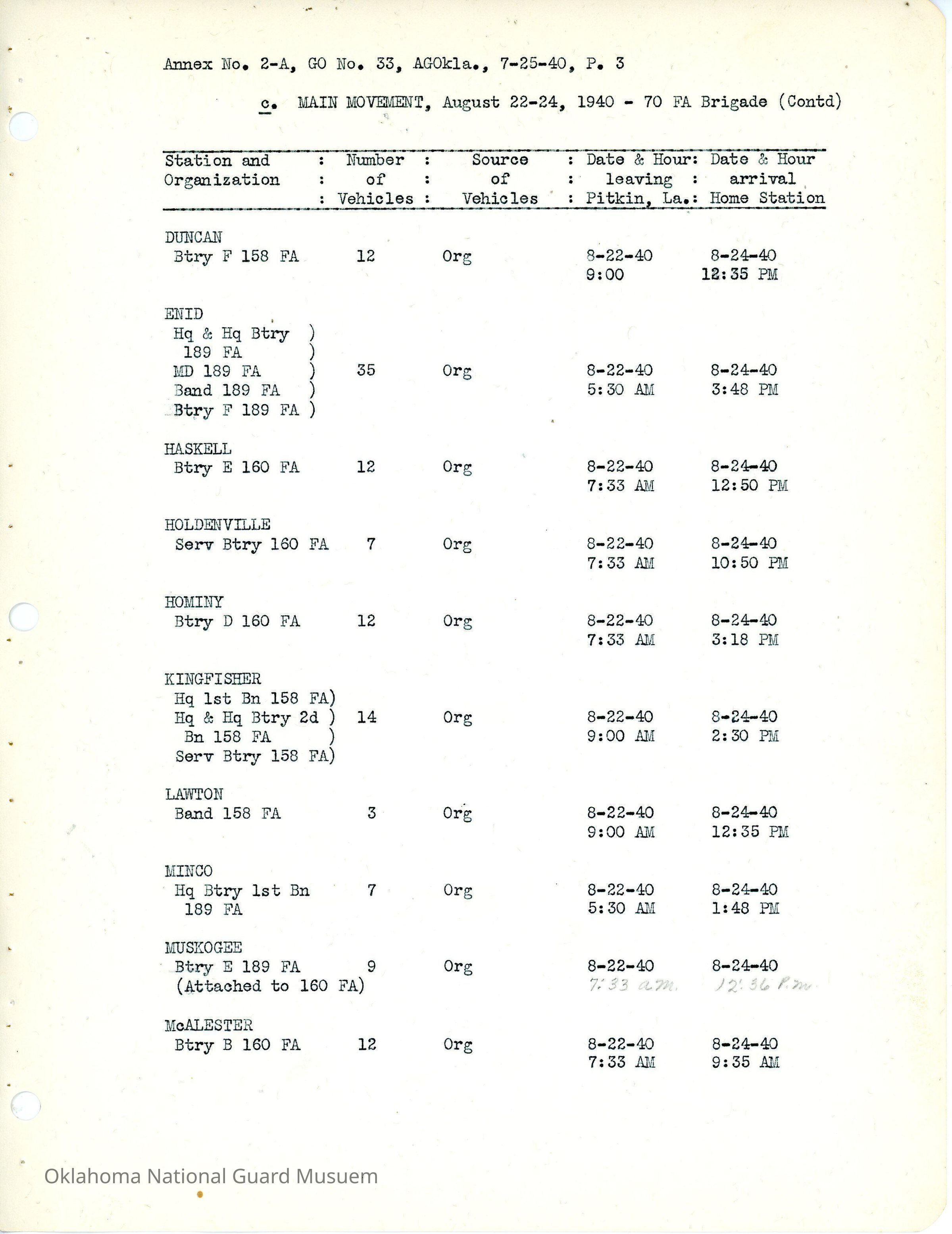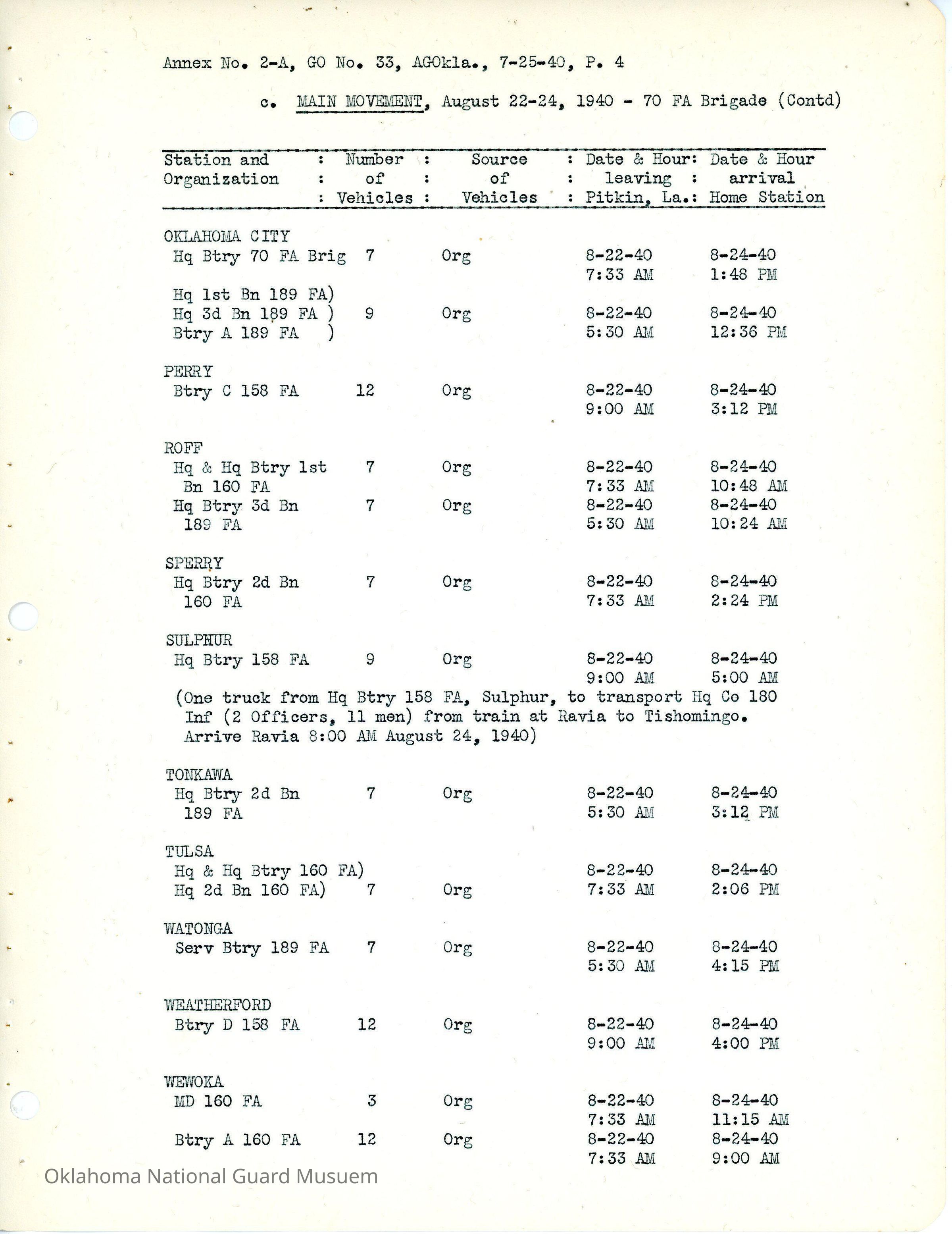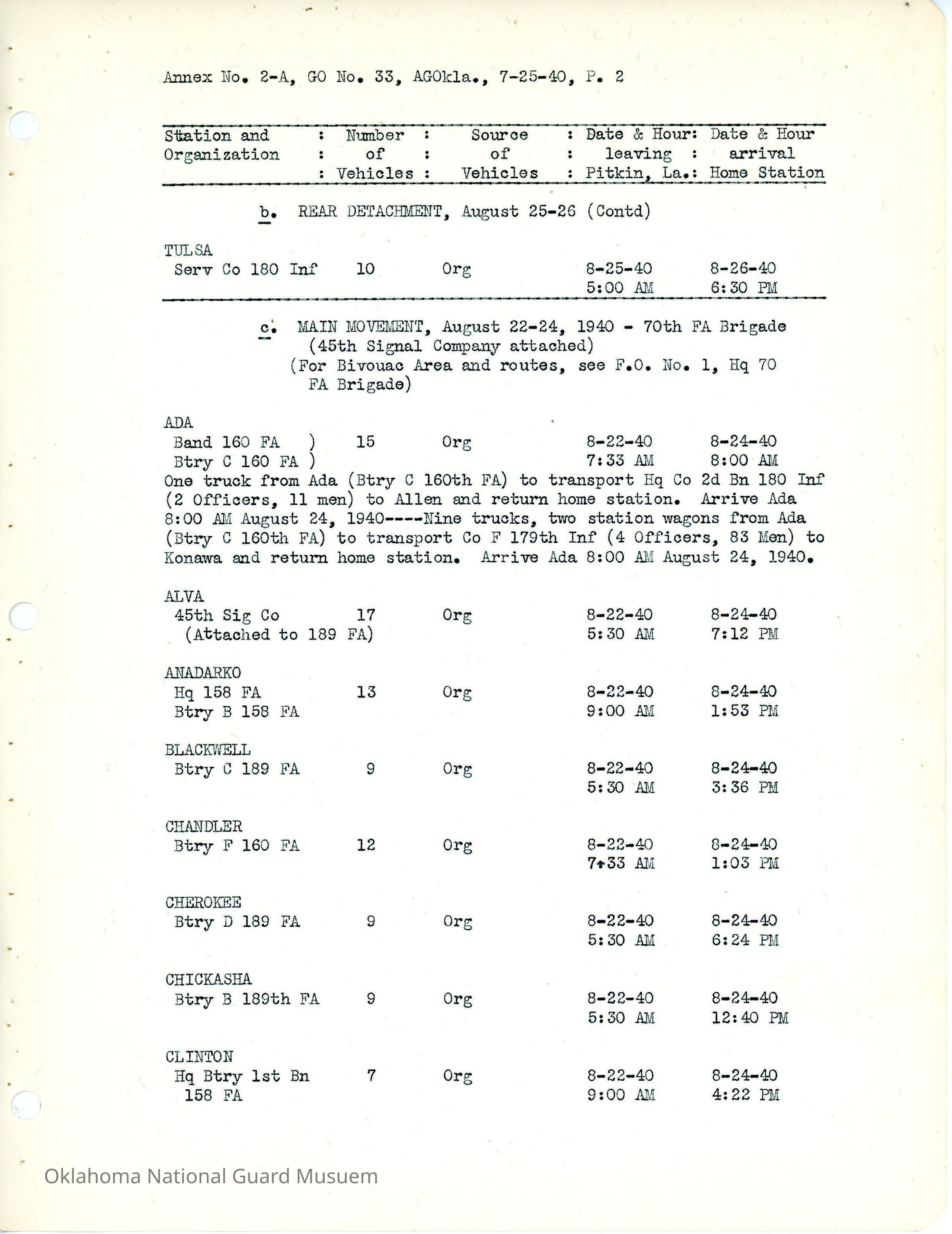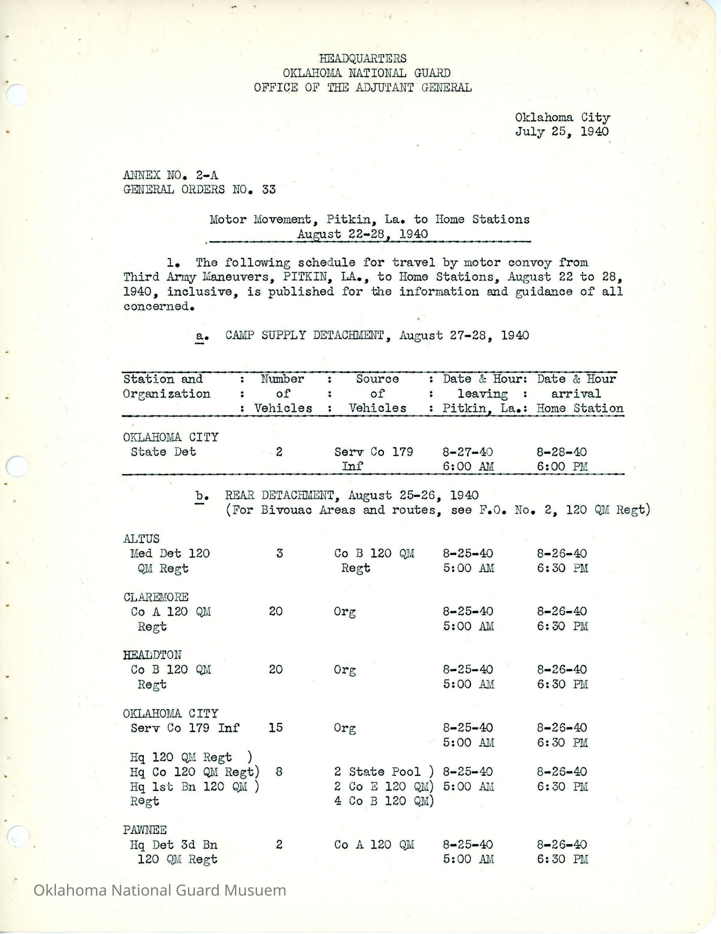 General Order #33 Annex 2-A from Headquarters Adjutant General's Office in Oklahoma City. This order details the truck schedule from Pitkin, Louisiana for field trainingDate(s) of Creation