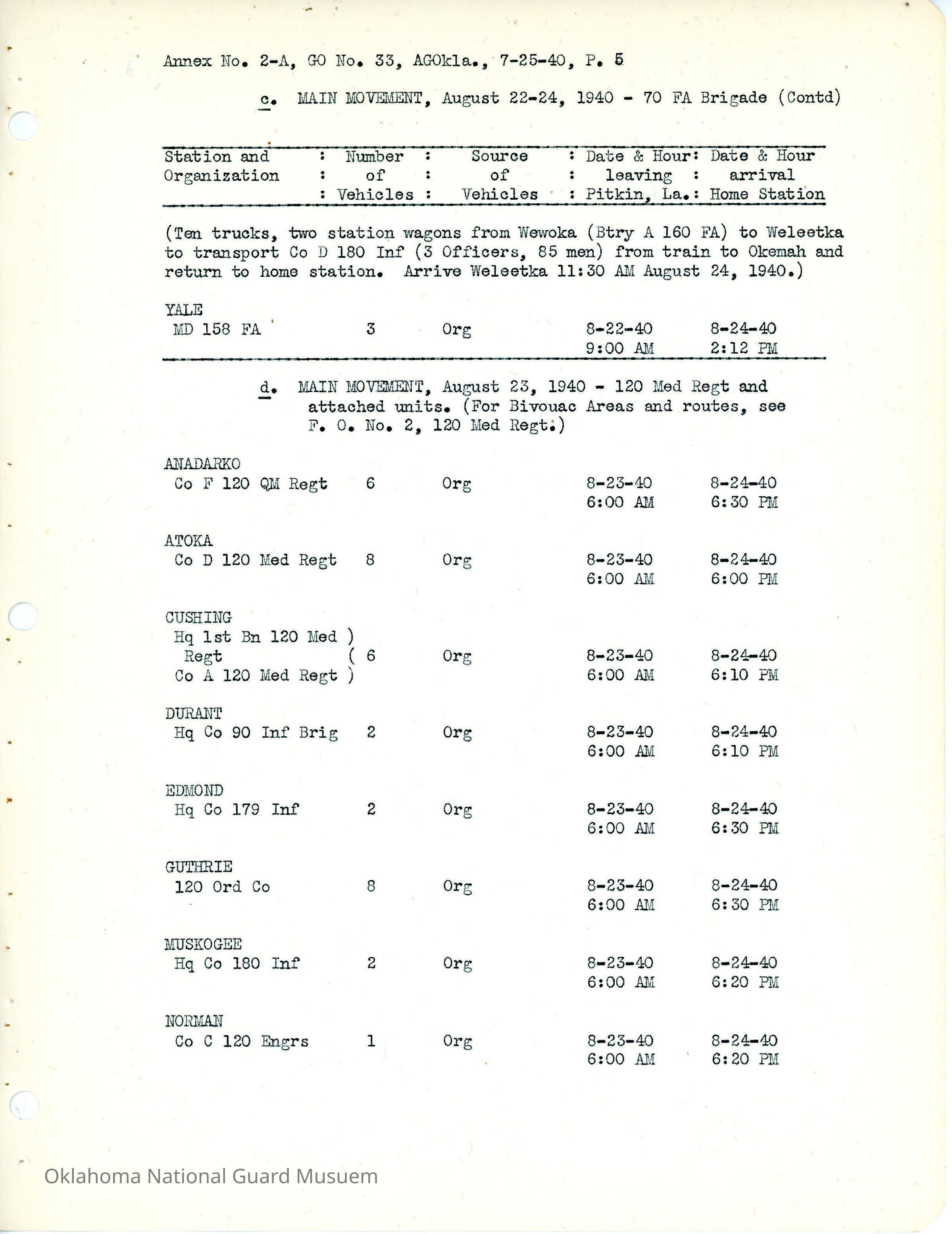 Adjutant General, Oklahoma City, 45th Division, Louisiana, Schedule, Western Military Bureau, Camp Beauregard, 179th Infantry, Altus, 120th Quartermaster Regiment, Claremore, Healdton, Pawnee, Tulsa, Ada, 160th Field Artillery, 180th Infantry, Allen, Konawa, Alva, 45th Signal Company, Anadarko, 158th Field Artillery, Blackwell, 189th Field Artillery, Chandler, Cherokee, Chickasha, Clinton, 70th Field Artillery Brigade, Duncan, Enid, Haskell, Holdenville, Hominy, Kingfisher, Lawton, Minco, Muskogee, McAlester, Perry, Roff, Sperry, Sulphur, Ravia, Tonkawa, Watonga, Weatherford, Wewoka, Yale, Okemah, Weleetka, Atoka, Cushing, Durant, Edmond, 120th Medical Regiment, 90th Infantry Brigade, Guthrie, 120th Ordinance Company, Muskogee, Norman, 120th Engineers, Pawhuska, Wetumka