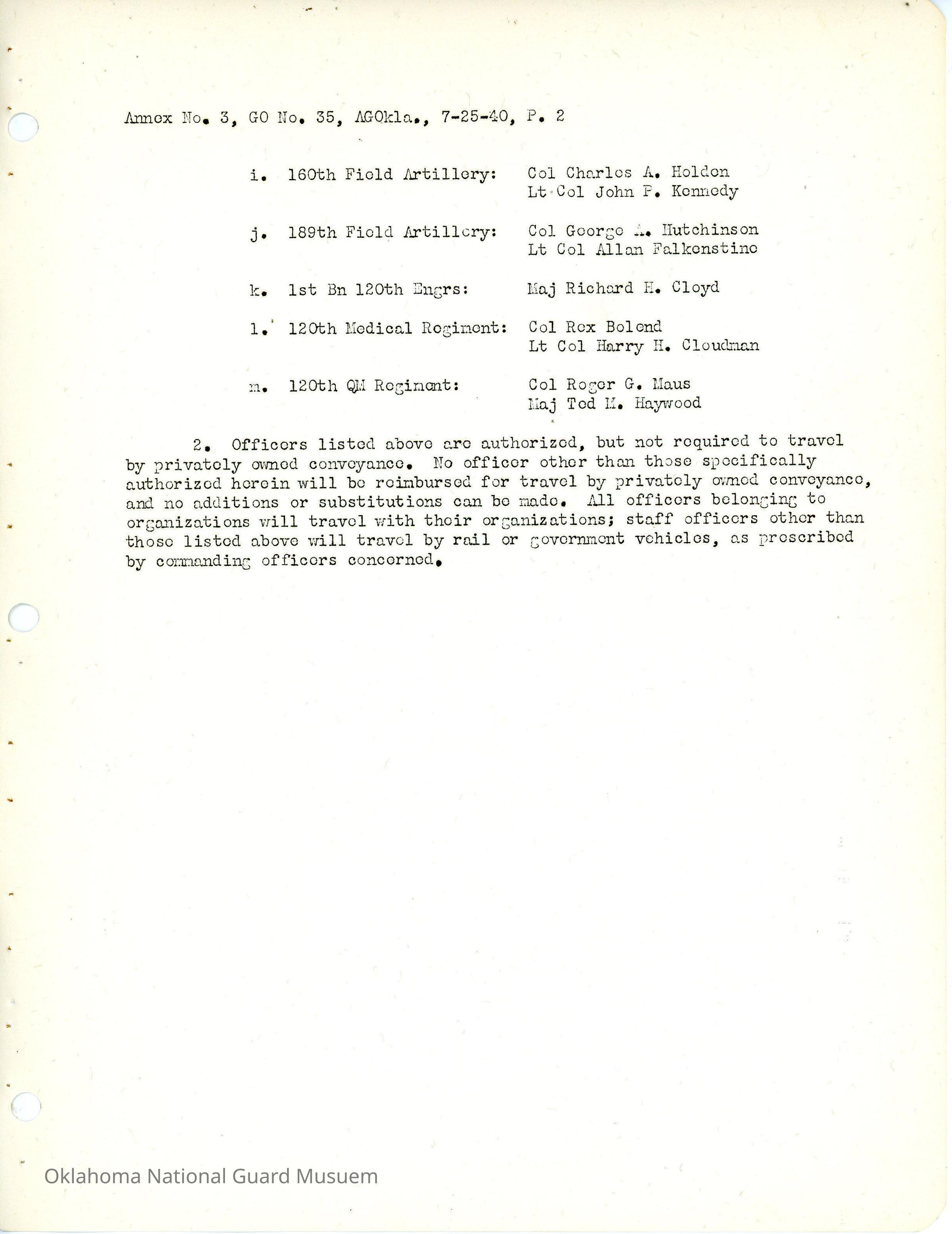 General Order #33 Annex 3 from Headquarters Adjutant General's Office in Oklahoma City. This order grants the following individuals the option to travel to Pitkin, Louisiana by personal vehicle for field trainingDate(s) of Creation
