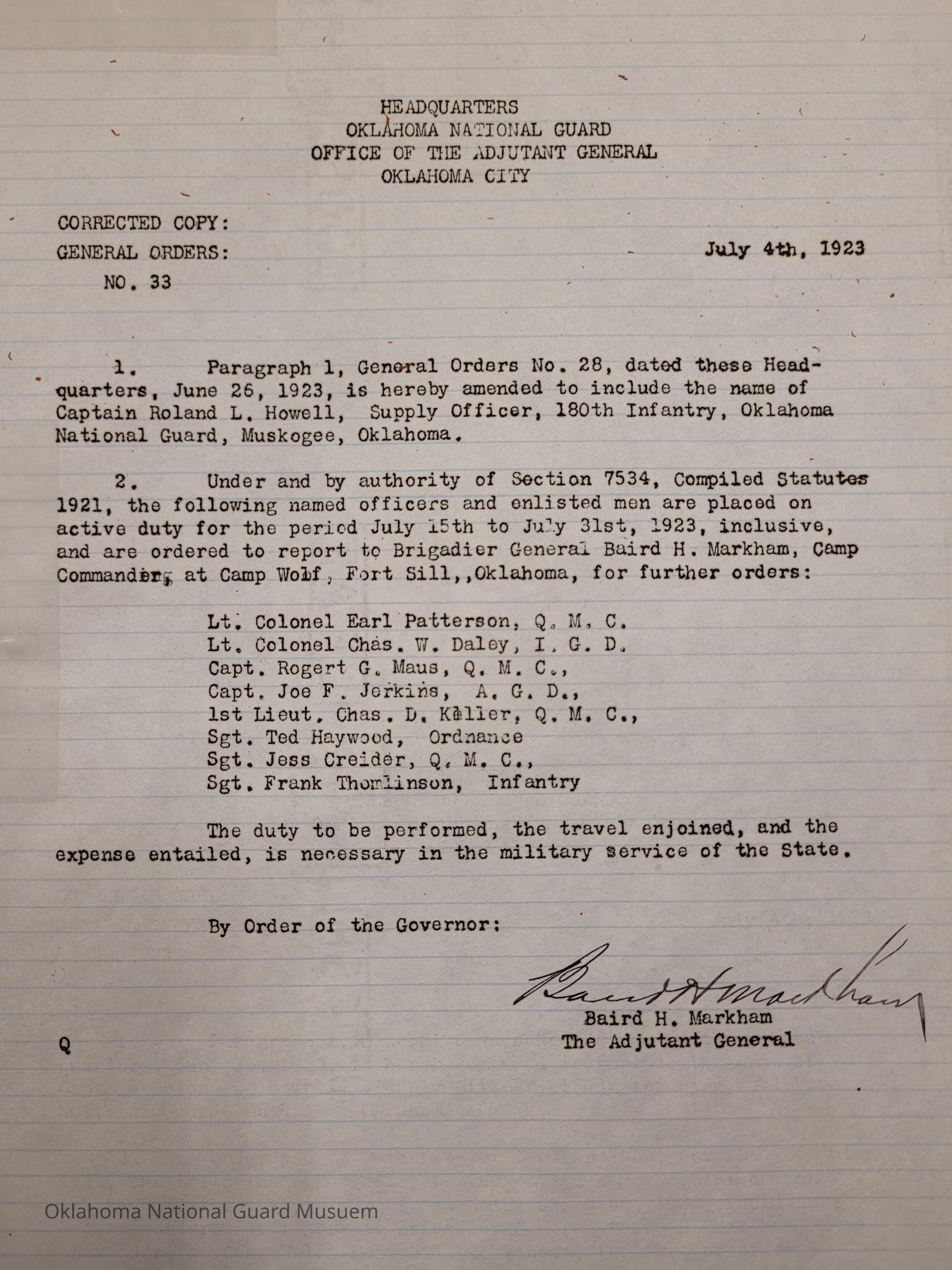 Adjutant General, Oklahoma City, Baird H. Markham, Roland L. Howell, 180th Infantry, Muskogee, Camp Wolf, Fort Sill, Earl Patterson, Charles W. Daley, Rogert G. Maus, Joe F. Jerkins, Charles D. Keller, Ted Haywood, Jess Creider, Frank Thomlinson