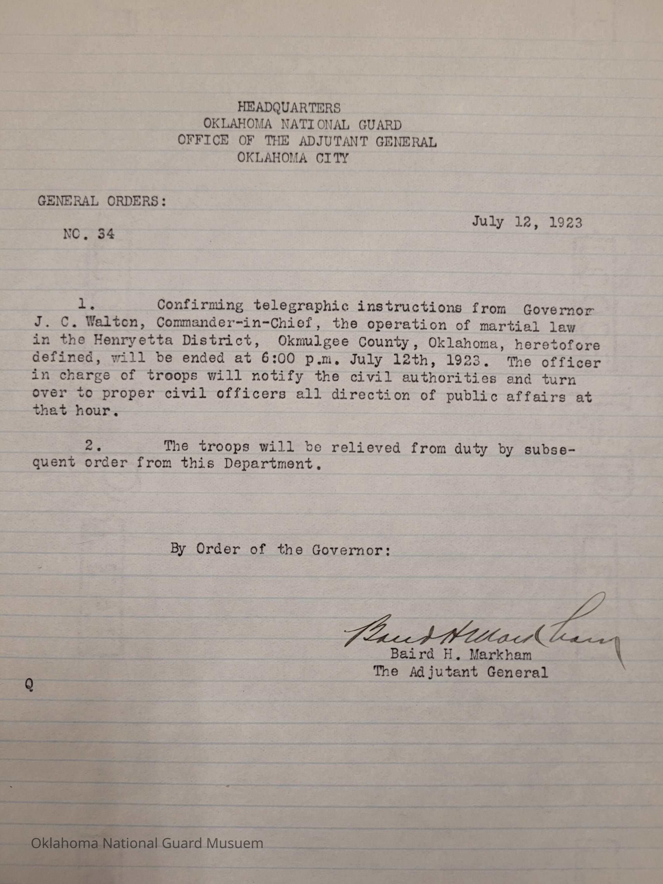 General Order #34 from Headquarters Adjutant General's Office in Oklahoma City. The order ends the martial law order in the Henryetta District of Okmulgee CountryDate(s) of Creation