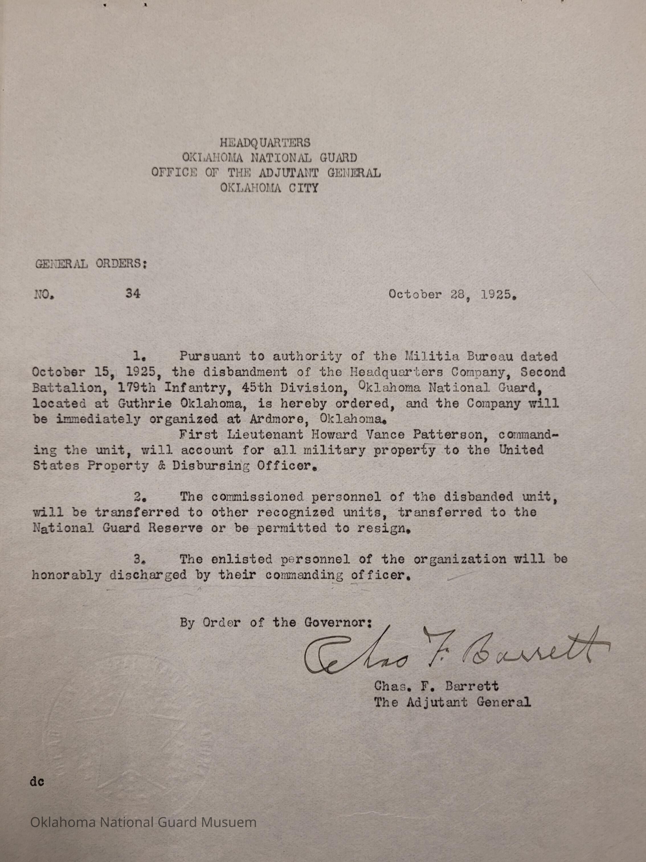 Adjutant General, Oklahoma City, Charles F. Barrett, Militia Bureau, Disband, Headquarters Company, 179th Infantry, 45th Division, Guthrie, Ardmore, Howard Vance Patterson