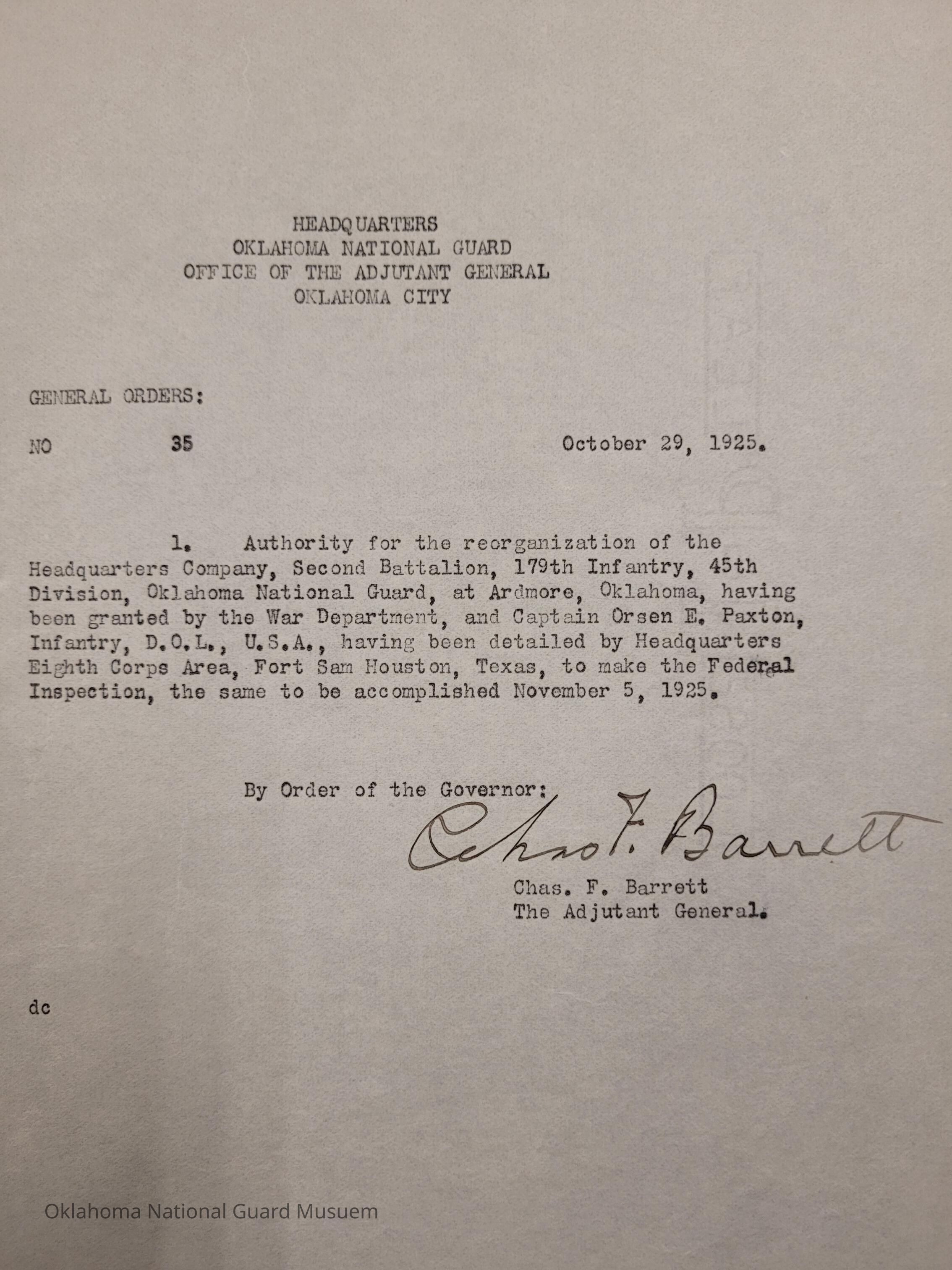 Adjutant General, Oklahoma City, Charles F. Barrett, Headquarters Company, 179th Infantry, 45th Division, Ardmore, Orsen E. Paxton, Inspection, War Department, Fort Sam Houston, Texas, Federal Inspection